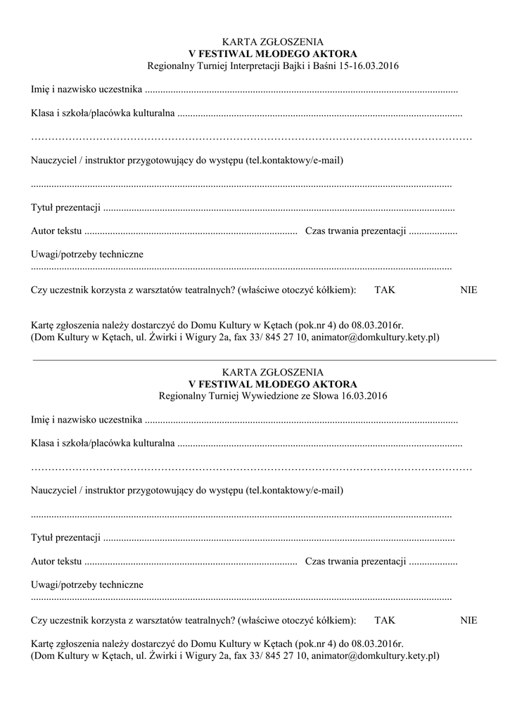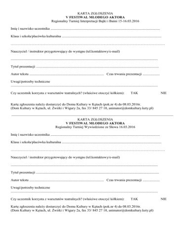 KARTA ZGŁOSZENIA V FESTIWAL MŁODEGO AKTORA Regionalny Turniej Interpretacji Bajki i Baśni 15-16.03.2016 Imię i nazwisko uczestnika .......................................................................................................................... Klasa i szkoła/placówka kulturalna ............................................................................................................... ………………………………………………………………………………………………………………… Nauczyciel / instruktor przygotowujący do występu (tel.kontaktowy/e-mail) .................................................................................................................................................................... Tytuł prezentacji ......................................................................................................................................... Autor tekstu ................................................................................... Czas trwania prezentacji ................... Uwagi/potrzeby techniczne .................................................................................................................................................................... Czy uczestnik korzysta z warsztatów teatralnych? (właściwe otoczyć kółkiem): TAK NIE Kartę zgłoszenia należy dostarczyć do Domu Kultury w Kętach (pok.nr 4) do 08.03.2016r. (Dom Kultury w Kętach, ul. Żwirki i Wigury 2a, fax 33/ 845 27 10, [email protected]) KARTA ZGŁOSZENIA V FESTIWAL MŁODEGO AKTORA Regionalny Turniej Wywiedzione ze Słowa 16.03.2016 Imię i nazwisko uczestnika .......................................................................................................................... Klasa i szkoła/placówka kulturalna ............................................................................................................... ………………………………………………………………………………………………………………… Nauczyciel / instruktor przygotowujący do występu (tel.kontaktowy/e-mail) .................................................................................................................................................................... Tytuł prezentacji ......................................................................................................................................... Autor tekstu ................................................................................... Czas trwania prezentacji ................... Uwagi/potrzeby techniczne .................................................................................................................................................................... Czy uczestnik korzysta z warsztatów teatralnych? (właściwe otoczyć kółkiem): TAK Kartę zgłoszenia należy dostarczyć do Domu Kultury w Kętach (pok.nr 4) do 08.03.2016r. (Dom Kultury w Kętach, ul. Żwirki i Wigury 2a, fax 33/ 845 27 10, [email protected]) NIE