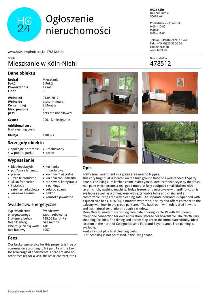 Ogłoszenie nieruchomości HC24 Köln Im Ferkulum 4 50678 Köln Poniedziałek – Czwartek: 9.00 – 17.00 Piątek: 9.00 – 16.00 Telefon: +49 (0)221-93 12 260 Faks: +49 (0)221-32 55 56 [email protected] www.hc24.de www.hc24.de/pl/object_ko-478512.htm Obiekt Numer obiektu Mieszkanie w Köln-Niehl 478512 Dane obiektu Rodzaj Pokój Powierzchnia Floor Mieszkania 2 Pokój 42 m² 0 Wolne od Wolne do Co najmniej Max. persons pets 01.05.2017 bezterminowo 2 Months 2 pets are not allowed Czynsz 900,- €/miesięcznie Additional cost final cleaning costs Kaucja 1 800,- € Szczegóły obiektu spokojne po?o?enie w pobli?u parku umeblowany parter Wyposażenie Dla niepalacych pod?oga z laminatu pralka ??cze telefoniczne ?ó?ko francuskie instalacja satelitarna/kablowa ?azienka z wann? kuchenka mikrofalowa kuchnia mieszkalna kuchnia zabudowana mo?liwo?? korzystania z parkingu sofa do spania balkon komórka piwniczna Świadectwo energetyczne Typ świadectwa energetycznego Sluttenergibehov Nośnik energii Obejmuje ciepłą wodę Rok budowy Świadectwo zapotrzebowania 125,00 kWh/m²a Gaz ziemny Tak 1957 Fees Our brokerage service for this property is free of commission according to § 2 par. 1a of the Law for brokerage of apartments. There are also no other fees (eg for a visit, the lease contract, etc.). Exposição imprimida aos 08.03.2017 Powered by TCPDF (www.tcpdf.org) Opis Pretty small apartment in a green area near to Nippes. This cozy bright flat is located on the high ground floor of a well-tended 12-party house. The living cum kitchen room invites you in Mediterranean style by the fresh wall paint which occurs a real good mood. A fully equipped small kitchen with ceramic hob, washing machine, fridge freezer and microwave with grill function is available as well as a dining area with extendable table and chairs and a comfortable living area with sleeping sofa. The separate bedroom is equipped with a queen size bed (140x200), a modern wardrobe, a study and offers entrance to the balcony with look in the green park area. The bathroom with tub is tiled in white and has natural ventilation through a window. More Details: modern furnishing, laminate flooring, cable TV with flat screen, telephone connection for own application, storage cellar available. The North Park, shopping facilities, fine dining and a tram stop are in the immediate vicinity. Ideal location in the north of Cologne close to Ford and Bayer plants. Free parking is available. Rent all in but plus final cleaning costs. Hint: Smoking is not permitted in the living space.