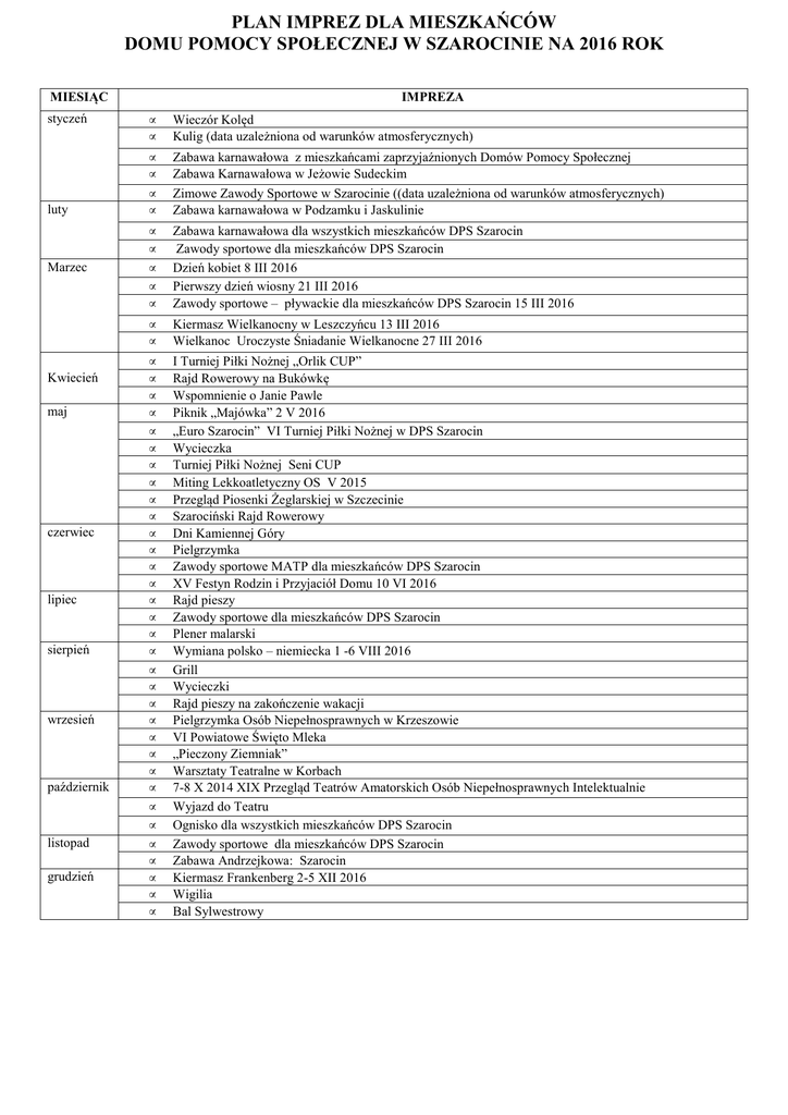 PLAN IMPREZ DLA MIESZKAŃCÓW DOMU POMOCY SPOŁECZNEJ W SZAROCINIE NA 2016 ROK MIESIĄC styczeń luty Marzec Kwiecień maj czerwiec lipiec sierpień wrzesień październik listopad grudzień IMPREZA • • Wieczór Kolęd Kulig (data uzależniona od warunków atmosferycznych) • • • • Zabawa karnawałowa z mieszkańcami zaprzyjaźnionych Domów Pomocy Społecznej Zabawa Karnawałowa w Jeżowie Sudeckim Zimowe Zawody Sportowe w Szarocinie ((data uzależniona od warunków atmosferycznych) Zabawa karnawałowa w Podzamku i Jaskulinie • • • • • Zabawa karnawałowa dla wszystkich mieszkańców DPS Szarocin Zawody sportowe dla mieszkańców DPS Szarocin Dzień kobiet 8 III 2016 Pierwszy dzień wiosny 21 III 2016 Zawody sportowe – pływackie dla mieszkańców DPS Szarocin 15 III 2016 • • Kiermasz Wielkanocny w Leszczyńcu 13 III 2016 Wielkanoc Uroczyste Śniadanie Wielkanocne 27 III 2016 • • • • • • • • • • • • • • • • • • • • • • • • • • • • • • • • • I Turniej Piłki Nożnej „Orlik CUP” Rajd Rowerowy na Bukówkę Wspomnienie o Janie Pawle Piknik „Majówka” 2 V 2016 „Euro Szarocin” VI Turniej Piłki Nożnej w DPS Szarocin Wycieczka Turniej Piłki Nożnej Seni CUP Miting Lekkoatletyczny OS V 2015 Przegląd Piosenki Żeglarskiej w Szczecinie Szarociński Rajd Rowerowy Dni Kamiennej Góry Pielgrzymka Zawody sportowe MATP dla mieszkańców DPS Szarocin XV Festyn Rodzin i Przyjaciół Domu 10 VI 2016 Rajd pieszy Zawody sportowe dla mieszkańców DPS Szarocin Plener malarski Wymiana polsko – niemiecka 1 -6 VIII 2016 Grill Wycieczki Rajd pieszy na zakończenie wakacji Pielgrzymka Osób Niepełnosprawnych w Krzeszowie VI Powiatowe Święto Mleka „Pieczony Ziemniak” Warsztaty Teatralne w Korbach 7-8 X 2014 XIX Przegląd Teatrów Amatorskich Osób Niepełnosprawnych Intelektualnie Wyjazd do Teatru Ognisko dla wszystkich mieszkańców DPS Szarocin Zawody sportowe dla mieszkańców DPS Szarocin Zabawa Andrzejkowa: Szarocin Kiermasz Frankenberg 2-5 XII 2016 Wigilia Bal Sylwestrowy
