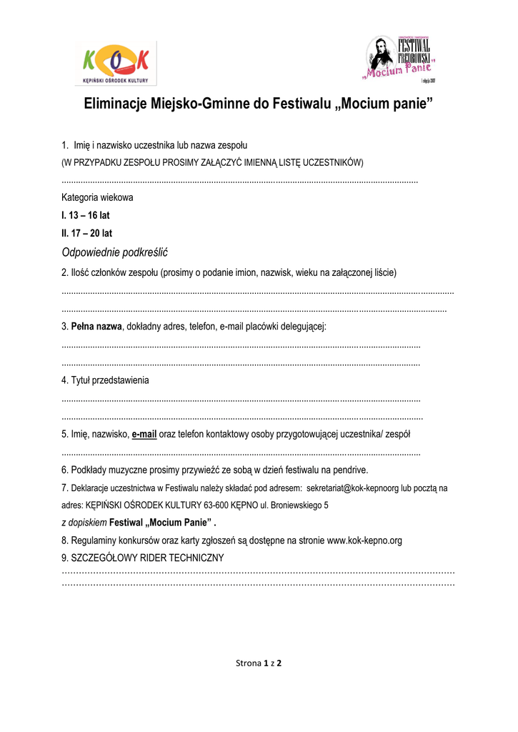 Eliminacje Miejsko-Gminne do Festiwalu „Mocium panie” 1. Imię i nazwisko uczestnika lub nazwa zespołu (W PRZYPADKU ZESPOŁU PROSIMY ZAŁĄCZYĆ IMIENNĄ LISTĘ UCZESTNIKÓW) ...................................................................................................................................................... Kategoria wiekowa I. 13 – 16 lat II. 17 – 20 lat Odpowiednie podkreślić 2. Ilość członków zespołu (prosimy o podanie imion, nazwisk, wieku na załączonej liście) ..................................................................................................................................................................... .................................................................................................................................................................. 3. Pełna nazwa, dokładny adres, telefon, e-mail placówki delegującej: ....................................................................................................................................................... ....................................................................................................................................................... 4. Tytuł przedstawienia ....................................................................................................................................................... ........................................................................................................................................................ 5. Imię, nazwisko, e-mail oraz telefon kontaktowy osoby przygotowującej uczestnika/ zespół ....................................................................................................................................................... 6. Podkłady muzyczne prosimy przywieźć ze sobą w dzień festiwalu na pendrive. 7. Deklaracje uczestnictwa w Festiwalu należy składać pod adresem: sekretariat@kok-kepnoorg lub pocztą na adres: KĘPIŃSKI OŚRODEK KULTURY 63-600 KĘPNO ul. Broniewskiego 5 z dopiskiem Festiwal „Mocium Panie” . 8. Regulaminy konkursów oraz karty zgłoszeń są dostępne na stronie www.kok-kepno.org 9. SZCZEGÓŁOWY RIDER TECHNICZNY ………………………………………………………………………………………………………………………… ………………………………………………………………………………………………………………………… Strona 1 z 2 Strona 2 z 2