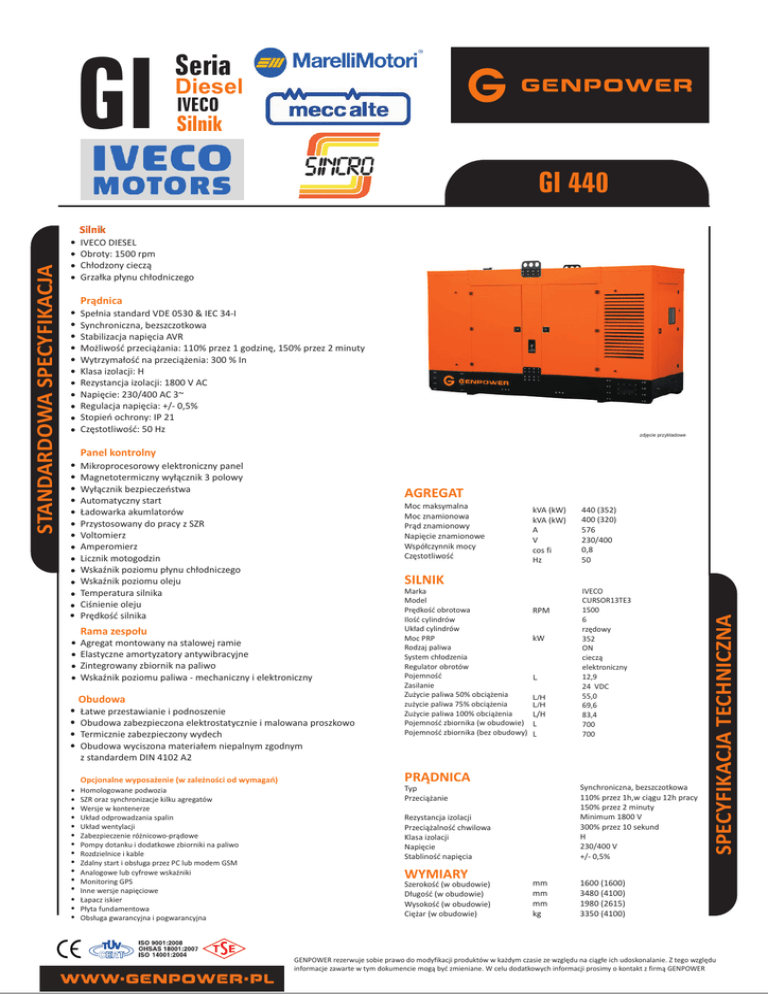 GI Seria Diesel IVECO Silnik GI 440 IVECO DIESEL Obroty: 1500 rpm Ch³odzony ciecz¹ Grza³ka p³ynu ch³odniczego Pr¹dnica Spe³nia standard VDE 0530 & IEC 34-I Synchroniczna, bezszczotkowa Stabilizacja napiêcia AVR Mo¿liwoœæ przeci¹¿ania: 110% przez 1 godzinê, 150% przez 2 minuty Wytrzyma³oœæ na przeci¹¿enia: 300 % In Klasa izolacji: H Rezystancja izolacji: 1800 V AC Napiêcie: 230/400 AC 3~ Regulacja napiêcia: +/- 0,5% Stopieñ ochrony: IP 21 Czêstotliwoœæ: 50 Hz zdjêcie przyk³adowe Panel kontrolny Mikroprocesorowy elektroniczny panel Magnetotermiczny wy³¹cznik 3 polowy Wy³¹cznik bezpieczeñstwa Automatyczny start £adowarka akumlatorów Przystosowany do pracy z SZR Voltomierz Amperomierz Licznik motogodzin WskaŸnik poziomu p³ynu ch³odniczego WskaŸnik poziomu oleju Temperatura silnika Ciœnienie oleju Prêdkoœæ silnika AGREGAT Moc maksymalna Moc znamionowa Pr¹d znamionowy Napiêcie znamionowe Wspó³czynnik mocy Czêstotliwoœæ Agregat montowany na stalowej ramie Elastyczne amortyzatory antywibracyjne Zintegrowany zbiornik na paliwo WskaŸnik poziomu paliwa - mechaniczny i elektroniczny Obudowa £atwe przestawianie i podnoszenie Obudowa zabezpieczona elektrostatycznie i malowana proszkowo Termicznie zabezpieczony wydech Obudowa wyciszona materia³em niepalnym zgodnym z standardem DIN 4102 A2 Homologowane podwozia SZR oraz synchronizacje kilku agregatów Wersje w kontenerze Uk³ad odprowadzania spalin Uk³ad wentylacji Zabezpieczenie ró¿nicowo-pr¹dowe Pompy dotanku i dodatkowe zbiorniki na paliwo Rozdzielnice i kable Zdalny start i obs³uga przez PC lub modem GSM Analogowe lub cyfrowe wskaŸniki Monitoring GPS Inne wersje napiêciowe £apacz iskier P³yta fundamentowa Obs³uga gwarancyjna i pogwarancyjna 440 (352) 400 (320) 576 230/400 0,8 50 SILNIK Rama zespo³u Opcjonalne wyposa¿enie (w zale¿noœci od wymagañ) kVA (kW) kVA (kW) A V cos fi Hz Marka Model Prêdkoœæ obrotowa Iloœæ cylindrów Uk³ad cylindrów Moc PRP Rodzaj paliwa System ch³odzenia Regulator obrotów Pojemnoœæ Zasilanie Zu¿ycie paliwa 50% obci¹¿enia zu¿ycie paliwa 75% obci¹¿enia Zu¿ycie paliwa 100% obci¹¿enia Pojemnoœæ zbiornika (w obudowie) Pojemnoœæ zbiornika (bez obudowy) RPM kW L L/H L/H L/H L L PR¥DNICA Synchroniczna, bezszczotkowa 110% przez 1h,w ci¹gu 12h pracy 150% przez 2 minuty Minimum 1800 V 300% przez 10 sekund H 230/400 V +/- 0,5% Typ Przeci¹¿anie Rezystancja izolacji Przeci¹¿alnoœæ chwilowa Klasa izolacji Napiêcie Stablinoœæ napiêcia WYMIARY Szerokoœæ (w obudowie) D³ugoœæ (w obudowie) Wysokoœæ (w obudowie) Ciê¿ar (w obudowie) IVECO CURSOR13TE3 1500 6 rzêdowy 352 ON ciecz¹ elektroniczny 12,9 24 VDC 55,0 69,6 83,4 700 700 mm mm mm kg SPECYFIKACJA TECHNICZNA STANDARDOWA SPECYFIKACJA Silnik 1600 (1600) 3480 (4100) 1980 (2615) 3350 (4100) GENPOWER rezerwuje sobie prawo do modyfikacji produktów w ka¿dym czasie ze wzglêdu na ci¹g³e ich udoskonalanie. Z tego wzglêdu informacje zawarte w tym dokumencie mog¹ byæ zmieniane. W celu dodatkowych informacji prosimy o kontakt z firm¹ GENPOWER GI Seria Diesel IVECO Silnik GI 440 listwa giêtka linka mm2 giêtka linka mm2 giêtka linka mm2 mm mm mm mm mm m2 m2 mm M12 2x5x185 (<30mb) 7x1,5 (<30mb) 3x2,5 (<30mb) 114,3 159 159 1010 1052 1,33 1,33 1900x4400 15W40 L % mth/rok Antifreeze L mth/rok Ah MOBIL 35 Dane eksploatacyjne Rodzaj oleju Iloœæ oleju w uk³adzie smarowania Zu¿ycie oleju (na 1kW) Okres pomiêdzy wymianami oleju Rodzaj p³ynu ch³odz¹cego (glikolowy) Iloœæ p³ynu ch³odz¹cego Okres pomiêdzy wymianami p³ynu Pojemnoœæ akumulatora rozruchowego Zgodnoœæ paliwa z norm¹ Zu¿ycie paliwa 100% obci¹¿enia Zu¿ycie paliwa 75% obci¹¿enia Zu¿ycie paliwa 50% obci¹¿enia Wymiana filtrów paliwa Wymiana filtrów oleju L/h L/h L/h mth/rok mth/rok Panel steruj¹cy Elastyczny i wielofunkcyjny wyœwietlacz LCD SZR - Samoczynne Za³¹czanie Rezerwy, auto start i stop Ca³kowita ochrona silnika oraz jednostki generatora Wykrywania napiêcia skutecznego Wykrywanie pr¹du/mocy skutecznej Licznik kWh Licznik startów silnika, godzin pracy, konserwacji Dowolnie konfigurowalne wejœcia cyfrowe Dowolnie konfigurowalne wejœcia analogowe Dowolnie konfigurowalne wejœcia przekaŸnikowe Konfiguracja przez panel czo³owy lub PC Obs³uga wielu jêzyków w tym Polski Certyfikat morski GL,LE, zgodnoœæ CE, 500/1 rok PETRYGO 67,0 1000/2 100 EN 590 83,4 69,6 55,0 500/1 500/1 SPECYFIKACJA TECHNICZNA STANDARDOWA SPECYFIKACJA Wytyczne instalacyjne Sposób odbioru mocy Przewody odbioru mocy Przewody automatyki SZR Przewody potrzeb w³asnych Œrednica kolektora wydechu silnika Œrednica wydechu (max 7mb, 4 kol. 90 st.) Œrednica wydechu (max 15mb, 4 kol. 90 st.) Wysokoœæ ch³odnicy Szerokoœæ ch³odnicy Powierzchnia wyrzutni powietrza Powierzchnia czerpni powietrza Wymiary p³yty fundamentowej GENPOWER rezerwuje sobie prawo do modyfikacji produktów w ka¿dym czasie ze wzglêdu na ci¹g³e ich udoskonalanie. Z tego wzglêdu informacje zawarte w tym dokumencie mog¹ byæ zmieniane. W celu dodatkowych informacji prosimy o kontakt z firm¹ GENPOWER
