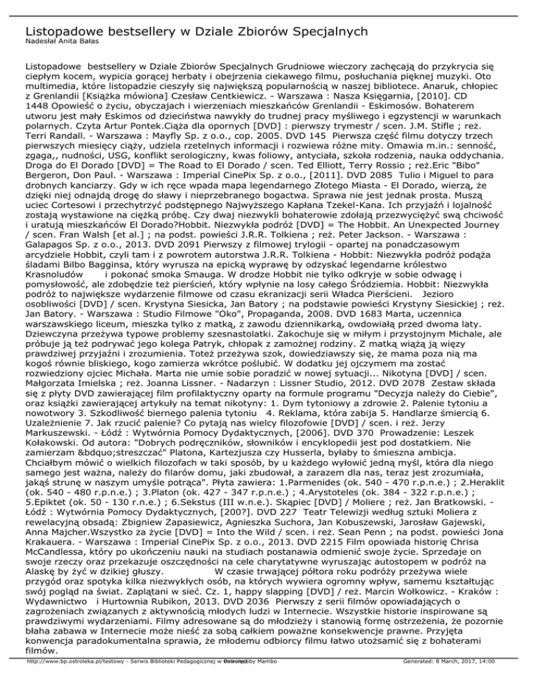 Listopadowe bestsellery w Dziale Zbiorów Specjalnych Nadesłał Anita Bałas Listopadowe bestsellery w Dziale Zbiorów Specjalnych Grudniowe wieczory zachęcają do przykrycia się ciepłym kocem, wypicia gorącej herbaty i obejrzenia ciekawego filmu, posłuchania pięknej muzyki. Oto multimedia, które listopadzie cieszyły się największą popularnością w naszej bibliotece. Anaruk, chłopiec z Grenlandii [Książka mówiona] Czesław Centkiewicz. - Warszawa : Nasza Księgarnia, [2010]. CD 1448 Opowieść o życiu, obyczajach i wierzeniach mieszkańców Grenlandii - Eskimosów. Bohaterem utworu jest mały Eskimos od dzieciństwa nawykły do trudnej pracy myśliwego i egzystencji w warunkach polarnych. Czyta Artur Pontek.Ciąża dla opornych [DVD] : pierwszy trymestr / scen. J.M. Stifle ; reż. Terri Randall. - Warszawa : Mayfly Sp. z o.o., cop. 2005. DVD 145 Pierwsza część filmu dotyczy trzech pierwszych miesięcy ciąży, udziela rzetelnych informacji i rozwiewa różne mity. Omawia m.in.: senność, zgaga,, nudności, USG, konflikt serologiczny, kwas foliowy, antyciała, szkoła rodzenia, nauka oddychania. Droga do El Dorado [DVD] = The Road to El Dorado / scen. Ted Elliott, Terry Rossio ; reż.Eric "Bibo" Bergeron, Don Paul. - Warszawa : Imperial CinePix Sp. z o.o., [2011]. DVD 2085 Tulio i Miguel to para drobnych kanciarzy. Gdy w ich ręce wpada mapa legendarnego Złotego Miasta - El Dorado, wierzą, że dzięki niej odnajdą drogę do sławy i nieprzebranego bogactwa. Sprawa nie jest jednak prosta. Muszą uciec Cortesowi i przechytrzyć podstępnego Najwyższego Kapłana Tzekel-Kana. Ich przyjaźń i lojalność zostają wystawione na ciężką próbę. Czy dwaj niezwykli bohaterowie zdołają przezwyciężyć swą chciwość i uratują mieszkańców El Dorado?Hobbit. Niezwykła podróż [DVD] = The Hobbit. An Unexpected Journey / scen. Fran Walsh [et al.] ; na podst. powieści J.R.R. Tolkiena ; reż. Peter Jackson. - Warszawa : Galapagos Sp. z o.o., 2013. DVD 2091 Pierwszy z filmowej trylogii - opartej na ponadczasowym arcydziele Hobbit, czyli tam i z powrotem autorstwa J.R.R. Tolkiena - Hobbit: Niezwykła podróż podąża śladami Bilbo Bagginsa, który wyrusza na epicką wyprawę by odzyskać legendarne królestwo Krasnoludów i pokonać smoka Smauga. W drodze Hobbit nie tylko odkryje w sobie odwagę i pomysłowość, ale zdobędzie też pierścień, który wpłynie na losy całego Śródziemia. Hobbit: Niezwykła podróż to największe wydarzenie filmowe od czasu ekranizacji serii Władca Pierścieni. Jezioro osobliwości [DVD] / scen. Krystyna Siesicka, Jan Batory ; na podstawie powieści Krystyny Siesickiej ; reż. Jan Batory. - Warszawa : Studio Filmowe "Oko", Propaganda, 2008. DVD 1683 Marta, uczennica warszawskiego liceum, mieszka tylko z matką, z zawodu dziennikarką, owdowiałą przed dwoma laty. Dziewczyna przeżywa typowe problemy szesnastolatki. Zakochuje się w miłym i przystojnym Michale, ale próbuje ją też podrywać jego kolega Patryk, chłopak z zamożnej rodziny. Z matką wiążą ją więzy prawdziwej przyjaźni i zrozumienia. Toteż przeżywa szok, dowiedziawszy się, że mama poza nią ma kogoś równie bliskiego, kogo zamierza wkrótce poślubić. W dodatku jej ojczymem ma zostać rozwiedziony ojciec Michała. Marta nie umie sobie poradzić w nowej sytuacji... Nikotyna [DVD] / scen. Małgorzata Imielska ; reż. Joanna Lissner. - Nadarzyn : Lissner Studio, 2012. DVD 2078 Zestaw składa się z płyty DVD zawierającej film profilaktyczny oparty na formule programu "Decyzja należy do Ciebie", oraz książki zawierającej artykuły na temat nikotyny: 1. Dym tytoniowy a zdrowie 2. Palenie tytoniu a nowotwory 3. Szkodliwość biernego palenia tytoniu 4. Reklama, która zabija 5. Handlarze śmiercią 6. Uzależnienie 7. Jak rzucić palenie? Co pytają nas wielcy filozofowie [DVD] / scen. i reż. Jerzy Markuszewski. - Łódź : Wytwórnia Pomocy Dydaktycznych, [2006]. DVD 370 Prowadzenie: Leszek Kołakowski. Od autora: "Dobrych podręczników, słowników i encyklopedii jest pod dostatkiem. Nie zamierzam „streszczać" Platona, Kartezjusza czy Husserla, byłaby to śmieszna ambicja. Chciałbym mówić o wielkich filozofach w taki sposób, by u każdego wyłowić jedną myśl, która dla niego samego jest ważna, należy do filarów domu, jaki zbudował, a zarazem dla nas, teraz jest zrozumiała, jakąś strunę w naszym umyśle potrąca". Płyta zawiera: 1.Parmenides (ok. 540 - 470 r.p.n.e.) ; 2.Heraklit (ok. 540 - 480 r.p.n.e.) ; 3.Platon (ok. 427 - 347 r.p.n.e.) ; 4.Arystoteles (ok. 384 - 322 r.p.n.e.) ; 5.Epiktet (ok. 50 - 130 r.n.e.) ; 6.Sekstus (III w.n.e.). Skąpiec [DVD] / Moliere ; reż. Jan Bratkowski. Łódź : Wytwórnia Pomocy Dydaktycznych, [200?]. DVD 227 Teatr Telewizji według sztuki Moliera z rewelacyjną obsadą: Zbigniew Zapasiewicz, Agnieszka Suchora, Jan Kobuszewski, Jarosław Gajewski, Anna Majcher.Wszystko za życie [DVD] = Into the Wild / scen. i reż. Sean Penn ; na podst. powieści Jona Krakauera. - Warszawa : Imperial CinePix Sp. z o.o., 2013. DVD 2215 Film opowiada historię Chrisa McCandlessa, który po ukończeniu nauki na studiach postanawia odmienić swoje życie. Sprzedaje on swoje rzeczy oraz przekazuje oszczędności na cele charytatywne wyruszając autostopem w podróż na Alaskę by żyć w dzikiej głuszy. W czasie trwającej półtora roku podróży przeżywa wiele przygód oraz spotyka kilka niezwykłych osób, na których wywiera ogromny wpływ, samemu kształtując swój pogląd na świat. Zaplątani w sieć. Cz. 1, happy slapping [DVD] / reż. Marcin Wołkowicz. - Kraków : Wydawnictwo i Hurtownia Rubikon, 2013. DVD 2036 Pierwszy z serii filmów opowiadających o zagrożeniach związanych z aktywnością młodych ludzi w Internecie. Wszystkie historie inspirowane są prawdziwymi wydarzeniami. Filmy adresowane są do młodzieży i stanowią formę ostrzeżenia, że pozornie błaha zabawa w Internecie może nie