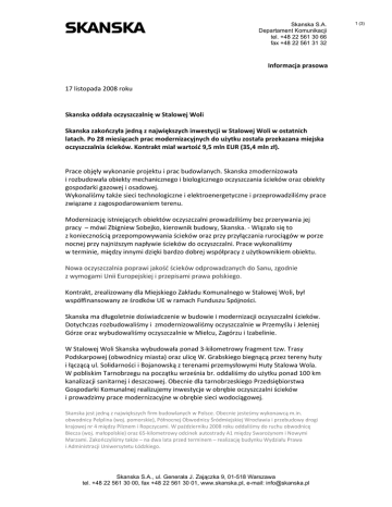 Skanska S.A. Departament Komunikacji tel. +48 22 561 30 66 fax +48 22 561 31 32 Informacja prasowa 17 listopada 2008 roku Skanska oddała oczyszczalnię w Stalowej Woli Skanska zakończyła jedną z największych inwestycji w Stalowej Woli w ostatnich latach. Po 28 miesiącach prac modernizacyjnych do użytku została przekazana miejska oczyszczalnia ścieków. Kontrakt miał wartość 9,5 mln EUR (35,4 mln zł). Prace objęły wykonanie projektu i prac budowlanych. Skanska zmodernizowała i rozbudowała obiekty mechanicznego i biologicznego oczyszczania ścieków oraz obiekty gospodarki gazowej i osadowej. Wykonaliśmy także sieci technologiczne i elektroenergetyczne i przeprowadziliśmy prace związane z zagospodarowaniem terenu. Modernizację istniejących obiektów oczyszczalni prowadziliśmy bez przerywania jej pracy – mówi Zbigniew Sobejko, kierownik budowy, Skanska. ‐ Wiązało się to z koniecznością przepompowywania ścieków oraz przy przyłączania rurociągów w porze nocnej przy najniższym napływie ścieków do oczyszczalni. Prace wykonaliśmy w terminie, między innymi dzięki bardzo dobrej współpracy z użytkownikiem obiektu. Nowa oczyszczalnia poprawi jakość ścieków odprowadzanych do Sanu, zgodnie z wymogami Unii Europejskiej i przepisami prawa polskiego. Kontrakt, zrealizowany dla Miejskiego Zakładu Komunalnego w Stalowej Woli, był współfinansowany ze środków UE w ramach Funduszu Spójności. Skanska ma długoletnie doświadczenie w budowie i modernizacji oczyszczalni ścieków. Dotychczas rozbudowaliśmy i zmodernizowaliśmy oczyszczalnie w Przemyślu i Jeleniej Górze oraz wybudowaliśmy oczyszczalnie w Mielcu, Zagórzu i Izabelinie. W Stalowej Woli Skanska wybudowała ponad 3‐kilometrowy fragment tzw. Trasy Podskarpowej (obwodnicy miasta) oraz ulicę W. Grabskiego biegnącą przez tereny huty i łączącą ul. Solidarności i Bojanowską z terenami przemysłowymi Huty Stalowa Wola. W pobliskim Tarnobrzegu na początku września br. oddaliśmy do użytku ponad 100 km kanalizacji sanitarnej i deszczowej. Obecnie dla tarnobrzeskiego Przedsiębiorstwa Gospodarki Komunalnej realizujemy inwestycje w obrębie oczyszczalni ścieków i prowadzimy prace modernizacyjne w obrębie sieci wodociągowej. Skanska jest jedną z największych firm budowlanych w Polsce. Obecnie jesteśmy wykonawcą m.in. obwodnicy Pelplina (woj. pomorskie), Północnej Obwodnicy Śródmiejskiej Wrocławia i przebudowy drogi krajowej nr 4 między Pilznem i Ropczycami. W październiku 2008 roku oddaliśmy do ruchu obwodnicę Biecza (woj. małopolskie) oraz 65‐kilometrowy odcinek autostrady A1 między Swarożynem i Nowymi Marzami. Zakończyliśmy także – na dwa lata przed terminem – realizację budynku Wydziału Prawa i Administracji Uniwersytetu Łódzkiego. Skanska S.A., ul. Generała J. Zajączka 9, 01-518 Warszawa tel. +48 22 561 30 00, fax +48 22 561 30 01, www.skanska.pl, e-mail: [email protected] 1 (3) Skanska S.A. Departament Komunikacji tel. +48 22 561 30 66 fax +48 22 561 31 32 Rozbudowa i modernizacja oczyszczalni ścieków w Stalowej Woli ‐ najważniejsze informacje Inwestor: Generalny wykonawca: Dyrektor kontraktu: Kierownik budowy: Wartość robót Podpisanie umowy: I czas realizacji: Zlecony zakres prac: Miejski Zakład Komunalny Sp. z o.o. w Stalowej Woli Skanska S.A. Oddział Budownictwa Hydroinżynieryjnego w Rzeszowie Jan Organiściak Zbigniew Sobejko 9 551 818 EUR netto 31.08.2006 28 miesięcy, w tym projekt wrzesień 2006 – marzec 2007, realizacja robót budowlano‐montażowych 13 marzec 2007 – 14 listopad 2008 Obiekty nowo budowane: ‐ reaktory biologiczne ‐ stacja dmuchaw ‐ komora denitryfikacji osadu ‐ instalacja dozowania NaOH ‐ zagęszczacze grawitacyjne osadu wstępnego wraz z biofiltrem ‐ pompownia osadu zagęszczonego ‐ koryto pomiarowe ścieków oczyszczonych ‐ instalacja dozowania metanolu ‐ instalacja dozowania koagulantu ‐ sieci technologiczne międzyobiektowe ‐ sieć cieplna ‐ sieć wodociągowa ‐ sieć kanalizacyjna na terenie oczyszczalni ‐ instalacja (zbiornik biogazu, pochodnia i odsiarczalnia biogazu) i sieć biogazu ‐ system AKPiA ‐ linie i instalacje elektryczne na terenie oczyszczalni ‐ zagospodarowanie terenu Obiekty modernizowane: ‐ komora zasuw z przelewem burzowym ‐ budynek krat ‐ stacja zlewcza ścieków dowożonych ‐ piaskownik ‐ osadniki wstępne ‐ pompownia ścieków i osadu surowego ‐ osadniki wtórne ‐ Wstępne Komory Fermentacji (2) ‐ budynek operacyjny WKFz Skanska S.A., ul. Generała J. Zajączka 9, 01-518 Warszawa tel. +48 22 561 30 00, fax +48 22 561 30 01, www.skanska.pl, e-mail: [email protected] 2 (3) Skanska S.A. Departament Komunikacji tel. +48 22 561 30 66 fax +48 22 561 31 32 Lokalizacja: ‐ zagęszczacze osadu przefermentowanego ‐ budynek stacji odwadniania osadu ‐ składowisko osadu ‐ budynek administracyjny ‐ koryto pomiarowe ścieków surowych ‐ komory osadu czynnego ‐ roboty rozbiórkowe Stalowa Wola, ul. Działkowa Dalszych informacji udziela: Joanna Lubera ‐ Kosior Specjalista ds. Komunikacji, Skanska S.A. 36‐060 Głogów Małopolski, Rudna Mała 47, tel. + 48 17 858 00 96 faks + 48 17 858 01 48, kom. + 48 502 747 257 [email protected] http://www.skanska.pl Skanska S.A., ul. Generała J. Zajączka 9, 01-518 Warszawa tel. +48 22 561 30 00, fax +48 22 561 30 01, www.skanska.pl, e-mail: [email protected] 3 (3)