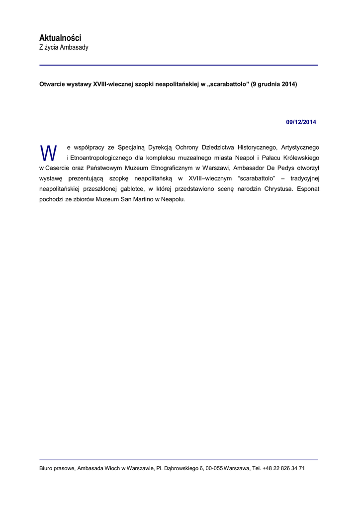 Aktualności Z życia Ambasady Otwarcie wystawy XVIII-wiecznej szopki neapolitańskiej w „scarabattolo” (9 grudnia 2014) 09/12/2014 W e współpracy ze Specjalną Dyrekcją Ochrony Dziedzictwa Historycznego, Artystycznego i Etnoantropologicznego dla kompleksu muzealnego miasta Neapol i Pałacu Królewskiego w Casercie oraz Państwowym Muzeum Etnograficznym w Warszawi, Ambasador De Pedys otworzył wystawę prezentującą szopkę neapolitańską w XVIII–wiecznym “scarabattolo” – tradycyjnej neapolitańskiej przeszklonej gablotce, w której przedstawiono scenę narodzin Chrystusa. Esponat pochodzi ze zbiorów Muzeum San Martino w Neapolu. Biuro prasowe, Ambasada Włoch w Warszawie, Pl. Dąbrowskiego 6, 00-055 Warszawa, Tel. +48 22 826 34 71 Biuro prasowe, Ambasada Włoch w Warszawie, Pl. Dąbrowskiego 6, 00-055 Warszawa, Tel. +48 22 826 34 71