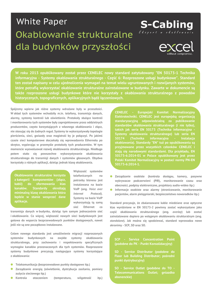 White Paper Okablowanie strukturalne dla budynków przyszłości S-Cabling E k sp ert w o k a b l ow a n i u W roku 2013 opublikowany został przez CENELEC nowy standard zatytułowany "EN 50173-1 Technika informacyjna - Systemy okablowania strukturalnego - Część 6: Rozproszone usługi budynkowe". Standard ten został napisany w celu ujednolicenia wymagań na temat wielu ugruntowanych i rozwijanych systemów, które potrafią wykorzystać okablowanie strukturalne zainstalowane w budynku. Zawarte w dokumencie są także rozproszone usługi budynkowe które nie korzystały z okablowania strukturalnego z powodów historycznych, topograficznych, aplikacyjnych bądź łączeniowych. Spójrzmy wpierw jak różne systemy wdrażane były w przeszłości. W skład tych systemów wchodziły m.in. telefony, transmisja danych, alarmy, systemy kontroli lub oświetlenie. Protokoły służące kontroli i monitorowaniu tych systemów były zaprojektowane przez oddzielnych producentów, często korzystających z własnego okablowania i złącz, nie stosując się do żadnych reguł. Systemy te wykorzystywały topologie pierścienia, sieci, gwiazdy oraz magistrali by je połączyć. Po jakimś czasie sieci komputerowe doczekały się wprowadzenia Ethernetu po skrętce, wypierając w przemyśle protokoły tych producentów. W tym momencie wyewoluował rozwój okablowania strukturalnego. Niedługo potem stało się powszechne wykorzystywanie okablowania strukturalnego do transmisji danych i systemów głosowych. Obydwa korzystały z różnych aplikacji, dzieląc jednak klasę okablowania. Większość systemów telefonicznych na potrzeby biznesu jest instalowana na bazie VoIP (ang. Voice over Internet Protocol). Systemy na bazie VoIP wykorzystują tą samą sieć Ethernet co transmisja danych w budynku, dzieląc tym samym jednocześnie sieć i okablowanie. Co więcej, większość nowych sieci budynkowych jest gotowa do wsparcia bezprzewodowych punktów dostępowych, nawet jeśli nie są one początkowo instalowane. Okablowanie strukturalne korzysta z kategorii komponentów (złącz, kabli) do sformowania klas kanałów. Standardy określają minimalną klasę okablowania która będzie w stanie wesprzeć dane aplikacje. Celem nowego standardu jest umożliwienie migracji rozproszonych systemów budynkowych na zwykłe systemy okablowania strukturalnego, przy zachowaniu i respektowaniu specyficznych wymogów kanałów przeznaczonych dla tych systemów. Rozproszone systemy budynkowe precyzują następujące systemy korzystające z okablowania: Telekomunikacja (bezprzewodowe punkty dostępowe itp.) Zarządzanie energią (oświetlenie, dystrybucja zasilania, pomiary zużycia sieciowego itp.) Kontrola otoczeniem (temperatura, wilgotność itp.) CENELEC - Europejski Komitet Normalizacyjny Elektrotechniki. CENELEC jest europejską organizacją standaryzacyjną odpowiedzialną za publikowanie standardów okablowania strukturalnego (i nie tylko), takich jak seria EN 50173 (Technika informacyjna Systemy okablowania strukturalnego) lub seria EN 50174 (Technika informacyjna Instalacja okablowania). Standardy "EN" tuż po opublikowaniu są przyjmowane przez wszystkich członków CENELEC i stają się narodowymi standardami. Dla przykładu, EN 50173-6:2014-01 w Polsce opublikowany jest przez Polski Komitet Normalizacyjny w postaci normy PN-EN 50173-6:2014-1. Zarządzanie osobiste (kontrola dostępu, kamery, pasywne wykrywacze podczerwieni (PIR), monitorowanie czasu oraz obecności, podpisy elektroniczne, projektory audio-wideo itp.) Informacje osobiste oraz alarmy (stronicowanie, monitorowanie pacjentów, alarm pielęgniarski, bezpieczeństwo noworodków itp.) Standard precyzuje, że zbalansowane kable miedziane oraz optyczne klas wyróżnione w EN 50173-2 powinny zostać wykorzystane jako część okablowania strukturalnego (ang. overlay) lub zostać zainstalowane dopiero po wstępnym okablowaniu strukturalnym (ang. standalone). Jak można się spodziewać, standard wprowadza nowe akronimy - SCP, SD oraz SO. SCP - Service Concentration Point (podobne do PK - Punkt Konsolidacyjny) SD - Service Distributor (podobne do Floor lub Building Distributor; pośredni punkt dystrybucyjny) SO - Service Outlet (podobne do TO Telecommunications Outlet; gniazdko abonenckie) Okablowanie dla rozproszonych systemów budynkowych jest podzielone na dwa typy wdrażania. Typ A: Okablowanie strukturalne do SO Tak jak pokazano powyżej, ten typ wdrażania używa tych samych modeli kanałowych co zwykłe okablowanie strukturalne. Schemat pokazuje, że TE (Terminal Equipment - urządzenie końcowe) może zostać podłączone na różne sposoby. Na przykład posiadając SO jako gniazdko z kablem przyłączeniowym od urządzenia, bezpośrednio wpinając kabel przyłączeniowy od urządzenia do okablowania lub podpinając urządzenie końcowe bezpośrednio do okablowania. Typ B: Okablowanie strukturalne do SCP Ten typ wdrażania wykorzystuje okablowanie strukturalne podłączone do SCP. Następnie okablowanie jest dobierane dla potrzeb instalowanego systemu. W punkcie SCP znajduje się urządzenie koncentrujące sieci w celu umożliwienia wsparcia różnych wdrażanych topologii. Różni się to od innych systemów okablowania strukturalnego wdrożeniem aktywnych urządzeń sieciowych w poziomym kanale. Takie coś nie ma miejsca w Punkcie Konsolidacyjnym. Różne rozproszone usługi budynkowe korzystają z różnych topologii pokazanych na powyższym rysunku drzewa, gwiazdy, magistrali lub pętli. Reguły dla odległości pomiędzy poszczególnymi sekcjami kanału są zgodne z resztą normy EN 50173 - maksymalna odległość dla kanału poziomego (SD do SO) nie powinna przekraczać 100m (dla kanału miedzianego). Poniżej znajdują się cztery możliwe modele: Kolejnym wymiarem który należy wziąć pod uwagę jeśli SCP jest wykorzystywany, to minimalna długość kabla pomiędzy SD a SO która powinna być równa 15m. SCP powinny być ulokowane