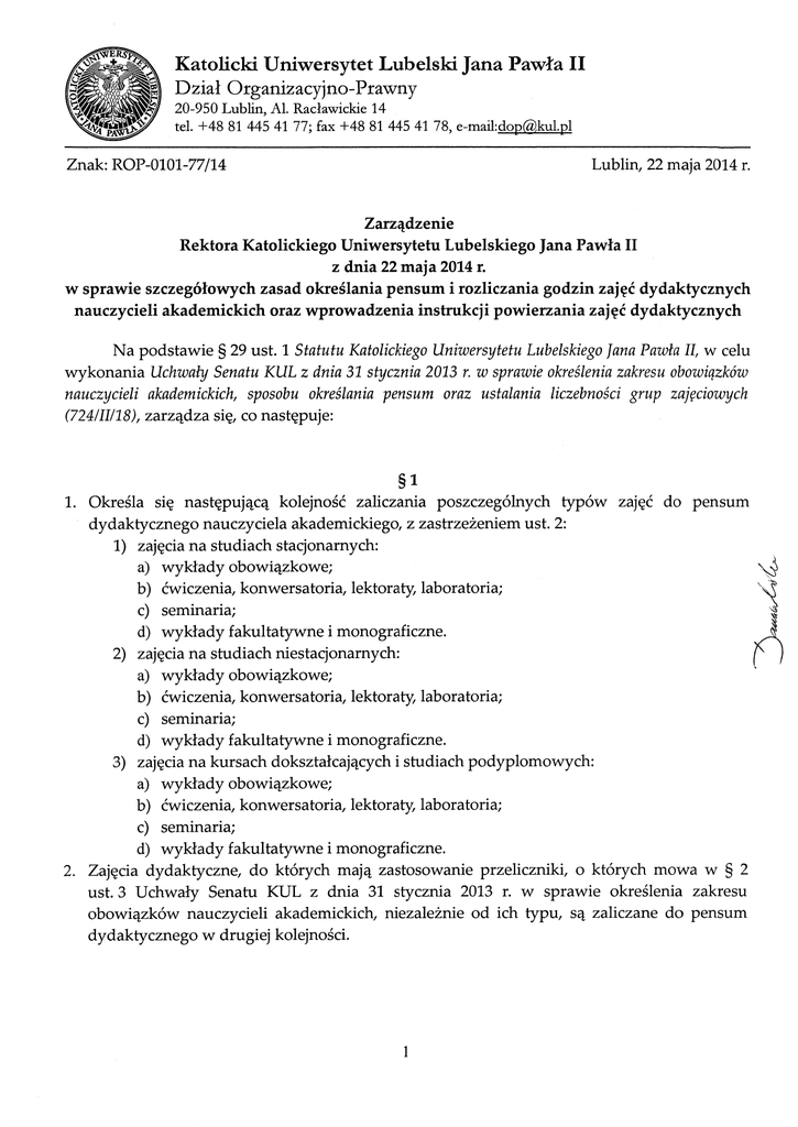 ./ *°X\\ / *Í "Š :'§t \"/ Q*//ŰÍ Katolicki Uniwersytet Lubelski Jana Pawła II Dział Organizacyjno-Prawny 20-950 Lublin, Al. Racławickie 14 tel. +48 81 445 41 77; fax +48 81 445 41 78, e-mail:[email protected] Znak: ROP-0101~77/14 Lublin, 22 maja 2014 r. Zarządzenie Rektora Katolickiego Uniwersytetu Lubelskiego Jana Pawła II z dnia 22 maja 2014 r. w sprawie szczegółowych zasad określania pensum i rozliczania godzin zajęć dydaktycznych nauczycieli akademickich oraz wprowadzenia instrukcji powierzania zajęć dydaktycznych Na podstawie § 29 ust. 1 Statutu Katolickiego Uniwersytetu Lubelskiego [ana Pawła II, W celu wykonania Uchwały Senatu KLIL z dnia 31 stycznia 2013 r. w sprawie określenia zakresu obowiązków nauczycieli akademickich, sposobu określania pensum oraz ustalania liczebności grup zajeciowych (724/11/1 8), zarządza się, co następuje: §1 1. Określa się następującą kolejność zaliczania poszczególnych typów zajęć do pensum dydaktycznego nauczyciela akademickiego, z zastrzeżeniem ust. 2: 1) zajęcia na studiach stacjonarnych: a) wykłady obowiązkowe; b) ćwiczenia, konwersatoria, lektoraty, laboratoria; c) seminaria; d) wyl<łady fakultatywne i monograficzne. 2) zajęcia na studiach niestacjonarnych: a) wykłady obowiązkowe; b) ćwiczenia, konwersatoria, lektoraty, laboratoria; c) seminaria; d) wykłady fakultatywne i monograficzne. 3) zajęcia na kursach dokształcających i studiach podyplomowych: a) wykłady obowiązkowe; b) ćwiczenia, konwersatoria, lektoraty, laboratoria; c) seminaria; d) wykłady fakultatywne i monograficzne. 2. Zajęcia dydaktyczne, do których mają zastosowanie przeliczniki, o których mowa w § 2 ust. 3 Uchwały Senatu KUL z dnia 31 stycznia 2013 r. W sprawie określenia zakresu obowiązków nauczycieli akademickich, niezależnie od ich typu, są zaliczane do pensum dydaktycznego w drugiej kolejności. 1 _Ä §2 1. Dziekan zobowiązany jest ostatecznie powierzyć zajęcia dydaktyczne nauczycielom akademickim W terminie nie późniejszym niż 7 dni od momentu zakończeniu procesu kodowania na zajęcia w danym semestrze. 2. Przy każdej korekcie powierzeń zajęć dydaktycznych należy je zaliczyć do pensum dydaktycznego nauczyciela akademickiego zgodnie z zasadami określonymi w § 1. §3 Wprowadza się Instrukcje powierzania zajęć dydaktycznych na Wydziałach, stanowiącą załącznik do niniejszego zarządzenia. §4 Zarządzenie wchodzi W życie z dniem podpisania. Katoi1 1 1;' ni .Í ytehi R ube 9' å\ dr 2 awłaH\ ab. Antoni 'e o g ębiński Instrukcja powierzania zajęć dydaktycznych na Wydziałach §1 1 Ilekroć w niniejszej instrukcji jest mowa o: 1) module dydaktycznym - rozumie się przez to wydzieloną grupę zajęć dydaktycznych z zakresu konkretnej specjalności naukowej lub grupę przedmiotów misyjnych; modułem dydaktycznym może opiekować się koordynator modułu wchodzący w skład komisji programowej; 2) Uniwersytecie - rozumie się przez to Katolicki Uniwersytet Lubelski Iana Pawła II. Wymiar pensum dydaktycznego oraz sposób jego rozliczania szczegółowo określa Uchwała Senatu KUL z dnia 31 stycznia 2013 r. w sprawie określenia zakresu obowiązków nauczycieli akademickich, sposobu określania pensum oraz ustalania liczebności grup zajęciowych (724/II/18), ze zm. Wytyczne W zakresie tworzenia i zmiany programów kształcenia dla studiów pierwszego i drugiego stopnia oraz studiów jednolitych magisterskich, a także zasady powoływania i funkcjonowania komisji programowej określa Uchwała Senatu KUL z dnia 31 stycznia 2013 r. W sprawie określenia wytycznych programowych (724/II/20), ze zm. §2 Projekt obsady personalnej zajęć jest opracowywany na podstawie planu zajęć pozytywnie zaopiniowanego przez Dział Toku Studiów. Rada Instytutu powołuje zespół roboczy dla danego modułu dydaktycznego do przygotowania projektu obsady personalnej. W skład zespołu roboczego wchodzą: 1) Dyrektor Instytutu lub Zastępca Dyrektora Instytutu; 2) kierownicy katedr (bądź osoby przez nich wyznaczone), których pracownicy mają odpowiednie kompetencje merytoryczne, by prowadzić zajęcia w ramach modułu dydaktycznego; 3) koordynatorzy modułów dydaktycznych, o ile tacy zostali powołani przez Radę Instytutu; 4) w przypadku specjalizacji: kierownicy specjalizacji. 1 ';.i . .z/.z 4. Zespoły robocze sporządzają protokoły z prowadzonych prac i załączają do niego przyjęty większością głosów projekt obsady personalnej zajęć dydaktycznych. W przypadku równowagi głosów decydujący jest głos Dyrektora Instytutu. 5. Protokół musi zawierać szczegółowe uzasadnienie decyzji w przypadku nie powierzenia lub powierzenia w zmniejszonym zakresie zajęć danemu nauczycielowi akademickiemu. 6. Dyrektor Instytutu koordynuje propozycje obsady personalnej zajęć dydaktycznych, by w Instytucie nie występowały niedobory dydaktyczne, przekroczenia dopuszczalnych limitów godzin ponadwymiarowych lub inne nieprawidłowości w realizacji procesu dydaktycznego. 7. Dyrektor Instytutu przedstawia projekt obsady personalnej do zatwierdzenia w głosowaniu tajnym Radzie Instytutu, a następnie przekazuje go Dziekanowi Wydziału w terminie do 30 kwietnia roku poprzedzającego rok akademicki, na który powierzane są zajęcia. 8. Powierzenia zajęć dydaktycznych dokonuje Dziekan Wydziału na podstawie projektu obsady personalnej zajęć dydaktycznych przedstawionego przez Dyrektora Instytutu. Dziekan nie jest związany projektem przedstawionym przez Dyrektora Instytutu. 9. Dziekan Wydziału jest odpowiedzialny za taki przydział zajęć, by w jednostce nie występowały niedobory dydaktyczne, przekroczenia dopuszczalnych limitów godzin ponadwymiarowych lub inne nieprawidłowości w realizacji procesu dydaktycznego. §3 Nauczyciele akademiccy zatrudnieni w Instytucie są zobowiązani do pisemnego poinformowania Dyrektora Instytutu o planowanych urlopach oraz zajęciach dydaktycznych prowadzonych