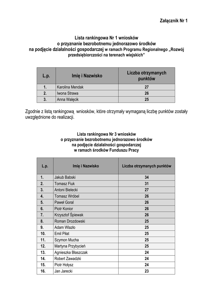 Załącznik Nr 1 Lista rankingowa Nr 1 wniosków o przyznanie bezrobotnemu jednorazowo środków na podjęcie działalności gospodarczej w ramach Programu Regionalnego „Rozwój przedsiębiorczości na terenach wiejskich” L.p. 1. 2. 3. Imię i Nazwisko Karolina Mendak Iwona Strawa Anna Walęcik Liczba otrzymanych punktów 27 26 25 Zgodnie z listą rankingową wniosków, które otrzymały wymaganą liczbę punktów zostały uwzględnione do realizacji. Lista rankingowa Nr 3 wniosków o przyznanie bezrobotnemu jednorazowo środków na podjęcie działalności gospodarczej w ramach środków Funduszu Pracy L.p. 1. 2. 3. 4. 5. 6. 7. 8. 9. 10. 11. 12. 13. 14. 15. 16. Imię i Nazwisko Jakub Babski Tomasz Fiuk Antoni Bielecki Tomasz Wróbel Paweł Goral Piotr Konior Krzysztof Śpiewak Roman Drozdowski Adam Wlazło Emil Piłat Szymon Mucha Martyna Przybycień Agnieszka Błaszczak Robert Zawadzki Piotr Hołysz Jan Jarecki Liczba otrzymanych punktów 34 31 27 26 26 26 26 25 25 25 25 25 24 24 24 23 17. 18. 19. 20. 21. 22. 23. Marek Mroczkowski Agnieszka Mańko Agata Wdowiak Anna Zagozdon Adrian Wdowiak Łukasz Nieć Lidia Gryma 23 22 22 21 21 20 20 Zgodnie z listą rankingową 8 wniosków, które otrzymały najwyższą liczbę punktów zostały uwzględnione do realizacji. Lista rezerwowa Wniosków o przyznanie bezrobotnemu jednorazowo środków na podjęcie działalności gospodarczej w ramach środków Funduszu Pracy L.p. Imię i Nazwisko 1. 2. 3. 4. Adam Wlazło Emil Piłat Szymon Mucha Martyna Przybycień Liczba otrzymanych punktów 25 25 25 25 W sytuacji rezygnacji osoby, której przyznano dofinansowanie, lub pozyskania dodatkowych środków finansowych przez Powiatowy Urząd Pracy w Opolu Lubelskiem kolejne osoby z listy rezerwowej otrzymają dofinansowanie. Lista rankingowa Nr 2 wniosków o przyznanie bezrobotnemu jednorazowo środków na podjęcie działalności gospodarczej w ramach środków POWER L.p. 1. 2. 3. 4. 5. 6. 7. 8. 9. 10. Imię i Nazwisko Marzena Nowak Grzegorz Świć Dawid Dobosz Dariusz Mokijewski Ireneusz Tupaj Daniel Olszowy Kamil Boczuliński Konrad Czyżewski Marcin Dajos Damian Majak Liczba otrzymanych punktów 34 31 29 29 27 27 27 27 26 26 Zgodnie z listą rankingową 10 wniosków, które otrzymały wymaganą liczbę punktów zostały uwzględnione do realizacji.