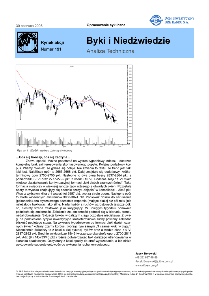 Byki i Niedźwiedzie BRE Bank BRE Bank Securities Opracowanie cykliczne 30 czerwca 2008 Rynek akcji Byki i Niedźwiedzie Numer 191 Analiza Techniczna WIG20 3500 3450 3400 3350 3300 3250 3200 3150 3100 3050 3000 2950 2900 2850 2800 2750 2700 2650 2600 2550 20000 15000 10000 x100 4 21 28 4 11 February 18 25 3 March 10 17 25 31 April 7 14 21 28 5 May 12 19 26 2 June 9 16 23 30 July 7 1 Rys. nr 1 Wig20 - wykres dzienny świecowy …Coś się kończy, coś się zaczyna... Znowu spadki. Można popatrzeć na wykres tygodniowy indeksu i dostrzec kompletny brak zainteresowania skomasowanego popytu. Kolejny podażowy korpus. Wiemy również, że gdzieś się odbije. Nie zmienia to faktu, że trend jest taki jaki jest. Najbliższy opór to 2666-2668 pkt. Dalej znajduje się dodatkowy, krótkoterminowy opór 2750-2755 pkt. Następne to dwa okna bessy 2837-2864 pkt. z poniedziałku 9 VI oraz 2777-2795 pkt. z wtorku 10 VI. Podczas sesji 11 VI miało miejsce ukształtowanie kontynuacyjnej formacji „luki dwóch czarnych świec”. Taka formacja świadczy o większej randze tego niższego z otwartych okien. Pozostałe opory to wysoko znajdujący się obecnie szczyt „objęcia” w konsolidacji - 2948 pkt. Wraz z wyższym kilka dni wcześniej 2957 pkt. tworzą strefę oporu. Następny opór to strefa wiosennych ekstremów 3068-3074 pkt. Ponieważ doszło do naruszenia (pokonania) dna styczniowego pozostałe wsparcia (mające dłużej niż pół roku )nie należałoby traktować jako silne. Nadal każdy z ruchów wzrostowych jeszcze póki co, niestety trzeba traktować jako korygujący. W ubiegłym tygodniu ponownie podniosła się zmienność. Założenie że, zmienność podnosi się w kierunku trendu nadal obowiązuje. Sytuacja byków w dalszym ciągu pozostaje nieciekawa. Z uwagi na podniesione ryzyko inwestycyjne krótkoterminowe ruchy powinny zakładać bliskość podjętego stopa. Na wykresie tygodniowym po formacji „luki dwóch czarnych świec” kolejny czarny korpus, tworząc tym samym „3 czarne kruki w ciągu”. Niezmiennie świadczy to z kolei o złej sytuacji byków oraz o wadze okna z 9 VI 2837-2862 pkt. Średnie wykładnicze 15/45 tworzą szeroką strefę oporu 2700-2817 pkt. Adx (9 i 14)-(33/45 pkt.) rośnie potwierdzając fakt dalszego utrendawiania w kierunku spadkowym. Oscylatory z kolei spadły do stref wyprzedania, a ich niskie usytuowanie sugeruje gotowość do wykonania ruchu korygującego. Jacek Borawski (48 22) 697 48 88 [email protected] www.dibre.com.pl DI BRE Banku S.A. nie ponosi odpowiedzialności za decyzje inwestycyjne podjęte na podstawie niniejszego opracowania, ani za szkody poniesione w wyniku decyzji inwestycyjnych podjętych na podstawie niniejszego opracowania, które nie jest rekomendacją w rozumieniu Rozporządzenia Rady Ministrów z dnia 21 kwietnia 2004 r. w sprawie informacji stanowiących rekomendacje dotyczące instrumentów finansowych lub ich emitentów. Byki i Niedźwiedzie BRE Bank ŚREDNIOTERMINOWY PORTFEL BYKÓW Nazwa spółki Data wydania Cena wydania Cena obecna Zmiana kursu (%) Warunki wyjścia Poziom ind. WIG Zmiana ind. WIG (%) OPUŚCIŁY PORTFEL Nazwa spółki POWÓD OPUSZCZENIA Ponar (+10,29%) TUP (-0,73%) Bankier (+1,57%) Ferrum (-4,09%) HTL Strefa (-7,01%) Mostal War (+8,77%) Żurawie (-3,23%) R.Z Realizacja zysków O.S Ograniczenie strat N.S Niejasna sytuacja ŚREDNIOTERMINOWY PORTFEL NIEDŹWIEDZI Nazwa spółki Data wydania Cena wydania Cena obecna Zmiana kursu (%) Warunki wyjścia Poziom ind. WIG Zmiana ind. WIG (%) OPUŚCIŁY PORTFEL Nazwa spółki POWÓD OPUSZCZENIA Polnord +28,96% PGF +27,57% Polimex +21,13% TVN +21,36% Comarch +23,99 Centrostal +27,62% Dębica +10,22% BZWBK +9,09% CP Energia +29,12% Getin +8,81% R.Z Realizacja zysków O.S Ograniczenie strat N.S Niejasna sytuacja Byki i Niedźwiedzie BRE Bank Podsumowanie portfela Byków i Niedźwiedzi z poprzedniego tygodnia byki Z/Z spółka kurs Z kurs ost. różnica różnica w % AGORA 33,96 34,51 0,55 1,62 BORYSZEW 3,71 3,53 -0,18 -4,85 CERSANIT 20,91 20,49 -0,42 -2,01 ENERGOPLD 2,71 2,57 -0,14 -5,17 JWCONSTR 19,84 18,68 -1,16 -5,85 Średnio -3,25 Z/Z niedźwiedzie spółka kurs kurs ost. różnica różnica w % INGBSK 470,00 424,10 -45,90 -9,77 DROZAPOL 4,13 3,99 -0,14 -3,39 ECHO 4,44 4,13 -0,31 -6,98 GTC 32,60 30,90 -1,70 -5,21 MILLENNIUM 6,86 6,85 -0,01 -0,15 Średnio -5,10