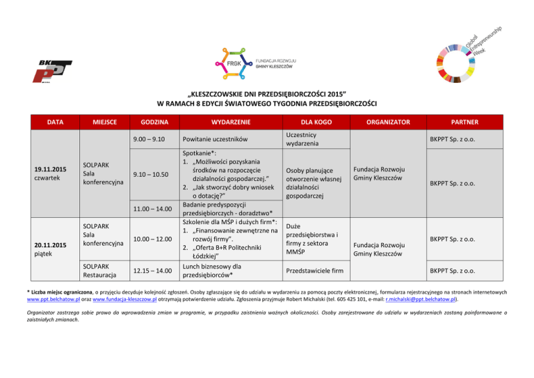 „KLESZCZOWSKIE DNI PRZEDSIĘBIORCZOŚCI 2015” W RAMACH 8 EDYCJI ŚWIATOWEGO TYGODNIA PRZEDSIĘBIORCZOŚCI DATA MIEJSCE GODZINA 9.00 – 9.10 19.11.2015 czwartek SOLPARK Sala konferencyjna 9.10 – 10.50 11.00 – 14.00 20.11.2015 piątek SOLPARK Sala konferencyjna SOLPARK Restauracja 10.00 – 12.00 12.15 – 14.00 WYDARZENIE Powitanie uczestników Spotkanie*: 1. „Możliwości pozyskania środków na rozpoczęcie działalności gospodarczej.” 2. „Jak stworzyć dobry wniosek o dotację?” Badanie predyspozycji przedsiębiorczych - doradztwo* Szkolenie dla MŚP i dużych firm*: 1. „Finansowanie zewnętrzne na rozwój firmy”. 2. „Oferta B+R Politechniki Łódzkiej” Lunch biznesowy dla przedsiębiorców* DLA KOGO ORGANIZATOR Uczestnicy wydarzenia Osoby planujące otworzenie własnej działalności gospodarczej Duże przedsiębiorstwa i firmy z sektora MMŚP Przedstawiciele firm PARTNER BKPPT Sp. z o.o. Fundacja Rozwoju Gminy Kleszczów Fundacja Rozwoju Gminy Kleszczów BKPPT Sp. z o.o. BKPPT Sp. z o.o. BKPPT Sp. z o.o. * Liczba miejsc ograniczona, o przyjęciu decyduje kolejność zgłoszeń. Osoby zgłaszające się do udziału w wydarzeniu za pomocą poczty elektronicznej, formularza rejestracyjnego na stronach internetowych www.ppt.belchatow.pl oraz www.fundacja-kleszczow.pl otrzymają potwierdzenie udziału. Zgłoszenia przyjmuje Robert Michalski (tel. 605 425 101, e-mail: [email protected]). Organizator zastrzega sobie prawo do wprowadzenia zmian w programie, w przypadku zaistnienia ważnych okoliczności. Osoby zarejestrowane do udziału w wydarzeniach zostaną poinformowane o zaistniałych zmianach.