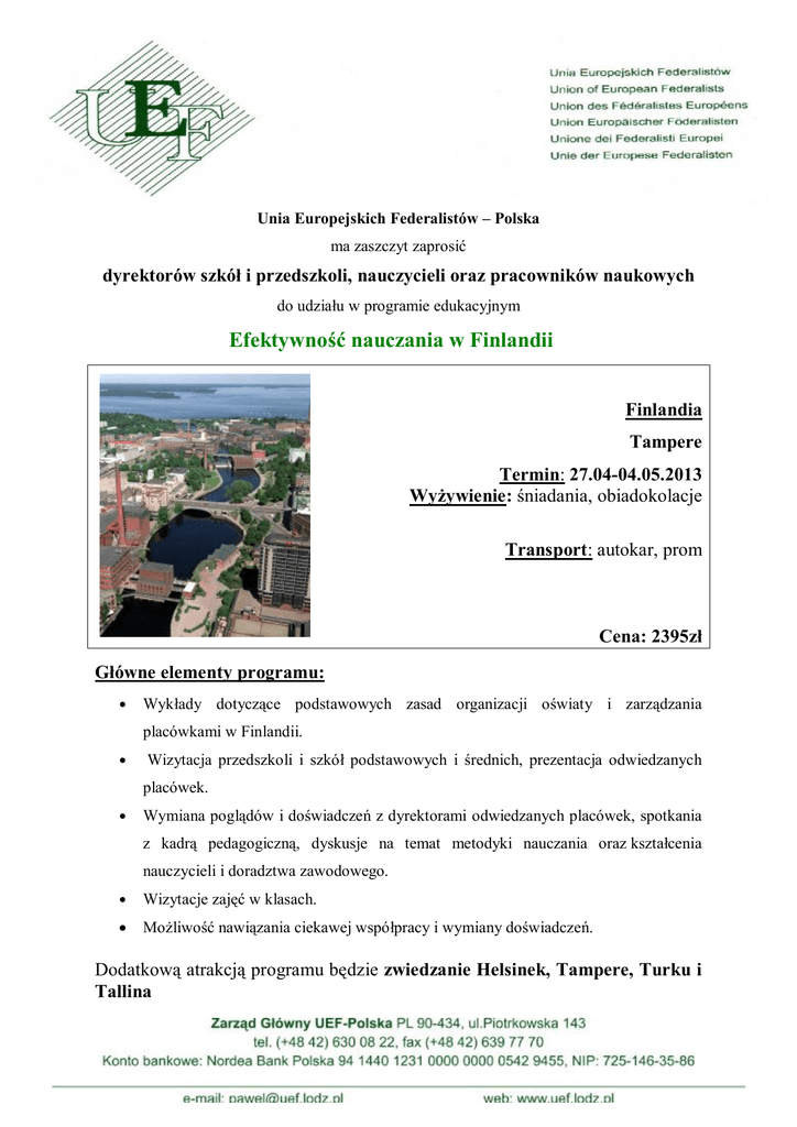 Unia Europejskich Federalistów – Polska ma zaszczyt zaprosić dyrektorów szkół i przedszkoli, nauczycieli oraz pracowników naukowych do udziału w programie edukacyjnym Efektywność nauczania w Finlandii Finlandia Tampere Termin: 27.04-04.05.2013 Wyżywienie: śniadania, obiadokolacje Transport: autokar, prom Cena: 2395zł Główne elementy programu: ● Wykłady dotyczące podstawowych zasad organizacji oświaty i zarządzania placówkami w Finlandii. ● Wizytacja przedszkoli i szkół podstawowych i średnich, prezentacja odwiedzanych placówek. ● Wymiana poglądów i doświadczeń z dyrektorami odwiedzanych placówek, spotkania z kadrą pedagogiczną, dyskusje na temat metodyki nauczania oraz kształcenia nauczycieli i doradztwa zawodowego. ● Wizytacje zajęć w klasach. • Możliwość nawiązania ciekawej współpracy i wymiany doświadczeń. Dodatkową atrakcją programu będzie zwiedzanie Helsinek, Tampere, Turku i Tallina Po zakończeniu programu uczestnicy seminarium otrzymują certyfikaty! Informacje organizacyjne Cena 2395 zł przy 38-40 osobach płacących obejmuje: Przygotowanie programu. Transport autokarem (WC, DVD, barek, klimatyzacja). Zakwaterowanie w hotelu w centrum Tampere, pokoje 2-osobowe z łazienkami, TV, kuchenką mikrofalową, lodówką. Wyżywienie - śniadania i obiadokolacje. Wizytowanie placówek. Ubezpieczenie uczestników wyjazdu. Tłumaczenia wykładów oraz praktyczną pomoc kierownika wyjazdu i tłumacza. Osoby zainteresowane prosimy o kontakt celem przesłania ramowego programu Rezerwacja miejsc Podstawą do rezerwacji miejsca jest przesłanie listem, faksem, telefonicznie lub e-mailem zgłoszenia zawierającego imię, nazwisko, adres, PESEL, telefon kontaktowy, faks/mail oraz adres miejsca pracy wszystkich uczestników wyjazdu. W terminie do 27 stycznia 2013 należy wpłacić zaliczkę w wysokości 1000 zł, a do 27 marca 2013 pozostałą kwotę tzn. 1395 zł. na konto UEF- Polska. Przy wpłatach proszę dopisać: Tampere_27.04-04.05.2013 oraz imię i nazwisko uczestnika Konto UEF: Nordea Bank Polska 94 1440 1231 0000 0000 0542 9455 Serdecznie zapraszamy do udziału w programie! Kierownik programów anglojęzycznych Lidia Solarek e-mail: [email protected] tel. 42/630 08 22 wew. 27 faks: 42/639 77 70