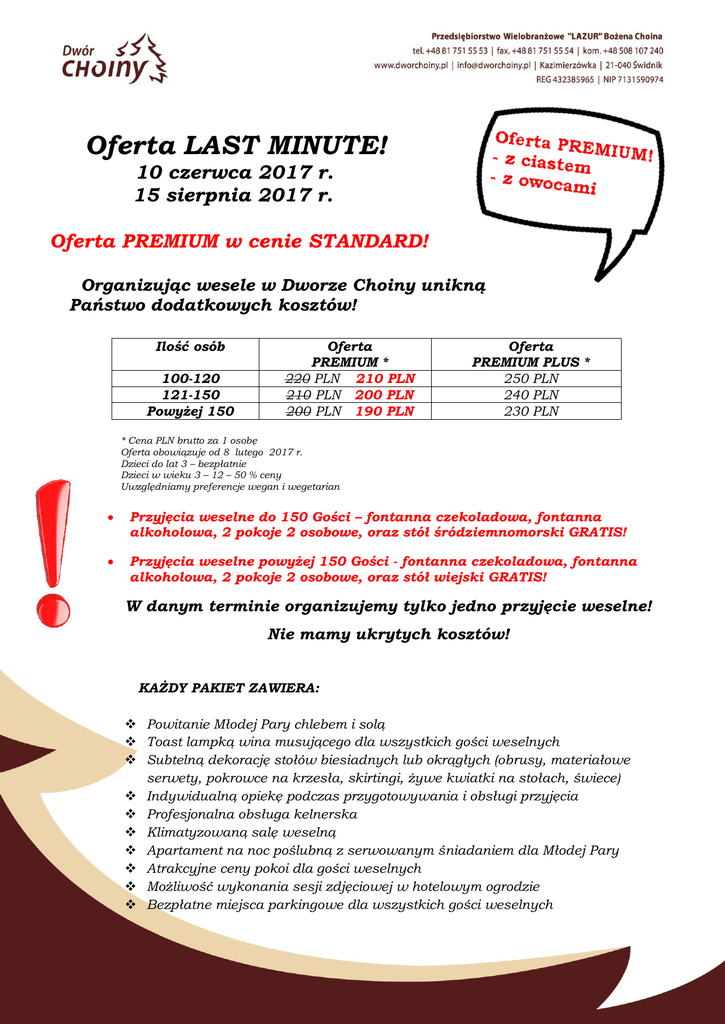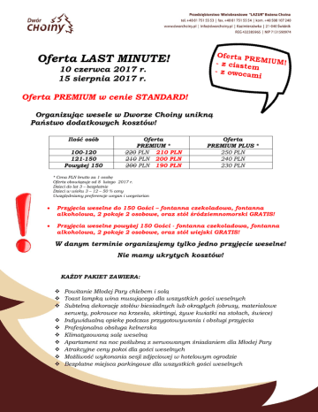 Oferta LAST MINUTE! 10 czerwca 2017 r. 15 sierpnia 2017 r. Oferta PREMIUM w cenie STANDARD! Organizując wesele w Dworze Choiny unikną Państwo dodatkowych kosztów! Ilość osób 100-120 121-150 Powyżej 150 Oferta PREMIUM * 220 PLN 210 PLN 210 PLN 200 PLN 200 PLN 190 PLN Oferta PREMIUM PLUS * 250 PLN 240 PLN 230 PLN * Cena PLN brutto za 1 osobę Oferta obowiązuje od 8 lutego 2017 r. Dzieci do lat 3 – bezpłatnie Dzieci w wieku 3 – 12 – 50 % ceny Uwzględniamy preferencje wegan i wegetarian Przyjęcia weselne do 150 Gości – fontanna czekoladowa, fontanna alkoholowa, 2 pokoje 2 osobowe, oraz stół śródziemnomorski GRATIS! Przyjęcia weselne powyżej 150 Gości - fontanna czekoladowa, fontanna alkoholowa, 2 pokoje 2 osobowe, oraz stół wiejski GRATIS! W danym terminie organizujemy tylko jedno przyjęcie weselne! Nie mamy ukrytych kosztów! KAŻDY PAKIET ZAWIERA: Powitanie Młodej Pary chlebem i solą Toast lampką wina musującego dla wszystkich gości weselnych Subtelną dekorację stołów biesiadnych lub okrągłych (obrusy, materiałowe serwety, pokrowce na krzesła, skirtingi, żywe kwiatki na stołach, świece) Indywidualną opiekę podczas przygotowywania i obsługi przyjęcia Profesjonalna obsługa kelnerska Klimatyzowaną salę weselną Apartament na noc poślubną z serwowanym śniadaniem dla Młodej Pary Atrakcyjne ceny pokoi dla gości weselnych Możliwość wykonania sesji zdjęciowej w hotelowym ogrodzie Bezpłatne miejsca parkingowe dla wszystkich gości weselnych PAKIET PREMIUM: Zupa Danie główne Deser 4 dania gorące 15 rodzajów przekąsek zimnych w tym sałatki – bez limitu Owoce – bez limitu Różnorodne ciasto – bez limitu Napoje gorące (kawy z ekspresu, gorąca czekolada, różnorodne herbaty) – bez limitu Napoje zimne gazowane (Pepsi, Mirinda, 7-up) – bez limitu Soki owocowe (pomarańcza, grapefruit, jabłko) – bez limitu Woda mineralna (gazowana, niegazowana) – bez limitu PAKIET PREMIUM PLUS: Zupa Danie główne Deser 4 dania gorące 15 rodzajów przekąsek zimnych w tym sałatki – bez limitu Owoce – bez limitu Różnorodne ciasto – bez limitu Fontanna czekolady – bez limitu Fontanna ponczu – bez limitu Tort z dekoracją śmietanową, czekoladową lub marcepanową Alkohol na przyjęcie weselne (do wyboru: „Pan Tadeusz”, „Wyborowa”, „Żołądkowa gorzka”, „Stock” lub do ustalenia indywidualnego wg sugestii Młodej Pary) – bez limitu Napoje gorące (kawy z ekspresu, gorąca czekolada, różnorodne herbaty) – bez limitu Napoje zimne gazowane (Pepsi, Mirinda, 7-up) – bez limitu Soki owocowe (pomarańcza, grapefruit, jabłko) – bez limitu Woda mineralna (gazowana, niegazowana) – bez limitu USŁUGI DODATKOWO PŁATNE: Gościńce (6 rodzajów ciasta); cena: 10 PLN / szt. Wiejski stół (udziec wieprzowy pieczony lub indyk faszerowany; szynka wieprzowa, boczek pieczony lub wędzony, kiełbasa, żeberka wędzone, salcesony, pasztet domowy, kaszanka z kaszą gryczaną, smalec domowy, ogórki kiszone, pikle, chrzan, musztarda, chleby i bułki); cena: 100-120 os. – 1200 PLN, 120-200 os. – 1800 PLN Stół rybny (zawiera: ryba faszerowana do wyboru: sum, jesiotr, szczupak, łosoś; rolady rybne: karp, pstrąg; ryba wędzona, surimi, raki, krewetki, tymbaliki rybne, żabnica); cena: do 120 os. 1800 PLN, powyżej 120 osób 2300 PLN Stół śródziemnomorski (oryginalne sery, szynki i wędliny dojrzewające, oliwki, karczochy, voulevanty, koreczki, suszone pomidory, sosy słodkopikantne, winogrona, orzechy) cena: do 50 osób – 650 PLN Stół sushi (cena do uzgodnienia indywidualnego) Kozina pieczona (cena do uzgodnienia indywidualnego) Dzik pieczony (cena do uzgodnienia indywidualnego) Fontanna czekolady (czekolada, owoce, mini ciasteczka) cena: 10 PLN / os. Fontanna alkoholowa; cena: 10 PLN / os. Candy bar; cena 1000 zł Piwo beczkowe 30 l; cena: 300 PLN Piwo beczkowe 50l; cena: 500 PLN Beczka wina domowego 3 l (białe, czerwone); cena: 120 PLN