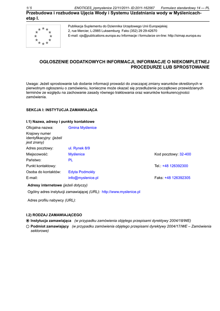 1/ 5 ENOTICES_jrpmyslenice 22/11/2011- ID:2011-162567 Formularz standardowy 14 — PL Przebudowa i rozbudowa Ujęcia Wody i Systemu Uzdatniania wody w Myślenicachetap I. Publikacja Suplementu do Dziennika Urzędowego Unii Europejskiej 2, rue Mercier, L-2985 Luksemburg Faks (352) 29 29-42670 E-mail: [email protected] Informacje i formularze on-line: http://simap.europa.eu OGŁOSZENIE DODATKOWYCH INFORMACJI, INFORMACJE O NIEKOMPLETNEJ PROCEDURZE LUB SPROSTOWANIE Uwaga: Jeżeli sprostowanie lub dodanie informacji prowadzi do znaczącej zmiany warunków określonych w pierwotnym ogłoszeniu o zamówieniu, konieczne może okazać się przedłużenie początkowo przewidzianych terminów ze względu na zachowanie zasady równego traktowania oraz warunków konkurencyjności zamówienia. SEKCJA I: INSTYTUCJA ZAMAWIAJĄCA I.1) Nazwa, adresy i punkty kontaktowe Oficjalna nazwa: Gmina Myślenice Krajowy numer identyfikacyjny: (jeżeli jest znany) _____ Adres pocztowy: ul. Rynek 8/9 Miejscowość: Myślenice Państwo: PL Punkt kontaktowy: _____ Osoba do kontaktów: Edyta Podmokły E-mail: [email protected] Kod pocztowy: 32-400 Tel.: +48 126392300 Faks: +48 126392305 Adresy internetowe (jeżeli dotyczy) Ogólny adres instytucji zamawiającej (URL): http://www.myslenice.pl Adres profilu nabywcy (URL): I.2) RODZAJ ZAMAWIAJĄCEGO Instytucja zamawiająca (w przypadku zamówienia objętego przepisami dyrektywy 2004/18/WE) Podmiot zamawiający (w przypadku zamówienia objętego przepisami dyrektywy 2004/17/WE – Zamówienia sektorowe) 2/ 5 ENOTICES_jrpmyslenice 22/11/2011- ID:2011-162567 Formularz standardowy 14 — PL Przebudowa i rozbudowa Ujęcia Wody i Systemu Uzdatniania wody w Myślenicachetap I. SEKCJA II: PRZEDMIOT ZAMÓWIENIA II.1) OPIS II.1.1) Nazwa nadana zamówieniu przez instytucję zamawiającą (podano w pierwotnym ogłoszeniu) Przebudowa i rozbudowa Ujęcia Wody i Systemu Uzdatniania wody w Myślenicach- etap I. II.1.2) Krôtki opis (podano w pierwotnym ogłoszeniu) 1. Przedmiotem niniejszego zamówienia są roboty budowlane, obejmujące zadanie inwestycyjne pn.: „Przebudowa i rozbudowa ujęcia wody i systemu uzdatniania wody w Myślenicach- etap I”, w skład którego wchodzi: a) przebudowa istniejącej pompowni wody surowej; b) budowa pełnego ogrodzenia terenu wraz z trzema bramami wjazdowymi i furtką; c) budowa dwóch zbiorników wody pitnej o pojemności 2 x 2500 m³; d) budowa hali filtrów wraz z filtrami do wody, koagulacją i dezynfekcją; e) dostawa nowego transformatora i agregatu prądotwórczego; f) rozbudowa budynku pompowni wody uzdatnionej; g) dostawa dwóch nowych agregatów do pompowania wody oraz dostawę lampy UV; h) budowa nowej drogi dojazdowej do budynku o szerokości 5,0 m oraz parkingu; i) budowa nowych studni głębinowych jako alternatywnego źródła zasilania w wodę; j) dostawa i montaż instalacji aparatury kontrolno pomiarowej; k) dostawa minikoparki wraz z lawetą ciężarową dwuosiową (umożliwiającą transport dostarczonej minikoparki) Szczegółowy opis przedmiotu zamówienia zawiera Tom III niniejszej SIWZ - OPZ. 2. Pieczę nad realizacją zamówienia sprawuje Inspektor Nadzoru, który ocenia zgodność realizacji przedsięwzięcia z projektem, kontroluje jakość i ilość robót, opiniuje zasadność wykonania i rozliczenie robót dodatkowych i zamiennych, kontroluje rozliczenie finansowe budowy. 3. Pożądane jest aby przed złożeniem Oferty Wykonawca przeprowadził wizję lokalną terenu budowy, sąsiadującego układu komunikacyjnego oraz najbliższego otoczenia budowy. Termin wizji lokalnej i szczegóły techniczne jej przeprowadzenia wymagają uzgodnienia z Zamawiającym. Koszty dokonania wizji lokalnej terenu budowy poniesie Wykonawca. Dokonanie wizji lokalnej nie jest warunkiem koniecznym do złożenia Oferty w niniejszym postępowaniu. 4. Szczegółowy opis przedmiotu zamówienia przedstawiony został w Tomie III SIWZ- Specyfikacja Techniczna Wykonania i Odbioru Robót Budowlanych, Dokumentacja projektowa oraz Przedmiar robót. 5. Roboty budowlane stanowiące przedmiot niniejszego zamówienia należy wykonać zgodnie z: a) Specyfikacją Techniczną Wykonania i Odbioru Robót Budowlanych (STWiORB), b) dokumentacją projektową c) przedmiarem robót, d) należytą starannością, z zasadami sztuki budowlanej, współczesnej wiedzy technicznej oraz zgodnie z obowiązującymi przepisami i normami polskimi, w szczególności zawartymi w Prawie budowlanym, a w dalszej kolejności normami wspólnymi Unii Europejskiej, zgodnie ze złożoną ofertą, warunkami przetargu oraz zgodnie z ustaleniami poczynionymi z Zamawiającym, z zastrzeżeniem, iż ustalenia te nie mogą wykraczać poza przedmiot umowy oraz nie mogą być sprzeczne z dokumentacją projektową oraz zasadami wiedzy technicznej lub sztuką budowlaną. II.1.3) Wspólny Słownik Zamówień (CPV) (podano w pierwotnym ogłoszeniu) Słownik główny Główny przedmiot 45252126 Dodatkowe przedmioty 34928310 45310000 45233140 45223300 45255110 45111200 Słownik uzupełniający (jeżeli dotyczy) 3/ 5 ENOTICES_jrpmyslenice 22/11/2011- ID:2011-162567 Formularz standardowy 14 — PL Przebudowa i rozbudowa Ujęcia Wody i Systemu Uzdatniania wody w Myślenicachetap I. SEKCJA IV: PROCEDURA IV.1) RODZAJ PROCEDURY IV.1.1) Rodzaj procedury (podano w pierwotnym ogłoszeniu) Otwarta Ograniczona Ograniczona przyspieszona Negocjacyjna Negocjacyjna przyspieszona Dialog konkurencyjny IV.2) INFORMACJE ADMINISTRACYJNE IV.2.1) Numer referencyjny nadany sprawie przez instytucję zamawiającą /podmiot zamawiający (podano w pierwotnym ogłoszeniu, o ile dotyczy) JRP.272.08.2011 IV.2.2) Dane referencyjne ogłoszenia w przypadku ogłoszeń przesłanych drogą elektroniczną (jeżeli są znane): Pierwotne ogłoszenie przesłane przez: SIMAP OJS eSender Login: ENOTICES_jrpmyslenice Dane referencyjne ogłoszenia: 2011-160344 (rok i numer dokumentu) IV.2.3) Ogłoszenie, którego dotyczy niniejsza publikacja (jeże