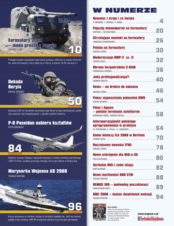 W NUMERZE Nowości z kraju i ze świata P. ABRASZEK, T. GROTNIK. A. KIŃSKI ................................................................... Pojazdy minoodporne na Eurosatory 20 MATEUSZ J. MULTARZYŃSKI ........................................................................ Eurosatory’2008 – moda prosto z Paryża TOMASZ SZULC Strzelające nowinki na Eurosatory 26 JAROSŁAW LEWANDOWSKI ......................................................................... 10 Przegląd nowości największej tegorocznej wystawy militarnej na naszym kontynencie, salonu Eurosatory, który odbył się w Paryżu w dniach 16-20 czerwca b.r. Polska na Eurosatory 30 ANDRZEJ KIŃSKI ........................................................................................ Modernizacje BMP-2 cz. II 32 TOMASZ SZULC .......................................................................................... Obrona bezpośrednia C-RAM 36 RHEINMETALL DEFENCE ............................................................................... Jaka profesjonalizacja? Dekada Beryla NORBERT BĄCZYK ...................................................................................... MICHAŁ SITARSKI ANDRZEJ KIŃSKI ........................................................................................ 4 40 Sowa – na drodze do sukcesu 50 Ewolucja 5,56 mm karabinka automatycznego Beryl na bazie doświadczeń uzyskanych podczas misji ekspedycyjnych z udziałem polskich żołnierzy. P-8 Poseidon nabiera kształtów PIOTR ABRASZEK 46 Pokaz wyposażenia jednostek DWS 54 MICHAŁ SITARSKI ....................................................................................... Fikus i Agawa – polskie terminale satelitarne 58 BRONISŁAW RABIEJ, KONRAD WÓJCIK......................................................... Interoperacyjność polskiego oprogramowania w praktyce 64 M. PIOTROWSKI, R. PALKA, T. Z. KOSOWSKI................................................. Salon lotniczy ILA 2008 w Berlinie 70 TOMASZ SZULC .......................................................................................... Rocznicowe nowości ITWL 84 78 ANDRZEJ KIŃSKI ........................................................................................ Nowe uzbrojenie dla MiG-a-35 Meandry rozwoju następcy najpopularniejszego w świecie samolotu patrolowego i ZOP P-3 Orion, budowa prototypu którego wkroczyła właśnie w finalną fazę. Serbskie MiG-i znów latają IGOR SALINGER.. ........................................................................................ Marynarka Wojenna AD 2008 Nowe możliwości OBR CTM TOMASZ GROTNIK TOMASZ GROTNIK ...................................................................................... REMUS 100 – podwodny poszukiwacz MAKSYMILIAN DURA .................................................................................. BME 2008 – koniec dwuletnich wakacji TOMASZ GROTNIK ...................................................................................... 96 Kryzys sprzętowy w morskim rodzaju sił zbrojnych pogłębia się. Jeśli nie zostaną podjęte kroki zaradcze, MW RP przestanie wkrótce liczyć sie jako siła bojowa. 80 PIOTR BUTOWSKI............................................................................... Nasza okładka: Jedna z licznych propozycji żołnierza przyszłości prezentowana na salonie Eurosatory’2008, tym razem realizowana przez Rheinmetall Defence w ramach programu IdZ-ES. Fot: Andrzej Kiński. 82 88 89 94 www.magnum-x.pl