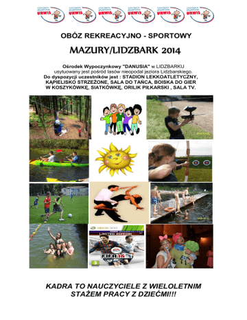 OBÓZ REKREACYJNO - SPORTOWY MAZURY/LIDZBARK 2014 Ośrodek Wypoczynkowy "DANUSIA" w LIDZBARKU usytuowany jest pośród lasów nieopodal jeziora Lidzbarskiego. Do dyspozycji uczestników jest : STADION LEKKOATLETYCZNY, KĄPIELISKO STRZEŻONE, SALA DO TAŃCA, BOISKA DO GIER W KOSZYKÓWKĘ, SIATKÓWKĘ, ORILIK PIŁKARSKI , SALA TV. KADRA TO NAUCZYCIELE Z WIELOLETNIM STAŻEM PRACY Z DZIEĆMI!!! ŚWIADCZENIA: Zakwaterowanie, wyżywienie, transport, ubezpieczenie NNW, doświadczona kadra pedagogiczna, instruktorzy sportu, opieka medyczna, program sportowy oraz turystyczno – krajoznawczy. Organizator: „SZKÓŁKA SPORTOWA URWIS” Transport autokar - 28.06-07.07.2014r. Wyżywienie - 3 posiłki dziennie Zakwaterowanie w domkach 4-6 osób. z pełnym węzłem sanitarnym Całodobowa opieka medyczna Ubezpieczenie NNW Kąpielisko strzeżone – opieka ratownika Strona ośrodka www.jedruś.pl *Termin może ulec zmianie PROGRAM OBOZU: DNI SPORTU: Rozruchy poranne, turnieje zespołowe: piłka nożna - MŚ BRASIL koszykówka, siatkówka, unihokej, ringo, Rozgrywki turniejowe!!! DNI WODNEGO SZALEŃSTWA: Zawody pływackie ,rowery wodne, taaka ryba - Wędkowanie!!! DNI PRZETRWANIA: , Podchody, gry terenowe, rowery DNI SURVIVALU: Strzelectwo: paintball, łuk, wiatrówka DNI TAŃCA: Układy, konkursy taneczne!!! IMPREZY OBOZOWE DZIEŃ ZAKOCHANYCH!!! Mam Talent Dyskoteki, Familiada Milionerzy Karaoke Śluby kolonijne, Randka w ciemno Chrzest kolonijny Ognisko połączone z pieczeniem kiełbasek Wieczorki filmowe oraz XBOX360!!! ZAWODY LEKKOATLETYCZNE Zawody na stadionie: bieg na 60m, 600m, skok w dal, rzut nietypowym przedmiotem CAŁKOWITY KOSZT 1350zł Informacje IRENEUSZ ZIELIŃSKI 698670835-nauczyciel SP 18 GDYNIA Zadatek 350zł do 05 marca jest gwarancją rezerwacji miejsca. Pozostała kwota na konto „Urwis” 76 1140 2004 0000 3602 6522 5510 do 10.05.2014r. Obóz jest zgłoszony w Pomorskim Kuratorium Oświaty *Organizator zastrzega możliwość zmiany programu