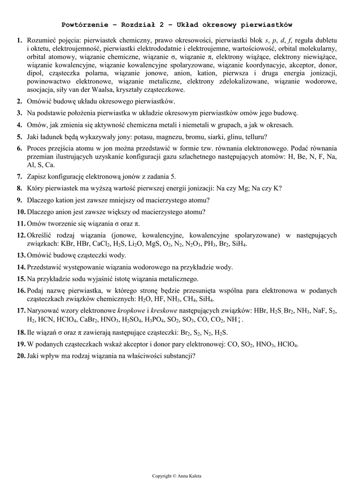 Powtórzenie – Rozdział 2 – Układ okresowy pierwiastków 1. Rozumieć pojęcia: pierwiastek chemiczny, prawo okresowości, pierwiastki blok s, p, d, f, reguła dubletu i oktetu, elektroujemność, pierwiastki elektrododatnie i elektroujemne, wartościowość, orbital molekularny, orbital atomowy, wiązanie chemiczne, wiązanie σ, wiązanie π, elektrony wiąŜące, elektrony niewiąŜące, wiązanie kowalencyjne, wiązanie kowalencyjne spolaryzowane, wiązanie koordynacyje, akceptor, donor, dipol, cząsteczka polarna, wiązanie jonowe, anion, kation, pierwsza i druga energia jonizacji, powinowactwo elektronowe, wiązanie metaliczne, elektrony zdelokalizowane, wiązanie wodorowe, asocjacja, siły van der Waalsa, kryształy cząsteczkowe. 2. Omówić budowę układu okresowego pierwiastków. 3. Na podstawie połoŜenia pierwiastka w układzie okresowym pierwiastków omów jego budowę. 4. Omów, jak zmienia się aktywność chemiczna metali i niemetali w grupach, a jak w okresach. 5. Jaki ładunek będą wykazywały jony: potasu, magnezu, bromu, siarki, glinu, telluru? 6. Proces przejścia atomu w jon moŜna przedstawić w formie tzw. równania elektronowego. Podać równania przemian ilustrujących uzyskanie konfiguracji gazu szlachetnego następujących atomów: H, Be, N, F, Na, Al, S, Ca. 7. Zapisz konfigurację elektronową jonów z zadania 5. 8. Który pierwiastek ma wyŜszą wartość pierwszej energii jonizacji: Na czy Mg; Na czy K? 9. Dlaczego kation jest zawsze mniejszy od macierzystego atomu? 10. Dlaczego anion jest zawsze większy od macierzystego atomu? 11. Omów tworzenie się wiązania σ oraz π. 12. Określić rodzaj wiązania (jonowe, kowalencyjne, kowalencyjne spolaryzowane) w następujących związkach: KBr, HBr, CaCl2, H2S, Li2O, MgS, O2, N2, N2O3, PH3, Br2, SiH4. 13. Omówić budowę cząsteczki wody. 14. Przedstawić występowanie wiązania wodorowego na przykładzie wody. 15. Na przykładzie sodu wyjaśnić istotę wiązania metalicznego. 16. Podaj nazwę pierwiastka, w którego stronę będzie przesunięta wspólna para elektronowa w podanych cząsteczkach związków chemicznych: H2O, HF, NH3, CH4, SiH4. 17. Narysować wzory elektronowe kropkowe i kreskowe następujących związków: HBr, H2S, Br2, NH3, NaF, S2, H2, HCN, HClO4, CaBr2, HNO3, H2SO4, H3PO4, SO2, SO3, CO, CO2, NH +4 . 18. Ile wiązań σ oraz π zawierają następujące cząsteczki: Br2, S2, N2, H2S. 19. W podanych cząsteczkach wskaŜ akceptor i donor pary elektronowej: CO, SO2, HNO3, HClO4. 20. Jaki wpływ ma rodzaj wiązania na właściwości substancji? Copyright © Anna Kaleta