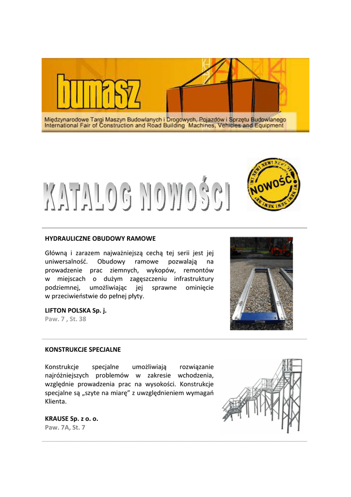 HYDRAULICZNE OBUDOWY RAMOWE Główną i zarazem najważniejszą cechą tej serii jest jej uniwersalność. Obudowy ramowe pozwalają na prowadzenie prac ziemnych, wykopów, remontów w miejscach o dużym zagęszczeniu infrastruktury podziemnej, umożliwiając jej sprawne ominięcie w przeciwieństwie do pełnej płyty. LIFTON POLSKA Sp. j. Paw. 7 , St. 38 KONSTRUKCJE SPECJALNE Konstrukcje specjalne umożliwiają rozwiązanie najróżniejszych problemów w zakresie wchodzenia, względnie prowadzenia prac na wysokości. Konstrukcje specjalne są „szyte na miarę” z uwzględnieniem wymagań Klienta. KRAUSE Sp. z o. o. Paw. 7A, St. 7 LINIA TECHNOLOGICZNA DO PRODUKCJI KOSTKI BRUKOWEJ I GALANTERII BETONOWEJ z WIBROPRASĄ TECHMATIK SHP 5000 C Niezawodność, energooszczędność, uniwersalność zastosowania, nowatorskie rozwiązania konstrukcyjne, nowoczesne technologie wytwarzania, zwarta budowa, niski poziom emitowanego hałasu, konkurencyjna cena. TECHMATIK S.A. Paw. 8, St. 9 OBUDOWY PANELOWE – LEKKIE Panele przy użyciu łączników i szpilek spinających oraz rozpór mechanicznych montowane są w klatkę. Lekkie panele mogą być z łatwością transportowane samochodem osobowym. Panele można łatwo dostosować do wymaganych potrzeb dzięki mechanicznym rozporom, które umożliwiają szybką regulację i zmianę konfiguracji. LIFTON POLSKA Sp. j. Paw. 7, St. 38 PIONOWE ROZPORY Zostały zaprojektowane tak, aby zapobiec osunięciom wykopów poprzez wspieranie ścian bocznych z wykorzystaniem ciśnienia hydraulicznego. Pionowe rozpory może zamontować jedna osoba z poziomu gruntu. LIFTON POLSKA Sp. j. Paw. 7, St. 38 RUSZTOWANIE MONTAŻOWE – PRZEGUBOWE Rusztowanie montażowe – przegubowe to wszechstronny produkt: stosowany jako rusztowanie jezdne lub drabina wolnostojąca, dwustronna 2x7 szczebli lub przystawna 14 szczebli. Użyte przeguby zapewniają wznoszenie rusztowania bezpośrednio z podłoża i w krótkim czasie. Rusztowanie wyróżnia się kompaktowymi wymiarami transportowymi. KRAUSE Sp. z o. o. Paw. 7, St. 7 STABILO® 5500 - PROFESJONALNE RUSZTOWANIE JEZDNE ZE SCHODAMI Innowacyjne rusztowanie STABILO® 5500 zapewnia najlepsze bezpieczeństwo pracy do 12,5m wysokości roboczej i jest niezastąpionym rozwiązaniem dla profesjonalistów z branży budowlanej. Zastosowanie szerokich schodów z poręczą gwarantuje bezpieczne wejście oraz wygodny transport przez jedną osobę materiałów i narzędzi na szeroką górną platformę roboczą, której nośność wynosi 500kg. KRAUSE Sp. z o. o. Paw. 7, St. 7 WIBROPRASA TECHMATIK SHP 5000 C Umożliwia produkcję szerokiej gamy wyrobów, o wys. 40 mm - 500 mm; zmniejsza pobór energii; cichszą pracę; przystosowana do produkcji na blatach stalowych – pozwala na uzyskanie wysokiej jakości wyrobów betonowych; zestaw urządzeń COLORMIX do produkcji wyrobów z wielokolorową warstwą wierzchnią. TECHMATIK S.A. Paw. 8, St. 9