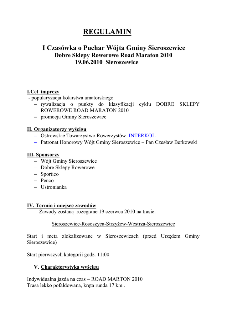 REGULAMIN I Czasówka o Puchar Wójta Gminy Sieroszewice Dobre Sklepy Rowerowe Road Maraton 2010 19.06.2010 Sieroszewice I.Cel imprezy - popularyzacja kolarstwa amatorskiego rywalizacja o punkty do klasyfikacji cyklu DOBRE SKLEPY ROWEROWE ROAD MARATON 2010 promocja Gminy Sieroszewice II. Organizatorzy wyścigu Ostrowskie Towarzystwo Rowerzystów INTERKOL Patronat Honorowy Wójt Gminy Sieroszewice – Pan Czesław Berkowski III. Sponsorzy Wójt Gminy Sieroszewice Dobre Sklepy Rowerowe Sportico Penco Ustronianka IV. Termin i miejsce zawodów Zawody zostaną rozegrane 19 czerwca 2010 na trasie: Sieroszewice-Rososzyca-Strzyżew-Westrza-Sieroszewice Start i meta zlokalizowane w Sieroszewicach (przed Urzędem Gminy Sieroszewice) Start pierwszych kategorii godz. 11:00 V. Charakterystyka wyścigu Indywidualna jazda na czas – ROAD MARTON 2010 Trasa lekko pofałdowana, kręta runda 17 km . Wyścig odbywa się w ruchu otwartym ! Kolejność startów: Mężczyźni A do lat 30 rok urodzenia 1992 do 1980 B 31-40 rok urodzenia 1979 do 1970 C 41-50 rok urodzenia 1969 do 1960 D 51-60 rok urodzenia 1959 do 1950 E powyżej 60 rok urodzenia 1949 i starsi M juniorzy rok urodzenia 1993 i 1994 Kobiety K1 do lat 40 rok urodzenia 1970 i młodsze K2 powyżej 40 rok urodzenia 1969 i starsze Dla wszystkich kat. i grup zawodniczych obowiązuje ten sam dystans. VI. Zgłoszenia - Koszt uczestnictwa wynosi: 30 zł - Zgłaszanie udziału w zawodach i dokonanie wpłaty wpisowego w wysokości określonej przez organizatora powinno odbyć się do 10 dni przed imprezą tj. do 10.06.2010. W tym dniu lista startowa zostanie zamknięta. - Potwierdzenie wpłaty należy przedstawić w biurze zawodów. - W dniu zawodów Organizator nie przyjmuje zgłoszeń. Wpłaty prosimy dokonywać na konto: OTR INTERKOL ul. Dembińskiego 24d/4 63-400 Ostrów Wielkopolski nr 45 8430 0009 0005 1565 0173 3000 z dopiskiem (tytułem):"CZASÓWKA SIEROSZEWICE” - imię i nazwisko zawodnika" VII. Uczestnictwo Prawo startu mają zawodnicy kwalifikujący się do wyżej wymienionych kategorii z wyłączeniem zawodników objętych licencją PZKOL. Uczestnicy zobowiązani są do posiadania kasków rowerowych. Uczestnicy zobowiązani są do pobrania ze strony wyścigu tj.WWW.MEMORIALPOPLAWSKI.PL druku OŚWIADCZENIA. Oświadczenie obowiązuje wszystkich uczestników wyścigu. Oświadczenie przedłożyć należy komisji sędziowskiej w dniu wyścigu tj. 19 czerwca 2010 w godz. 8:30 do 10:00. Brak wypełnionego oświadczenia, oraz kasku sztywnego będzie skutkował nie dopuszczeniem do zawodów. VII. Nagrody i Świadczenia Każdy uczestnik, który wystartuje do zmagań z czasem może liczyć na: - numer startowy, który obowiązkowo ma być przymocowany tak, aby był widoczny po prawej stronie na plecach zawodnika - podstawowe ubezpieczenie NNW - wodę i żywność na mecie - komunikat techniczny - opiekę medyczną - puchar za zajęcie I-VI miejsca w każdej kategorii VIII. Wydawanie świadczeń: Wydawanie świadczeń oraz numerów startowych w biurze zawodów od godz. 8.30 do 10.00. IX. Postanowienia końcowe Zawody zakwalifikowane są do cyklu ROAD MARATON 2010. Zawody odbędą się przy otwartym ruchu drogowym. Uczestników zawodów obowiązują przepisy kodeksu drogowego i ruch prawostronny. -Organizator zapewnia ubezpieczenie NNW dla wszystkich uczestników na czas zawodów. -Najbliższy szpital: Ostrów Wielkopolski, ul. Limanowskiego 22 -Organizator zastrzega sobie prawo do interpretacji niniejszego regulaminu, który jest zgodny z ogólnym regulaminem cyklu imprez DOBRE SKLEPY ROWEROWE ROAD MARATON 2010. Osobą odpowiedzialną za w/w imprezę jest Grzegorz Bogdajewicz tel. 605-491-410 mail: [email protected] Serdecznie zapraszamy życząc niezapomnianych wrażeń i wspaniałej przygody podczas rywalizacji !!!!!! Zarząd OTR INTERKOL