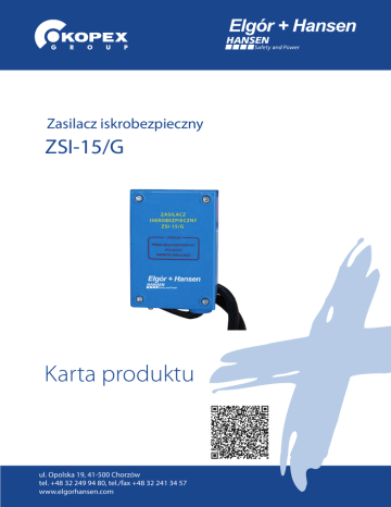 Zasilacz iskrobezpieczny ZSI-15/G Karta produktu ul. Opolska 19, 41-500 Chorzów tel. +48 32 249 94 80, tel./fax +48 32 241 34 57 www.elgorhansen.com Zasilacz iskrobezpieczny ZSI-15/G CECHY CHARAKTERYSTYCZNE Zasilacz iskrobezpieczny typu ZSI-15/G posiada wykonanie specjalne i jest przeznaczony do zasilania elektronicznych urządzeń w wykonaniu iskrobezpiecznym, pracujących w podziemiach kopalń węgla, w wyrobiskach i pomieszczeniach ze stopniem „a”, „b” i „c” niebezpieczeństwa wybuchu oraz klasy „A” lub „B” zagrożenia wybuchem pyłu węglowego. Napięcie zasilania zasilacza ZSI-15/G wynosi 42 V AC, a źródłem tego napięcia jest rozrusznik kopalniany lub inne dopuszczone urządzenia górnicze, o wymaganej wartości napięcia przemiennego 42 V. Napięcie iskrobezpieczne wyjściowe zasilacza zasila iskrobezpieczne obwody urządzeń jak np. GTL, GTL/w. Na wyjściu zasilacza jest napięcie stabilizowane 15 V. Pobór prądu 450 mA. BUDOWA Zasilacz iskrobezpieczny ZSI-15/G zmontowany jest w metalowej obudowie o stopniu ochrony IP54, przystosowanej do zamocowania na konstrukcjach wsporczych za pomocą specjalnie przyspawanych uszów z otworami Ø11mm. Napięcie wejściowe zasilacza podawane jest odcinkiem kabla o długości 4 m integralnie związanym z zasilaczem. Na wyjściu zasilacz posiada komorę przyłączową ze złączkami 4 x po 2,5 mm5 (+15 V 2 zaciski i 0 V 2 zaciski). Kabel napięć wyjściowych wprowadza się do komory przyłączowej przez metalowy wpust kablowy M25 x 1,5 lub dławnicę kablową z tworzywa 25 x 1,5 umieszczoną na jednej ze ścianek zasilacza. Wewnątrz obudowy zasilacza znajduje się układ elektroniczny, zabezpieczony bezpiecznikiem termicznym, komora bezpiecznikowa w wykonaniu ognioszczelnym (04 ATEX 229U) oraz złączki (na obwodzie drukowanym) stanowiące komorę przyłączową. Wszystkie elementy wewnątrz obudowy są zalane zalewą ochronną, z wyjątkiem pokrywki ognioszczelnego zespołu bezpiecznika i części złączek napięć wyjściowych. Obudowa zamykana jest pokrywą, przykręcaną czterema śrubami specjalnymi, z gwintem M6. Napięcie zasilające (42 V, 50 Hz), podawane jest poprzez transformator sieciowy na układ elektroniczny stabilizacyjny. DANE TECHNICZNE Typ ZSI-15/G Napięcie zasilania 42V (+10%, -15%) Częstotliwość napięcia zasilania 50Hz Pobór mocy ≤ 26VA Napięcia wyjściowe | prąd obciążenia 15V (+1V ÷ 3V%) | DC (450mA) Zakres temperatur pracy 0÷40ºC Maksymalna wilgotność względna 95% Stopień ochrony obudowy IP 54 Przewód zasilający OnGcekżi G 0,6/1kV 2 x 2,5 +2,5 Długość przewodu zasilającego 4m Liczba wpustów lub dławnic kablowych 1szt. Liczba i przekrój zacisków wyjściowych 4 szt. po 2,5 mm5 (+15 V-2szt. i 0 V-2szt.) Parametry przewodu łączącego zasilacz z odbiornikiem Maksymalny stosunek zewnętrznych indukcyjności do rezystancji Lo = 0,4mH, Co = 10μF Lo/Ro = 44μH/Ω Wymiary zewnętrzne 365x192x115 mm ± 3 mm Masa 9 kg ± 5% CECHA BUDOWY PRZECIWWYBUCHOWEJ I M2 Ex d [ib] mb I Certyfikat badania typu WE: KDB 06 ATEX 068 ul. Grabowa 1, 40-172 Katowice tel. +48 32 604 70 00, tel./fax +48 32 604 71 00 www.kopex.com.pl