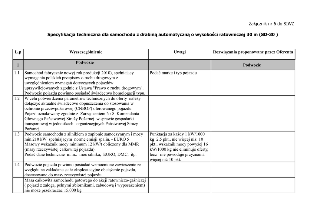 Załącznik nr 6 do SIWZ Specyfikacja techniczna dla samochodu z drabiną automatyczną o wysokości ratowniczej 30 m (SD-30 ) L.p 1 1.1 1.2 1.3 1.4 Wyszczególnienie Uwagi Podwozie Samochód fabrycznie nowy( rok produkcji 2010), spełniający wymagania polskich przepisów o ruchu drogowym z uwzględnieniem wymagań dotyczących pojazdów uprzywilejowanych zgodnie z Ustawą "Prawo o ruchu drogowym". Podwozie pojazdu powinno posiadać świadectwo homologacji typu. W celu potwierdzenia parametrów technicznych do oferty należy dołączyć aktualne świadectwo dopuszczenia do stosowania w ochronie przeciwpożarowej (CNBOP) oferowanego pojazdu. Pojazd oznakowany zgodnie z Zarządzeniem Nr 8 Komendanta Głównego Państwowej Straży Pożarnej w sprawie gospodarki transportowej w jednostkach organizacyjnych Państwowej Straży Pożarnej Podwozie samochodu z silnikiem o zapłonie samoczynnym i mocy min.210 kW spełniającym normę emisji spalin. - EURO 5 Masowy wskaźnik mocy minimum 12 kW/t obliczony dla MMR (masy rzeczywistej całkowitej pojazdu). Podać dane techniczne m.in.: moc silnika, EURO, DMC, itp. Podwozie pojazdu powinno posiadać wzmocnione zawieszenie ze względu na zakładane stałe eksploatacyjne obciążenie pojazdu, dostosowane do masy rzeczywistej pojazdu. Masa całkowita samochodu gotowego do akcji ratowniczo-gaśniczej ( pojazd z załogą, pełnymi zbiornikami, zabudową i wyposażeniem) nie może przekraczać 15.000 kg Rozwiązania proponowane przez Oferenta Podwozie Podać markę i typ pojazdu Punktacja za każdy 1 kW/1000 kg 2,5 pkt., nie więcej niż 10 pkt., wskaźnik mocy powyżej 16 kW/1000 kg nie eliminuje oferty, lecz nie powoduje przyznania więcej niż 10 pkt. 1.5 1.6 1.7 1.8 1.9 1.10 1.11 1.12 1.13 1.14 1.15 1.16 Układ napędowy 4x2 z możliwością blokady mostu napędowego. ( koła osi przedniej i tylnej tego samego rozmiaru ) . Pojazd powinien być wyposażony w układ kontroli hamowania ABS Pełno wymiarowe koło zapasowe zamontowane na stałe na pojeździe. Pojemność zbiornika paliwa zapewniająca przejazd min. 300 km lub 4 godzinną pracę autodrabiny. Silnik pojazdu powinien być przystosowany do ciągłej pracy, bez uzupełniania cieczy chłodzącej, oleju oraz przekraczania dopuszczalnych parametrów pracy określonych przez producenta w czasie minimum 4godz. podczas postoju. Pojazd wyposażony w zaczepy holownicze- szekle 2 z przodu i 2 z tyłu pojazdu umożliwiające jego odholowanie . Szekle przednie z możliwością wkręcania, przewożone w skrytce. Otwory na te szekle z zaślepką. Rezerwa masy w pełni obciążonego samochodu, w stosunku do całkowitej dopuszczalnej masy pojazdu min 3% . Pojazd powinien być wyposażony w szybkozłącze z zaworem zwrotnym do uzupełniania powietrza w układzie pneumatycznym z sieci stacjonarnej. Pojazd wyposażony w integralny układ prostowniczy do ładowania akumulatorów z zewnętrznego źródła ~ 230 V, gniazdo przyłączeniowe umieszczone po lewej stronie (w kabinie kierowcy sygnalizacja świetlna i dźwiękowa podłączenia do zewnętrznego źródła). Podstawowa obsługa silnika możliwa bez podnoszenia kabiny. Uruchamianie silnika spoza miejsca kierowcy musi być tak skonstruowane, aby zabezpieczyć pojazd przed przypadkowym ruszeniem. Wylot spalin nie może być skierowany na stanowisko obsługi poszczególnych urządzeń pojazdu, oraz pionowo do góry. Pojazd wyposażony w przewód do odprowadzania spalin. Instalacja pneumatyczna pojazdu zapewniająca możliwość wyjazdu w ciągu 60 s. od chwili uruchomienia silnika samochodu przy równoczesnym prawidłowym funkcjonowaniu hamulców wraz z 2 1.17 1.18 1.19 1.20 1.21 przyłączem (szybkozłącze) umożliwiającym uzupełnianie układu ze źródła zewnętrznego. Wszelkie funkcje wszystkich układów i urządzeń pojazdu muszą zachować swoje właściwości pracy w temperaturach otoczenia od -25 °C do + 35 °C Kolorystyka: - elementy podwozia – czarne lub szare, - błotniki i zderzaki - białe, - kabina, zabudowa - czerwień sygnałowa ( RAL 3000 ) - Maksymalna wysokość całkowita pojazdu gotowego do jazdy do 3300 mm. - Maksymalna długość całkowita pojazdu do 9.800 mm. - Maksymalna wysokość górnej krawędzi najwyższej półki lub szuflady w położeniu roboczym (po wysunięciu lub rozłożeniu) nie wyżej niż 1850 mm od poziomu terenu. Jeżeli wysokość półki lub szuflady od poziomu gruntu przekracza 1,85 m, konieczne jest zainstalowanie podestów umożliwiających łatwy dostęp do sprzętu, przy czym otwarcie lub wysunięcie podestów musi być sygnalizowane w kabinie kierowcy. - Sprzęt powinien być rozmieszczony grupowo w zależności od przeznaczenia z zachowaniem ergonomii. Pojazd wyposażony w: - urządzenie sygnalizacyjno – ostrzegawcze (akustyczne) powinno posiadać min.3 modulowane tony o mocy min. 200W lub 2 x 100 W. Sterowanie modulacją dźwiękową musi odbywać się przez manipulator urządzenia i włącznik sygnału dźwiękowego pojazdu. Urządzenie akustyczne powinno umożliwiać podawanie komunikatów słownych w czasie jazdy i podczas pracy drabiny. - lampy sygnalizacyjne stroboskopowe : z przodu pojazdu, umieszczone na dachu symetrycznie 2 szt, z tyłu 1 szt. (Lampy zabezpieczone metalowym koszem przed uszkodzeniem ). - dodatkowe 2 lampy sygnalizacyjne niebieskie stroboskopowe umieszczone z przodu pojazdu. Dodatkowy sygnał pneumatyczny, włączany dodatkowym włącznikiem. Włącznik umieszczony w miejscu łatwo dostępnym 3 1.22 1.23 1.24 1.25 1.26 1.27 1.28 1.29 1.30 dla kierowcy. Instalacja elektryczna jednoprzewodowa 24V, z biegunem ujemnym na masie . Moc alternatora i pojemność akumulatorów musi zapewniać pełne zapotrzebowanie na energię elektryczną przy jej maksymalnym obciążeniu. Instalacja elektryczna wyposażona w główny wyłącznik prądu umożliwiający odłączenie akumulatora(ów) od wszystkich systemów elektrycznych z wyjątkiem tych, które wymagają stałego zasilania (np. ładowar