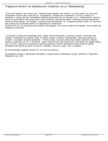MIASTKO24.PL - Miastecki Portal Internetowy Tragiczna śmierć na oblodzonym chodniku na ul. Małopolskiej Życie choć piękne, tak kruche jest - śpiewał zespół Golden Life. Można by teraz dodać, że życie jest szczególnie kruche jeśli chodzi się po miasteckich, oblodzonych chodnikach. W nocy z soboty na niedzielę 5 lutego 39-letni mieszkaniec Miastka przewrócił się na chodniku na ul. Małopolskiej. Uderzył głową w skute lodem betonowe płytki. Mimo szybkiej interwencji policji i reanimacji przeprowadzonej przez towarzyszącego mu kolegę, a później przez policjantów, ok. 3 godziny później zmarł. To pierwszy tak drastyczny przypadek śmierci na oblodzonych chodnikach. Problem ten nie raz wcześniej poruszaliśmy ostrzegając, że w końcu dojdzie do tragedii. Teraz spełnił się najgorszy scenariusz. - Przyszedł z kolegą do pobliskiego pubu, gdzie chwilę posiedział, a później wyszedł. Przeszedł kilka kroków i poślizgnął się kawałek dalej, w pobliżu sklepu i zakładu fryzjerskiego, uderzając potylicą w chodnik - opowiada świadek zdarzenia. - Trzeba dodać, że praca policji była bardzo sprawna. Bardzo szybko przyjechali, po ok. 3 minutach, i długo reanimowali tego mężczyznę. Cała akcja nie zajęła więcej niż 15 minut, włącznie z przyjazdem karetki pogotowia. Policja odwaliła tu kawał świetnej roboty. Widziałem jak starali się żeby mu pomóc. Niestety, zmarł ok. godz. 3.00 w szpitalu. Do śmiertelnego wypadku doszło ok. 15 minut po północy. Szczegółowa relacja z zeznaniami świadków i więcej skarg na oblodzone drogi i chodniki w Tygodniku Miasteckim od 7.02. http://www.miastko24.pl Kreator PDF Utworzono 8-03-2017, 14:01