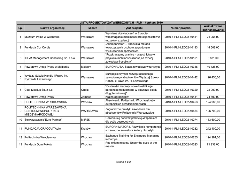 LISTA PROJEKTÓW ZATWIERDZONYCH - PLM - konkurs 2010 Lp. Nazwa organizacji Miasto Tytuł projektu Numer projektu Wnioskowane dofinansowanie Wymiana doświadczeń w Europiewspomaganie mobilności profesjonalistów z muzeów-rezydencji „Akompaniator” – francuska metoda towarzyszenia osobom zagroŜonym wykluczeniem społecznym. "Przekraczamy granice - uczestnictwo w projekcie mobilności szansą na rozwój zawodowy i osobisty" 2010-1-PL1-LEO02-10451 21 058,00 2010-1-PL1-LEO02-10193 14 508,00 2010-1-PL1-LEO02-10151 3 831,00 Malbork EURONAUTA. StaŜe zawodowe w turystyce 2010-1-PL1-LEO02-10316 49 126,00 WyŜsza Szkoła Handlu i Prawa im. Ryszarda Łazarskiego Warszawa Europejski wymiar rozwoju osobistego i zawodowego absolwentów WyŜszej Szkoły Handlu i Prawa im. R. Łazarskiego 2010-1-PL1-LEO02-10442 126 456,00 6 Club Silesius Sp. z o.o. Opole 2010-1-PL1-LEO02-10320 22 900,00 7 Powiatowy Urząd Pracy Zamość 2010-1-PL1-LEO02-10431 74 800,00 8 POLITECHNIKA WROCŁAWSKA Wrocław 2010-1-PL1-LEO02-10453 124 986,00 9 POLITECHNIKA WARSZAWSKA, CENTRUM WSPÓŁPRACY MIĘDZYNARODOWEJ WARSZAWA Zagraniczne praktyki zawodowe dla absolwentów Politechniki Warszawskiej 2010-1-PL1-LEO02-10484 126 709,00 10 Stowarzyszenie"Euro-Partner" MIRSK Uczenie się poprzez praktykę-Wsparciem dla osób bezrobotnych. 2010-1-PL1-LEO02-10274 153 600,00 11 FUNDACJA CRACOVITALIA Kraków EUROANIMATOR I. Rozwijanie kompetencji w zawodzie animatora kultury i turystyki 2010-1-PL1-LEO02-10232 242 400,00 12 Politechnika Wrocławska Wrocław 2010-1-PL1-LEO02-10255 124 991,00 13 Fundacja Dom Pokoju Wrocław 2010-1-PL1-LEO02-10323 71 232,00 1 Muzeum Pałac w Wilanowie Warszawa 2 Fundacja Cor Cordis Warszawa 3 IDEA! Management Consulting Sp. z o.o. Warszawa 4 Powiatowy Urząd Pracy w Malborku 5 "O starości inaczej - nowe kwalifikacje personelu medycznego w obszarze opieki długoterminowej". Kraina ogrodników Absolwentki Politechniki Wrocławskiej w europejskich przedsiębiorstwach Exchange Training for Engineers Managing in Europe Pod okiem mistrza/ Under the eyes of the master Strona 1 z 2 Lp. Nazwa organizacji Miasto 14 Uniwersytet im. Adama Mickiewicza w Poznaniu Poznań 15 Powiatowy Urząd Pracy w Siemianowicach Śląskich Siemianowice Śląskie 16 Zespół Szkół Samochodowych Wrocławska WyŜsza Szkoła Inforamtyki 17 Stosowanej 18 Powiatowy Urząd Pracy Centrum Innowacyjnego Rozwoju 19 Społeczeństwa Gdańsk Wrocław Zamość Kraków Tytuł projektu Praktyka bez granic - zdobywanie umiejętności zawodowych w instytucjach zagranicznych €uropejski fach - osoby bezrobotne na staŜu w Niemczech SEAM - Super Euro Auto Mechanik - spoina współpracy Kształcenie zawodowe w międzynarodowym środowisku pokonaniem bariery wejścia na rynek pracy absolwentów Wrocławskiej WyŜszej Szkoły Informatyki Stosowanej. Liga zawodowców Pierwsze kroki w bioprzemyśle (ang. First Steps into Bioindustry) Strona 2 z 2 Numer projektu Wnioskowane dofinansowanie 2010-1-PL1-LEO02-10457 59 555,00 2010-1-PL1-LEO02-10370 228 306,00 2010-1-PL1-LEO02-10312 25 896,00 2010-1-PL1-LEO02-10242 95 640,00 2010-1-PL1-LEO02-10073 131 715,00 2010-1-PL1-LEO02-10337 174 114,00