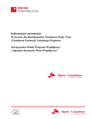 Informacja i promocja Wytyczne dla Beneficjentów Funduszu Study Tour i Funduszu Promocji Lokalnego Eksportu Szwajcarsko-Polski Program Współpracy „Alpejsko-Karpacki Most Współpracy” Spis treści 1. WPROWADZENIE ............................................................................................................................ 3 2. DZIAŁANIA INFORMACYJNE I PROMOCYJNE W RAMACH SZWAJCARSKO-POLSKIEGO PROGRAMU WSPÓŁPRACY (SPPW) ................................................................................................ 3 2.1. Cele ogólne .................................................................................................................................. 3 2.2. Główne komunikaty ..................................................................................................................... 3 2.3. Grupy docelowe ........................................................................................................................... 4 2.4. Narzędzia komunikacyjne ............................................................................................................ 4 3. PODZIAŁ DZIAŁAŃ ......................................................................................................................... 5 3.1. Obowiązki Beneficjentów ............................................................................................................ 5 3.2. Kiedy należy rozpocząć działania informacyjne i promocyjne? .................................................. 5 3.3. Zasady oznakowania projektów ................................................................................................... 6 3.3.1. System identyfikacji wizualnej.............................................................................................. 6 3.3.2. Informacja o współfinansowaniu w ramach SPPW .............................................................. 9 3.3.3. Stosowanie systemu identyfikacji wizualnej i informacji o współfinansowaniu ................ 10 3.4. Działania informacyjne i promocyjne w ramach projektu ......................................................... 10 3.4.1. Działania obowiązkowe....................................................................................................... 10 3.4.2. Działania rekomendowane .................................................................................................. 13 3.5. Dokumentowanie działań informacyjnych i promocyjnych ....................................................... 15 3.6. Kontrola i monitoring działań informacyjnych i promocyjnych ................................................ 15 4. KONTAKT........................................................................................................................................ 15 2 1. WPROWADZENIE Niniejszy dokument określa obowiązki Beneficjentów1 Funduszu Study Tour i Funduszu Promocji Lokalnego Eksportu w zakresie informacji i promocji dotyczącej projektów współfinansowanych z w/w Funduszy w ramach projektu pn. Alpejsko-Karpacki Most Współpracy (AKMW)współfinansowanego przez Szwajcarię w ramach szwajcarskiego programu współpracy z nowymi krajami członkowskimi Unii Europejskiej. UWAGA! Niniejszy dokument powstał na podstawie obowiązujących Wytycznych ws. informacji i promocji Szwajcarsko-Polskiego Programu Współpracy opracowanych przez Władzę Wdrażającą Programy Europejskie (dostępne na www.programszwajcarski.gov.pl) i stanowi jego rozwinięcie na potrzeby Beneficjentów Funduszu Study Tour i Funduszu Lokalnego Eksportu. 2. DZIAŁANIA INFORMACYJNE I PROMOCYJNE W RAMACH SZWAJCARSKO-POLSKIEGO PROGRAMU WSPÓŁPRACY(SPPW) 2.1. Cele ogólne Główne cele działań informacyjnych i promocyjnych w ramach SPPW obejmują: informowanie opinii publicznej o SPPW, jego realizacji i wynikach, w szczególności w celu zwiększenia świadomości publicznej na temat wkładu Szwajcarii w promowanie spójności społeczno-gospodarczej w Polsce, informowanie potencjalnych Beneficjentów o Programie i zachęcanie ich do udziału, jak również udzielanie im informacji, niezbędnych w procesie aplikacyjnym, motywowanie i wspieranie Beneficjentów w poprawnej i efektywnej realizacji projektów, promowanie celów SPPW, tj. zmniejszanie różnic społeczno-gospodarczych w UE i w Polsce, jak również promowanie korzyści płynących z wdrażania Programu, promowanie, wspieranie i zachęcanie do dialogu i współpracy pomiędzy przedstawicielami sektora publicznego, prywatnego i pozarządowego, jako kluczowego aspektu realizacji celów SPPW, zapewnienie przejrzystości, w szczególności w zakresie wyboru projektów, kontraktacji i zarzadzania finansowego. 2.2. Główne komunikaty Komunikaty dotyczące SPPW powinny uwzględniać główny cel Programu, tj. zmniejszanie różnic społeczno-gospodarczych pomiędzy Polską a lepiej rozwiniętymi państwami UE, a w Polsce – pomiędzy słabiej a lepiej rozwiniętymi regionami. 1 Na potrzeby niniejszego dokumentu Beneficjentami nazywa się jednostki sektora publicznego, pozarządowego lub prywatnego, którym przyznano dofinansowanie w ramach Funduszu Study Tour i Funduszu Promocji Lokalnego Eksportu w ramach projektu pn. Alpejsko-Karpacki Most Współpracy. 3 Główny cel Programu można wyrazić poprzez komunikaty stosowane w ramach poszczególnych obszarów tematycznych: środki przyznawane w ramach SPPW przyczyniają się do rozwoju peryferyjnych i zmarginalizowanych regionów Polski poprzez finansowanie wielo-tematycznych projektów rozwoju lokalnego, Program finansuje projekty mające na celu poprawę ochrony wschodnich granic Unii, zarządzania imigracją i problematyką uchodźstwa, jak również finansuje kampanie społeczne na temat wzmacniania bezpieczeństwa wewnętrznego, środki przyznawane w ramach Programu umożliwiają zrównoważony rozwój poprzez realizację inwestycji przyjaznych środowisku, dotyczących poprawy gospodarki odpadami i ef
