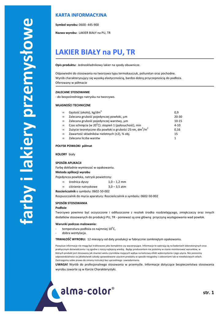 KARTA INFORMACYJNA Symbol wyrobu: 0600- 445-900 Nazwa wyrobu: LAKIER BIAŁY na PU, TR LAKIER BIAŁY na PU, TR Opis produktu: Jednoskładnikowy lakier na spody obuwnicze. Odpowiedni do stosowania na tworzywa typu termokauczuk, poliuretan oraz pochodne. Wyrób charakteryzujący się wysoką elastycznością, bardzo dobrą przyczepnością do podłoża. Oferowany w półmacie ZALECANE STOSOWANIE - do bezpośredniego natrysku na tworzywo. WŁASNOŚCI TECHNICZNE • • • • • • • 3 Gęstość (około), kg/dm Zalecana grubość pojedynczej powłoki, µm Zalecana grubość pojedynczej warstwy, µm o Czas schnięcia (w 20 C): stopień 1 (pyłosuchość), min 3 2 Zużycie teoretyczne dla powłoki o grubości 25µm, dm /m Zawartość składników nielotnych (±2), % obj. Zalecana liczba warstw 0,9 20-30 10-15 4-10 0,16 15 1 POŁYSK POWŁOKI półmat KOLORY biały SPOSÓB APLIKACJI Farbę dokładnie wymieszać w opakowaniu. Metoda aplikacji wyrobu Pojedyncza powłoka, natrysk powietrzny: • średnica dyszy 1,0 – 1,2 mm • ciśnienie natryskowe 3,0 – 3,5 atm Rozcieńczalnik o symbolu: 0602-50-002 Rozpuszczalnik do mycia aparatury: Rozcieńczalnik o symbolu: 0602-50-002 SPOSÓB STOSOWANIA Podłoże Tworzywo powinno być oczyszczone i odtłuszczone z resztek środka rozdzielającego, zmiękczaczy oraz innych dodatków stosowanych do produkcji PU, TR - ponieważ są one główną przyczyną występowania wad powłok. Warunki podczas malowania: o temperatura podłoża co najmniej 10 C, dobra wentylacja. TRWAŁOŚĆ WYROBU: 12 miesięcy od daty produkcji w fabrycznie zamkniętym opakowaniu. Powyższe informacje nie mogą być traktowane jako kompletne czy wyczerpujące. Informacje te opierają się na badaniach laboratoryjnych oraz praktycznym doświadczeniu i są zgodne z naszą najlepszą wiedzą . Będąc producentem nie jesteśmy w stanie monitorować warunków, w których produkt jest stosowany jak również wielu czynników mających wpływ na końcowy efekt wykorzystania i jego użycia. Nie ponosimy odpowiedzialności za jakiekolwiek szkody spowodowane użyciem produktu w sposób niezgodny z zaleceniami lub w niewłaściwych celach. Zastrzegamy sobie prawo do zmiany instrukcji bez uprzedniego zawiadamiania. UWAGA! Wyrób do profesjonalnego stosowania w przemyśle. Informacje dotyczące bezpieczeństwa stosowania wyrobu zawarte są w Karcie Charakterystyki. str. 1