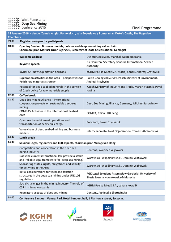 Final Programme 18 January 2016 - Venue: Zamek Książat Pomorskich, sala Bogusława / Pomeranian Duke’s Castle, The Boguslaw Chambers 09:00 Registration open for participants 10:00 12:00 12:20 Opening Session: Business models, policies and deep sea mining value chain Chairman: prof. Mariusz Orion-Jędrysek, Secretary of State Chief National Geologist Welcome address Olgierd Geblewicz, Marshal Westpomerania Keynote speech Nii Odunton, Secretary General, International Seabed Authority KGHM SA: New exploitation horizons KGHM Polska Miedź S.A. Maciej Koński, Andrzej Grotowski Exploration activities in the Area – perspectives for Polish raw materials strategy Polish Geological Survey, Polish Ministry of Environment, Andrzej Przybycin Potential for deep seabed minerals in the context of Czech policy for raw materials supply Czech Ministry of Industry and Trade, Martin Vlastnik, Pavel Kavina Coffee break Deep Sea Mining Alliance – international cooperation projects on sustainable deep-sea mining COMRA's Activities in the International Seabed Area Open sea transshipment operations and transportation of heavy bulk cargo Deep Sea Mining Alliance, Germany, Michael Jarowinsky, COMRA, China, LIU Feng Polsteam, Paweł Szynkaruk 13:30 Value chain of deep seabed mining and business models Lunch break 14:30 Session: Legal, regulatory and CSR aspects, chairman prof. Vu Nguyen Hong Competition and cooperation in the deep sea mining industry Does the current international law provide a stable and reliable legal framework for deep sea mining? Sponsoring States' rights, obligations and liability for activities in the Area Initial considerations for fiscal and taxation structures in the deep sea mining under UNCLOS regulations Social challenges in the mining industry. The role of CSR in mining companies Regulatory aspects of deep sea mining 18:00 Interoceanmetal Joint Organization, Tomasz Abramowski Dentons, Wojciech Wąsowicz Wardyński i Wspólnicy sp.k., Dominik Wałkowski Wardyński i Wspólnicy sp.k., Dominik Wałkowski PGK Legal Solutions Przemysław Gardocki, Univeristy of Silesia Joanna Nowakowska-Małusecka KGHM Polska Miedź S.A., Łukasz Kowalik Dentons, Agnieszka Skorupińska Conference Banquet. Venue: Park Hotel banquet hall, 1 Plantowa street, Szczecin. 19 January 2016 - Venue: Zamek Książat Pomorskich, sala Bogusława / Pomeranian Duke’s Castle, The Buguslaw Chambers 09:30 09:30 11:00 Session: Technology development. Chairman: prof. Peter Halbach Design prerequisites for deep sea mining ships Marine Design Szczecin, Artur Zabawski Technical planning of pilot mining test for polymetallic nodules Hydro Naval Ltd, Szymon Sobków, Tadeusz Szelangiewicz Applied research capabilities of CTO S.A. in deep sea mining area Ship Design and Research Centre, Leszek Wilczyński Multidisciplinary education for deep sea mining needs Maritime University of Szczecin, Jerzy Hajduk Coffee break Hydrometallurgical metals recovery from the nodules Institute of Non-ferrous Metals in Gliwice, Grzegorz Pietek, Katarzyna Leszczyńska-Sejda Underwater vehicles and subsea systems – support for mining operations West Pomeranian University of Technology, Taduesz Graczyk Innovation methods for complex ore processing Technical and Chemical University in Prague, Vu Nguyen Hong Cuban nickel industry readiness to process polymetallic nodules Interoceanmetal Joint Organization, Ramon Causse Miyares 13:00 Lunch break 14:00 Session: Exploration and Ocean Environment Protection, chairman Dr Peter Balazs Concentrations and metal potentials of Rare Earth Free University of Berlin, Peter Halbach and Andreas Jahn Elements in marine polymetallic nodule and Co-rich crust deposit Deep sea exploration for metal reserves – objectives, Interoceanmetal Joint Organization, Ivo Dreiseitl methods and look into the future Megafauna diversity in the TOML contract area 15:00 16:00 Coffee break Environmental baseline and impact studies for deep sea mining Would it be feasible, affordable and socially acceptable? Polymetallic ocean deposits from geological and geopolitical point of view Protection of marine environment and monitoring systems for deep sea mining Conference closing Tonga Offshore Mining Ltd/Nautilus Minerals, Nicholas Dyriw University of Szczecin, Teresa Radziejewska University of Szczecin, Łukasz Maciąg Interoceanmetal Joint Organization, Valcana Stoyanova