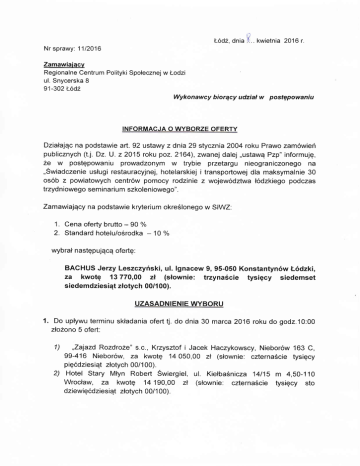 ŁodŹ,dnia .. kwietnia 2016r' Nr sprawy: 1112016 Zamawiaiacv Regionalne Centrum Polityki Społecznej w Łodzi ul. Snycerska 8 91-302 ŁódŹ Wykonawcy biorący udział w postępowaniu INFORMACJA O VVYBORZE OFERTY Działając na podstawie ań. 92 ustawy z dnia 29 stycznia 2004 roku Prawo zamowień publicznych (t.j. Dz' U' z2015 roku poz.2164), zwanej dalej ,,ustawą Pzp'' informuję, Że W postępowaniu prowadzonym W trybie przetargu nieograniczonego na ,,Swiadczenie usługi restauracyjnej, hotelarskiej i transportowej dla maksymalnie 30 osob z powiatowych centrow pomocy rodzinie z wojewodztwa łodzkiego podczas trzydniowego seminarium szkoleniowego". Zamawiający na podstawie kryterium określonegow SIWZ: 1. Cena 2' - 90 % Standard hoteluiośrodka _ 10 oferty brutto o/o wybrał następującą ofeńę: BAcHUs Jerzy Leszczyński, ul. lgnacew 9, 95-050 Konstantynów Łodzki, za kwotę 13 770'00 zł (słownie: trzynaście tysięcy siedemset siedemdziesiąt złotych 00/1 00). UZASADNIENIE WYBORU 1. Do upływu terminu składania ofert tj. do dnia 30 marca 2016 roku do godz.10:00 złoŻono 5 ofert: ,,Zajazd Rozdroze" s.c., Krzysztof i Jacek Haczykowscy, Nieborow 163 C, 99-416 Nieborów, za kwotę 14 050'00 zł (słownie: czternaście tysięcy pięćdziesiąt złotych 00/1 00). 2) Hotel Stary Młyn Robert Swiergiel, ul. Kiełbaśnicza14115 m 4,5o-110 Wrocław, za kwotę 14 190,00 zł (słownie: czternaście tysięcy sto dziewięcdziesiąt złotych 00i100). 1) 3) Centrum Biznesu i Promocji Kadr Społka z ograniczoną odpowiedzialnoŚcią, os' Słoneczne 14, 27-4oo ostrowiec Swiętokrzyski, za kwotę 19592,80 zł (słownie: dziewiętnaŚcie tysięcy pięcset dziewięcdziesiąt dwa złote 80/100). 4) oST Gromada oddział Centrum Turystyki, Biuro Turystyczne, ul. PoW 19, 90248 ŁódŹ, za kwotę 25 500,00 zł (słownie: dwadzieściapięc tysięcy pięćset złotych 00i100). 5) BACHUS Jerzy Leszczyński, ul' lgnacew 9, 95-050 KonstantynÓw Łodzki, za kwotę 13770,00 zł (słownie: trzynaście tysięcy siedemset siedemdziesiąt złotych 00i 100). 2. W postępowaniu odrzucono następujące oferty 1) ofertę Nr 3 złozoną przez Centrum Biznesu i Promocji Kadr Społka z ograniczoną odpowiedzialnoscią, oS. Słoneczne 14, 27-400 ostrowiec Swiętokrzyski - na podstawie art. 89 ust. 1 pkt. 6 ustawy Pzp poniewaŻ zawiera błędnie obliczony podatek VAT. Podatek został obliczony według stawki 23% VAT. Prawidłowo podatek VAT powinien być obliczony według stawki 8% i 23% VAT. Zgodnie z poz. 7 załącznika do Rozporządzenia Ministra Finansów z dnia 23 grudnia 2013 roku w sprawie towarow i usług, dla ktorych obniza się stawkę podatku od towarow i usług, oraz warunkow stosowania stawek obnizonych (t.j. Dz. U' z 2013r. poz. 1719.) podatek na usługę restauracyjną wynosi 8% YAT z wyjątkiem sprzedaŻy napojów, przy przygotowywaniu ktorych jest wykorzystywany napar z kawy lub herbaty niezaleŻnie od udziału procentowego tego naparu w przygotowywanym napoju, napojow bezalkoholowych gazowanych oraz wód mineralnych, które są objęte podatkiem 23%vAT.W związku z faktem, iz usługa restauracyjna obejmuje sprzedaz kawy, herbaty i wody mineralnej powinna być zastosowana zarowno stawka 8 % VAT jak i 23 % VAT. W związku z powyŻszym ofer1a zawiera błędy w obliczeniu ceny, a więc na podstawie art. 89 ust. 1 pkt. 6 podlega odrzuceniu. 2) ofertę nr 4 złoŻoną przez oST Gromada oddział Centrum Turystyki, Biuro Turystyczne, ul. PoW 19, 90-248 ŁódŹ, na podstawie art. 89 ust. 1 pkt. 6 ustawy Pzp. Wykonawca w załączniku nr 1 do S|WZ w formularzu ofeńowym nie wykazał wartości podatkow VAT 8% i 23o/o. Przedmiot zamowienia dotyczy świadczenia usługi hotelarskiej, restauracyjnej i transpor1owej a więc nie ma charakteru usługi turystycznej, w związku z Czym nie jest ona zwolniona z opodatkowania. W związku z powyŻszym ofeńa podlega odrzuceniu na podstawie art. 89 ust. 1 pkt' 6 gdyz zawiera błędy w obliczeniu ceny. 3. Wybór najkorzystniejszej oferty: Nr oferty Nazwa wykonawcy (imię i nazwisko Wykonawcy) Cena Kryterium: cena ofeńy brutto Kryterium Razem liczba Standard hote!u/ośro punktów Miejsce dka 1 2 5 ,,ZĄazd Rozdroze'' s.c., Krzysztof i Jacek Haczykowscy, Nieborow 163 C, 994'16 Nieborow Hotel Stary Młyn Robert Swiergiel, ul. Kiełbaśnicza14115 m 4,50-110 Wrocław BACHUS Jerzy Leszczyński, ul. lgnacew 9, 95-050 Konstantynow Łodzki 14 050,00 zł 14 190,00 zł 13 770,00 zł 88,20 pkt. 87,33 pkt. 0,00 pkt. 88,20 pkt. 0,00 pkt. 87,33 0,00 pkt. 90,00 pkt. pkt. 90,00 pkt. Z powyŻszego rankingu wynika , iŻ najkorzystniejsza ofeńa została złoŻona przez BACHUS Jerzy Leszczyński, ul' lgnacew 9, 95-050 Konstantynow Łodzki, za kwotę 13770,00 zł (słownie: trzynaścietysięcy siedemset siedemdziesiąt złotych 00/100)' oferta spełnia warunki slWZ ijest zgodna z ustawą Prawo zamowień publicznych. Cena oferty mieŚci się w kwocie jakąZamawiający moŻe przeznaczyc na sfinansowanie zamówienia. W ocenie dokonanej na podstawie kryterium określonegow S|WZ oferŁa uzyskała 90,00 punktow. z ar1. 94 ust.1 pkt. 2 ustawy Pzp umowa w sprawie zamówienia publicznego moze być zawarta w terminie nie krotszym niŻ 5 dni od dnia przesłania zawiadomienia o wyborze najkorzystniejszej ofeńy, jeŻeli zawiadomienie to zostało przesłane w sposób okreŚlony w art'27 ust'2 (faksem lub drogą elektroniczną) albo 10 dni _ jezeli zostało przesłane w inny sposob. 5. Zgodnie DY RE Regionalnę -L - Po\itY\<i sPut Anna urn Łodzi il ilt