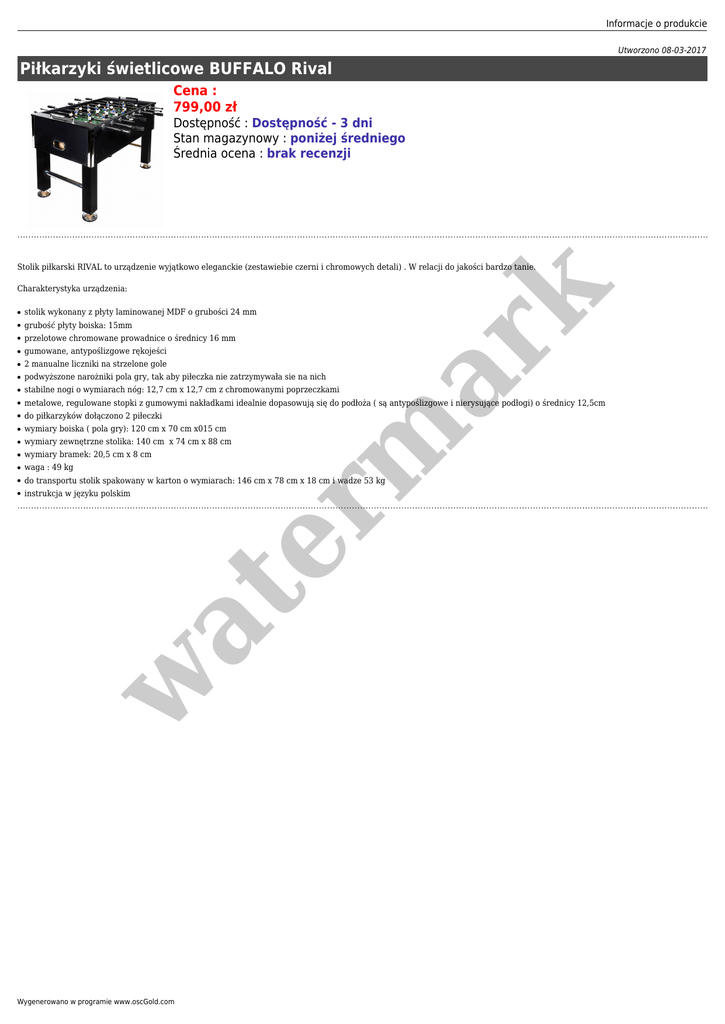 Informacje o produkcie Utworzono 08-03-2017 Piłkarzyki świetlicowe BUFFALO Rival Cena : 799,00 zł Dostępność : Dostępność - 3 dni Stan magazynowy : poniżej średniego Średnia ocena : brak recenzji Charakterystyka urządzenia: er m ar k Stolik piłkarski RIVAL to urządzenie wyjątkowo eleganckie (zestawiebie czerni i chromowych detali) . W relacji do jakości bardzo tanie. stolik wykonany z płyty laminowanej MDF o grubości 24 mm ● grubość płyty boiska: 15mm ● przelotowe chromowane prowadnice o średnicy 16 mm ● gumowane, antypoślizgowe rękojeści ● 2 manualne liczniki na strzelone gole ● podwyższone narożniki pola gry, tak aby piłeczka nie zatrzymywała sie na nich ● stabilne nogi o wymiarach nóg: 12,7 cm x 12,7 cm z chromowanymi poprzeczkami ● metalowe, regulowane stopki z gumowymi nakładkami idealnie dopasowują się do podłoża ( są antypoślizgowe i nierysujące podłogi) o średnicy 12,5cm ● do piłkarzyków dołączono 2 piłeczki ● wymiary boiska ( pola gry): 120 cm x 70 cm x015 cm ● wymiary zewnętrzne stolika: 140 cm x 74 cm x 88 cm ● wymiary bramek: 20,5 cm x 8 cm ● waga : 49 kg ● do transportu stolik spakowany w karton o wymiarach: 146 cm x 78 cm x 18 cm i wadze 53 kg ● instrukcja w języku polskim w at ● Wygenerowano w programie www.oscGold.com