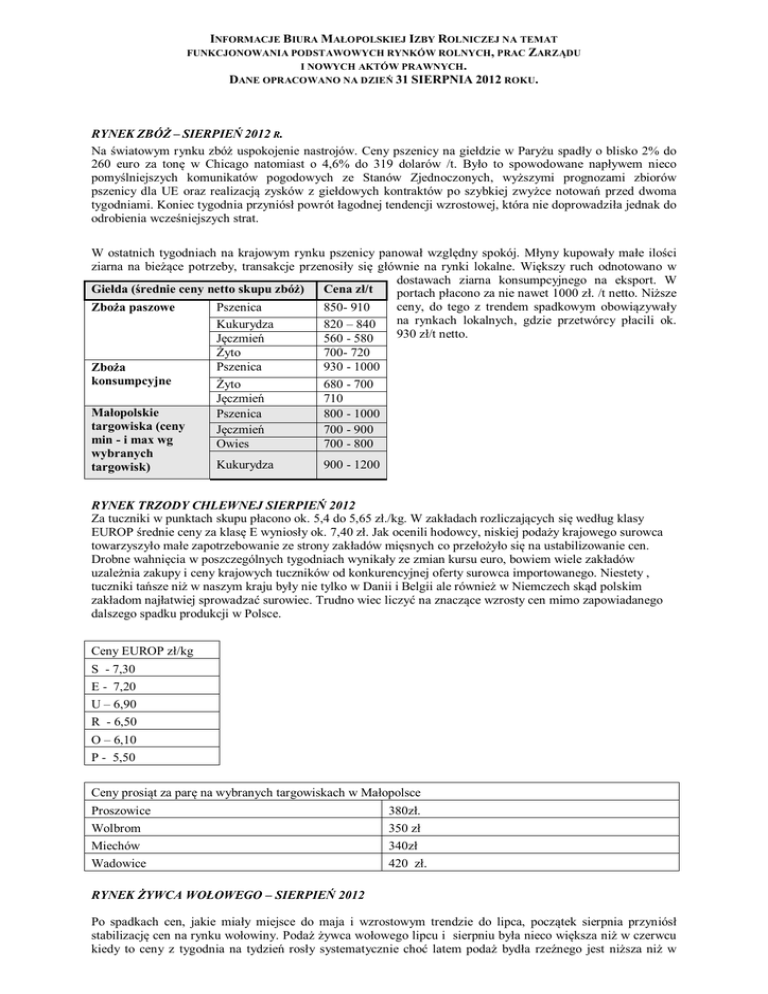 INFORMACJE BIURA MAŁOPOLSKIEJ IZBY ROLNICZEJ NA TEMAT FUNKCJONOWANIA PODSTAWOWYCH RYNKÓW ROLNYCH, PRAC ZARZĄDU I NOWYCH AKTÓW PRAWNYCH. DANE OPRACOWANO NA DZIEŃ 31 SIERPNIA 2012 ROKU. RYNEK ZBÓŻ – SIERPIEŃ 2012 R. Na światowym rynku zbóż uspokojenie nastrojów. Ceny pszenicy na giełdzie w Paryżu spadły o blisko 2% do 260 euro za tonę w Chicago natomiast o 4,6% do 319 dolarów /t. Było to spowodowane napływem nieco pomyślniejszych komunikatów pogodowych ze Stanów Zjednoczonych, wyższymi prognozami zbiorów pszenicy dla UE oraz realizacją zysków z giełdowych kontraktów po szybkiej zwyżce notowań przed dwoma tygodniami. Koniec tygodnia przyniósł powrót łagodnej tendencji wzrostowej, która nie doprowadziła jednak do odrobienia wcześniejszych strat. W ostatnich tygodniach na krajowym rynku pszenicy panował względny spokój. Młyny kupowały małe ilości ziarna na bieżące potrzeby, transakcje przenosiły się głównie na rynki lokalne. Większy ruch odnotowano w dostawach ziarna konsumpcyjnego na eksport. W Giełda (średnie ceny netto skupu zbóż) Cena zł/t portach płacono za nie nawet 1000 zł. /t netto. Niższe ceny, do tego z trendem spadkowym obowiązywały Pszenica 850- 910 Zboża paszowe na rynkach lokalnych, gdzie przetwórcy płacili ok. Kukurydza 820 – 840 930 zł/t netto. Jęczmień 560 - 580 Żyto 700- 720 Pszenica 930 - 1000 Zboża konsumpcyjne Żyto 680 - 700 Jęczmień 710 Małopolskie Pszenica 800 - 1000 targowiska (ceny Jęczmień 700 - 900 min - i max wg Owies 700 - 800 wybranych Kukurydza 900 - 1200 targowisk) RYNEK TRZODY CHLEWNEJ SIERPIEŃ 2012 Za tuczniki w punktach skupu płacono ok. 5,4 do 5,65 zł./kg. W zakładach rozliczających się według klasy EUROP średnie ceny za klasę E wyniosły ok. 7,40 zł. Jak ocenili hodowcy, niskiej podaży krajowego surowca towarzyszyło małe zapotrzebowanie ze strony zakładów mięsnych co przełożyło się na ustabilizowanie cen. Drobne wahnięcia w poszczególnych tygodniach wynikały ze zmian kursu euro, bowiem wiele zakładów uzależnia zakupy i ceny krajowych tuczników od konkurencyjnej oferty surowca importowanego. Niestety , tuczniki tańsze niż w naszym kraju były nie tylko w Danii i Belgii ale również w Niemczech skąd polskim zakładom najłatwiej sprowadzać surowiec. Trudno wiec liczyć na znaczące wzrosty cen mimo zapowiadanego dalszego spadku produkcji w Polsce. Ceny EUROP zł/kg S - 7,30 E - 7,20 U – 6,90 R - 6,50 O – 6,10 P - 5,50 Ceny prosiąt za parę na wybranych targowiskach w Małopolsce Proszowice 380zł. Wolbrom 350 zł Miechów 340zł Wadowice 420 zł. RYNEK ŻYWCA WOŁOWEGO – SIERPIEŃ 2012 Po spadkach cen, jakie miały miejsce do maja i wzrostowym trendzie do lipca, początek sierpnia przyniósł stabilizację cen na rynku wołowiny. Podaż żywca wołowego lipcu i sierpniu była nieco większa niż w czerwcu kiedy to ceny z tygodnia na tydzień rosły systematycznie choć latem podaż bydła rzeźnego jest niższa niż w innych okresach. Dlatego też nie powinniśmy się spodziewać spadków cen. Najprawdopodobniej będą one stabilne choć nie wykluczone są delikatne wzrosty. Ceny żywca wołowego w handlu targowiskowym w Małopolsce (dane wg MRiRW) Sierpień 2012r. Jałówki w (zł/kg) 5,50 Krowy mleczne (zł/kg 6,00 Cielęta 60-100 kg (zł/kg) 11,00 Krowy wybrakowane (zł/kg) 4,40 CENY WARZYW SIERPIEŃ 2012 W 2012 roku produkcja warzyw gruntowych, według prognoz IERiGŻ-PIB może wynieść 4,56 mln t, i będzie niższa niż w roku poprzednim, kiedy ukształtowała się na poziomie 4,8 mln t. Cena cebuli jest o około 3 proc. wyższa niż rok temu. Według szacunków Instytutu, areał zajęty pod uprawę warzyw gruntowych w 2012 roku może wynieść 175 tys. ha, wobec 178,8 tys. ha w roku poprzednim. W największym stopniu przyczyni się do tego spadek areału upraw cebuli i kapusty. Ze względu na niską opłacalność produkcji tych warzyw w minionym sezonie, spowodowanej nienajlepszą sytuacją cenową, oczekuje się, że część producentów mogła zaniechać prowadzenia upraw. Zmniejszenie produkcji może sprzyjać podwyżkom cen warzyw w sezonie 2012/2013. Obecnie cena cebuli wczesnej obcinanej według danych Ministerstwa Rolnictwa wynosi 1,48 zł/kg w skupie prowadzonym przez spółdzielnie ogrodnicze, czyli o niespełna 3 proc. więcej niż rok wcześniej. Cena kilograma kapusty białej wczesnej jest o 0,17 zł wyższa i wynosi 0,98 zł. Należy jednak pamiętać, że wiele czynników, zwłaszcza pogodowych, może wpłynąć na ostateczny poziom tegorocznych zbiorów, w tym również na ceny warzyw w kolejnych miesiącach. Mimo dość niekorzystnych warunków dla producentów warzyw spod osłon 2011 roku, szczególnie pod kątem cenowym, powierzchnia ich uprawy nie zmieni się diametralnie. Tym samym prognozowana wielkość produkcji warzyw spod osłon ukształtuje się na poziomie zbliżonym do roku poprzedniego i wyniesie łącznie 770 tys. Ceny kapusty w spółdzielniach ogrodniczych zł/szt Kapusta biała Kapusta włoska Kapusta czerwona Kapusta pekińska 1,30 2,40 1.10 2,10 CENY OWOCÓW SIERPIEŃ 201 Tegoroczny sezon skupu jabłek przemysłowych zaczął się cenami nieco wyższymi niż przed rokiem Ostatnie spadki można tłumaczyć większą podażą jabłek, związaną z nie oczekiwanym wysokim plonowaniem drzew jabłoni w tym roku. Ponadto, jak wskazują analizy TRSK, relatywnie większy może być udział jabłek przemysłowych w łącznych zbiorach tych owoców ze względu na szkody wyrządzone gradobiciem oraz przymrozkami. Ceny z małopolskich targowisk Towar Proszowice N. Targ Jabłka 2,00 2.00 Cebula 3.50 Pietruszka 1,70 3.50 Ziemniaki 0,20 Pomidory 3,00 2,50 Kalafior 2,50 Ogórki 1,50 1,50 Pszenica Jęczmień Owies Kukurydza 85,00 75,00 80.00 100,00 90,00 80,00 110,00 Gorlice 1,80 1.20 0,50 2.50 3,00 1.80 90.00 70,00 N. Sącz 0,70 3,00 2,50 1,50 100,00 90,00 90,00 Rybitwy 2,00 0,60 2,00 2.50 3,00 1,50 Tarnów 2,50 1.
