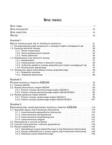 Spis treści Spis tabel . . . . . . . . . . . . . . . . . . . . . . . . . . . . . . . . . . . . . . Spis rysunków . . . . . . . . . . . . . . . . . . . . . . . . . . . . . . . . . . . Spis skrótów . . . . . . . . . . . . . . . . . . . . . . . . . . . . . . . . . . . Wstęp . . . . . . . . . . . . . . . . . . . . . . . . . . . . . . . . . . . . . . . . 7 10 12 15 Rozdział 1 Kraje rozwijające się w teoriach rozwoju . . . . . . . . . . . . . . . . 1.1. Konceptualizacja pojęć związanych z rozwojem krajów rozwijających się . . . . 1.2. Ewolucja ekonomii rozwoju . . . . . . . . . . . . . . . . . . . . . . . . . . . . 1.2.1. Teorie modernizacji . . . . . . . . . . . . . . . . . . . . . . . . . . . . 1.2.2. Teorie podstawowych potrzeb . . . . . . . . . . . . . . . . . . . . . . . 1.2.3. Teorie zależności . . . . . . . . . . . . . . . . . . . . . . . . . . . . . 1.3. Współczesne nurty ekonomii rozwoju . . . . . . . . . . . . . . . . . . . . . . 1.3.1. Neoliberalizm . . . . . . . . . . . . . . . . . . . . . . . . . . . . . . . 1.3.2. Instytucjonalny wymiar w ekonomii rozwoju . . . . . . . . . . . . . . . 1.3.3. Kulturowy aspekt w rozwoju gospodarczym krajów rozwijających się . . 1.3.4. Rozwój przez globalizację . . . . . . . . . . . . . . . . . . . . . . . . . 1.4. Teoretyczne ujęcie kwantyfikacji rozwoju gospodarczego . . . . . . . . . . . . 1.4.1. Wskaźniki ilościowe . . . . . . . . . . . . . . . . . . . . . . . . . . . . 1.4.2. Wskaźniki jakościowe . . . . . . . . . . . . . . . . . . . . . . . . . . 21 23 29 30 33 34 36 37 38 42 43 46 47 49 Rozdział 2 Poziom rozwoju państw ASEAN . . . . . . . . . . . . . . . . . . . . . . . 2.1. Geneza ASEAN . . . . . . . . . . . . . . . . . . . . . . . . . . . . . . . . . . 2.2. Rozwój ekonomiczny krajów ASEAN . . . . . . . . . . . . . . . . . . . . . . . 2.2.1. Poziom rozwoju ekonomicznego krajów ASEAN-5 . . . . . . . . . . . . 2.2.2. Poziom rozwoju ekonomicznego krajów ASEAN-BCMLV . . . . . . . . . 2.3. Rozwój społeczny krajów ASEAN . . . . . . . . . . . . . . . . . . . . . . . . 2.3.1. Poziom rozwoju społecznego krajów ASEAN-5 . . . . . . . . . . . . . . 2.3.2. Poziom rozwoju społecznego krajów ASEAN-BCMLV . . . . . . . . . . 75 75 83 83 90 94 95 107 Rozdział 3 Endogeniczne uwarunkowania rozwoju państw ASEAN . . . . . . . . 119 3.1. Specyfika regionu Azji Południowo-Wschodniej . . . . . . . . . . . . . . . . . . 119 3.1.1. Uwarunkowania geograficzno-historyczne . . . . . . . . . . . . . . . . . 119 3.1.2. Uwarunkowania demograficzne . . . . . . . . . . . . . . . . . . . . . . 121 3.1.3. Uwarunkowania etnolingwistyczne . . . . . . . . . . . . . . . . . . . . 122 3.1.4. Uwarunkowania religijne . . . . . . . . . . . . . . . . . . . . . . . . . 127 3.2. Wyposażenie w czynniki produkcji . . . . . . . . . . . . . . . . . . . . . . . . 127 3.3. Czynniki instytucjonalne i wolności gospodarcze . . . . . . . . . . . . . . . . . 135 3.4. Ryzyko katastroficzne . . . . . . . . . . . . . . . . . . . . . . . . . . . . . . . 142 3.4.1. Identyfikacja ryzyka katastroficznego w Azji Południowo-Wschodniej . . 144 3.4.2. Ryzyko katastroficzne a rozwój regionu Azji Południowo-Wschodniej . . 148 3.4.3. Redukcja ryzyka katastroficznego . . . . . . . . . . . . . . . . . . . . 150 Rozdział 4 Egzogeniczne uwarunkowania rozwoju państw ASEAN . . . . . . . . 4.1. Wymiana handlowa . . . . . . . . . . . . . . . . . . . . . . . . . . . . . . . . 4.1.1. Rozmiary i dynamika wymiany handlowej krajów ASEAN . . . . . . . . 4.1.2. Główni partnerzy handlowi krajów ASEAN . . . . . . . . . . . . . . . . 4.1.3. Struktura towarowa wymiany handlowej krajów ASEAN . . . . . . . . . 4.2. Zagraniczne inwestycje bezpośrednie . . . . . . . . . . . . . . . . . . . . . . 4.2.1. Rozmiary i dynamika ZIB w krajach ASEAN . . . . . . . . . . . . . . . 4.2.2. Kierunki przepływu ZIB w krajach ASEAN . . . . . . . . . . . . . . . . 4.2.3. Struktura branżowa ZIB w krajach ASEAN . . . . . . . . . . . . . . . . 4.2.4. Znaczenie ZIB dla rozwoju krajów ASEAN . . . . . . . . . . . . . . . . 4.3. Rynki finansowe . . . . . . . . . . . . . . . . . . . . . . . . . . . . . . . . . 4.4. Pomoc gospodarcza na rzecz rozwoju . . . . . . . . . . . . . . . . . . . . . . 4.4.1. Dystrybucja pomocy gospodarczej na rzecz rozwoju w krajach ASEAN 4.4.2. Efektywność pomocy gospodarczej na rzecz rozwoju w krajach ASEAN 152 152 152 164 172 187 188 192 193 195 201 212 215 220 Zakończenie . . . . . . . . . . . . . . . . . . . . . . . . . . . . . . . . . . . . Bibliografia . . . . . . . . . . . . . . . . . . . . . . . . . . . . . . . . . . . . Aneks . . . . . . . . . . . . . . . . . . . . . . . . . . . . . . . . . . . . . . . . 222 229 240