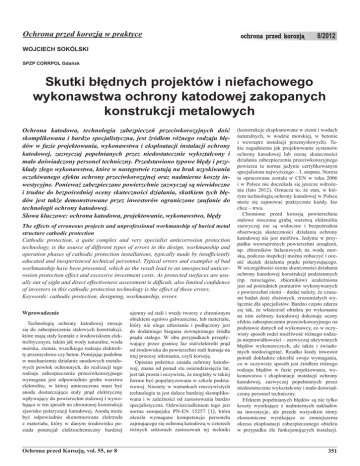 Ochrona przed korozją w praktyce ochrona przed korozja 8/2012 WOJCIECH SOKÓLSKI SPZP CORRPOL Gdańsk Skutki błędnych projektów i niefachowego wykonawstwa ochrony katodowej zakopanych konstrukcji metalowych Ochrona katodowa, technologia zabezpieczeń przeciwkorozyjnych dość skomplikowana i bardzo specjalistyczna, jest źródłem różnego rodzaju błędów w fazie projektowania, wykonawstwa i eksploatacji instalacji ochrony katodowej, zazwyczaj popełnianych przez niedostatecznie wykształcony i mało doświadczony personel techniczny. Przedstawiono typowe błędy i przykłady złego wykonawstwa, które w następstwie rzutują na brak uzyskiwania oczekiwanego efektu ochrony przeciwkorozyjnej oraz nadmierne koszty inwestycyjne. Ponieważ zabezpieczane powierzchnie zazwyczaj są niewidoczne i trudne do bezpośredniej oceny skuteczności działania, skutkiem tych błędów jest także demonstrowane przez inwestorów ograniczone zaufanie do technologii ochrony katodowej. Słowa kluczowe: ochrona katodowa, projektowanie, wykonawstwo, błędy The effects of erroneous projects and unprofessional workmanship of buried metal structure cathodic protection Cathodic protection, a quite complex and very specialist anticorrosion protection technology, is the source of different types of errors in the design, workmanship and operation phases of cathodic protection installations, typically made by insufficiently educated and inexperienced technical personnel. Typical errors and examples of bad workmanship have been presented, which as the result lead to an unexpected anticorrosion protection effect and excessive investment costs. As protected surfaces are usually out of sight and direct effectiveness assessment is difficult, also limited confidence of investors in this cathodic protection technology is the effect of these errors. Keywords: cathodic protection, designing, workmanship, errors Wprowadzenie Technologię ochrony katodowej stosuje się do zabezpieczenia stalowych konstrukcji, które mają stały kontakt z środowiskiem elektrolitycznym, takim jak wody naturalne, woda morska, ziemia, wszelkiego rodzaju elektrolity przemysłowe czy beton. Pomijając podobne w mechanizmie działanie anodowych metalowych powłok ochronnych, do realizacji tego rodzaju zabezpieczenia przeciwkorozyjnego wymagana jest odpowiednio gruba warstwa elektrolitu, w której umieszczona musi być anoda dostarczająca stały prąd elektryczny wpływający do powierzchni stalowej i wywołująca w ten sposób na chronionej konstrukcji zjawisko polaryzacji katodowej. Anodą może być odpowiednio skonstruowana elektroda z materiału, który w danym środowisku posiada potencjał elektrochemiczny bardziej Ochrona przed Korozją, vol. 55, nr 8 ujemny od stali i wtedy tworzy z chronionym obiektem ogniwo galwaniczne, lub materiału, który nie ulega utlenianiu i podłączony jest do dodatniego bieguna zewnętrznego źródła prądu stałego. W obu przypadkach przepływający przez granicę faz stal/elektrolit prąd od środowiska do powierzchni stali hamuje na niej procesy utleniania, czyli korozję. Opisana pokrótce zasada ochrony katodowej, znana od ponad stu osiemdziesięciu lat, jest tak prosta i oczywista, że mogłaby w takiej formie być popularyzowana w szkole podstawowej. Niestety w warunkach rzeczywistych technologia ta jest dalece bardziej skomplikowana i w zależności od zastosowania bardzo specjalistyczna. Odzwierciedleniem tego jest norma europejska PN-EN 15257 [1], która określa wymagane kompetencje personelu zajmującego się ochroną katodową w czterech różnych sektorach zastosowań tej techniki (konstrukcje eksploatowane w ziemi i wodach naturalnych, w wodzie morskiej, w betonie i wewnątrz instalacji przemysłowych). Takie zagadnienia jak projektowanie systemów ochrony katodowej lub ocenę skuteczności działania zabezpieczenia przeciwkorozyjnego powierza ta norma jedynie certyfikowanym specjalistom najwyższego – 3. stopnia. Norma ta opracowana została w CEN w roku 2006 i w Polsce nie doczekała się jeszcze wdrożenia (lato 2012). Oznacza to, że stan, w którym technologią ochrony katodowej w Polsce może się zajmować praktycznie każdy, kto chce – trwa. Chronione przed korozją powierzchnie stalowe otoczone grubą warstwą elektrolitu zazwyczaj nie są widoczne i bezpośrednia obserwacja skuteczności działania ochrony katodowej nie jest możliwa. Jedynie w przypadku wewnętrznych powierzchni urządzeń, np. zbiorników balastowych na wodę morską, podczas inspekcji można zobaczyć i ocenić skutek działania prądu polaryzującego. W szczególności ocena skuteczności działania ochrony katodowej konstrukcji podziemnych (np. rurociągów, zbiorników) uzależniona jest od pośrednich pomiarów wykonywanych z powierzchni ziemi – dodać należy, że czasami badań dość złożonych, zrozumiałych wyłącznie dla specjalistów. Bardzo często zdarza się tak, że właściciel obiektu po wykonaniu na nim ochrony katodowej dokonuje oceny efektu zabezpieczenia przeciwkorozyjnego na podstawie danych od wykonawcy, co w oczywisty sposób rodzi możliwość różnego rodzaju nieprawidłowości – zazwyczaj ukrywanych błędów wykonawczych, ale także i świadomych niedociągnięć. Rzadko kiedy inwestor potrafi dokładnie określić swoje wymagania, co w oczywisty sposób jest źródłem różnego rodzaju błędów w fazie projektowania, wykonawstwa i eksploatacji instalacji ochrony katodowej, zazwyczaj popełnianych przez niedostatecznie wykształcony i mało doświadczony personel techniczny. Efektem popełnianych błędów są nie tylko koszty wynikające z nadmiernych nakładów na inwestycje, ale przede wszystkim straty ekonomiczne wynikające ze zmniejszenia okresu eksploatacji zabezpieczanego obiektu w przypadku źle funkcjonujących instalacji. 351 Efektem pośrednim, także bardzo ważnym i odczuwalnym w praktyce, jest ograniczenie zaufania w środowisku technicznym do technologi