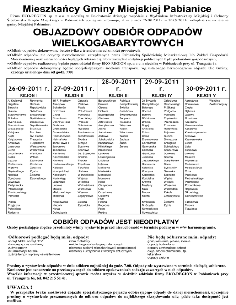 Mieszkańcy Gminy Miejskiej Pabianice Firma EKO-REGION sp. z o.o. z siedzibą w Bełchatowie działając wspólnie z Wydziałem Infrastruktury Miejskiej i Ochrony Środowiska Urzędu Miejskiego w Pabianicach uprzejmie informuje, iż w dniach 26.09.2011r. – 30.09.2011r. odbędzie się na terenie gminy Miejskiej Pabianice: OBJAZDOWY ODBIÓR ODPADÓW WIELKOGABARYTOWYCH • Odbiór odpadów dokonywany będzie tylko z terenów nieruchomości prywatnych, • Odbiór odpadów nie dotyczy nieruchomości zarządzanych przez Pabianicką Spółdzielnię Mieszkaniową lub Zakład Gospodarki Mieszkaniowej oraz nieruchomości będących własnością lub w zarządzie instytucji publicznych bądź podmiotów gospodarczych, • Odbiór odpadów realizowany będzie przez oddział firmy EKO-REGION sp. z o.o. z siedzibą w Pabianicach przy ul. Traugutta 6a • Odbiór odpadów dokonywany będzie specjalistycznymi środkami transportu, wg ustalonego harmonogramu objazdu ulic Gminy, każdego ustalonego dnia od godz. 7:00 26-09-2011 r. 27-09-2011 r. REJON I A. Krajowej Bagatela Barucha Brauna Brzoskwiniowa Chłodna Cyprysowa Czereśniowa Głowackiego Kolejowa Kręta Księżycowa Kwiatowa Lazurowa Letnia Lutomierska Łaska Łączna Mickiewicza Miętowa Napierskiego Nieduża Ogrodowa Oliwkowa Partyzancka Piłsudskiego Poniatowskiego Północna Reymonta Różana Rypułtowicka Składowa Słowackiego Spółdzielcza Szczęśliwa Szynkielewska Śliwkowa Św. Jana Św. Rocha Traugutta Tulipanowa Warszawska Widzewska Wiśniowa Witosa Zachodnia Zamkowa Zdrojowa Zgoda Żelazna Żeromskiego Prosta Przyjazna Pułaskiego Radosna REJON II 15 P. Piechoty Akacjowa Bohaterów Brzozowa Cicha Cmentarna Dąbrowskiego Grabowa Gromadzka Grunwaldzka Hermanowska Hetmańska Jana Pawła II Jaworowa Jesionowa Kamienna Kasztelańska Klonowa Kochanowskiego Kolbego Konopnickiej Kościuszki Kunickiego Lecznicza Ludowa Matejki Mielczarskiego Miodowa Ostatnia Parkowa Pawia Południowa Pomorska Pow. W-wy Przejazd Robotnicza Rycerska Sienkiewicza Skłodowskiej Skośna Skrajna Sosnowa Sportowa Sz. Szeregów Średnia Tkacka Topolowa Toruńska Ułańska Waryńskiego Wiejska Wileńska Wolnościowa Wrzosowa Wysoka Zagajnikowa Narutowicza Niecała Nowa Odrodzenia Zielona Żytowicka 28-09-2011 r. 29-09-2011 r. 30-09-2011 r. REJON III REJON IV REJON V Bardowskiego Bukowa Cisowa Eichlera Ewangelicka Glebowa Jałowcowa Jarzębinowa Jasna Jaśminowa Jodłowa Jutrzkowicka Kasztanowa Kilińskiego Krakowska Laskowa Leszczynowa Liściasta Łąkowa Malinowa Mariańska Moniuszki Morwowa Niska Olszynowa Orla Orzechowa Osikowa PCK Piękna Pogodna Polna Próżna Rolnicza Sempołowskiej Świątka Świerkowa Świętokrzyska Targowa Trębacka Wiązowa Widok Wierzbowa Wodna Zacisze Żabia Żniwna 20 Stycznia Baczyńskiego Batorego Boczna Borowa Bóźniczna Bracka Bugaj Chmielna Dobra Dolna Drewnowska Garncarska Gawrońska Gdańska Graniczna Jesienna Jaszuńskiego Kazimierza Kolonijna Konopna Kopernika Kościelna Krzywa Majdany Mała Modra Mokra Osiedlowa Ossowskiego P. Skargi Podgórna Podleśna Popławska Poprzeczna Prosnaka Rydzyńska Sejmowa Sienna Słoneczna Smugowa Sobieskiego Spacerowa Spokojna Sporna Stary Rynek Stara Sybiraków Szewska Szpitalna Wąska Willowa Wiosenna Wschodnia Zakole Zaradzyńska Agrestowa Chmielowa Ciepła Dębowa Gajowa Gruntowa Kapliczna Karniszewicka Kąkolowa Konstantynowska Kresowa Ksawerowska Leśna Lisia Łubinowa Łukowa Makowa Młynarska Modrakowa Modrzewiowa Orna Piaskowa Pietrusińskiego Podmiejska Poziomkowa Rzgowska Sikorskiego Słonecznikowa Myśliwska N. Gryzla Nawrockiego Nowowolska Żwirowa Żytnia Tatarkowa Torowa Trawiasta Wspólna Żwirki i Wigury ODBIÓR ODPADÓW JEST NIEODPŁATNY Osoby posiadające zbędne przedmioty winny wystawić je przed nieruchomość w terminie podanym w w/w harmonogramie. Odbiorowi podlegać będą m.in. odpady: Nie będą odbierane m.in. odpady: sprzęt AGD i sprzęt RTV domowy sprzęt sanitarny zużyte opony akumulatory i baterie zużyte lampy i oprawy oświetleniowe gruz, kamienie, piasek, ziemia odpady budowlane odpady zawierające azbest oleje, środki chemiczne, itp. lekarstwa odpady zielone złom metalowy meble i wyposażenie gosp. domowych elementy stolarki mieszkaniowej i gospodarczej elementy i urządzenia z tworzyw sztucznych Prosimy o wystawienie odpadów w dniu odbioru najpóźniej do godz. 7.00. Odpady nie wystawione w terminie nie będą zabierane. Konieczne jest oznaczenie na przekazywanych do odbioru opakowaniach rodzaju zawartych w nich odpadów. Wszelkie informacje w przedmiotowej sprawie można uzyskać w siedzibie oddziału firmy EKO-REGION w Pabianicach przy ul. Traugutta 6a, tel. 042 215 51 41. UWAGA ! W przypadku braku możliwości dojazdu specjalistycznego pojazdu odbierającego odpady do danej nieruchomości, uprzejmie prosimy o wystawienie przeznaczonych do odbioru odpadów do najbliższego skrzyżowania ulic, gdzie taka dostępność jest możliwa.