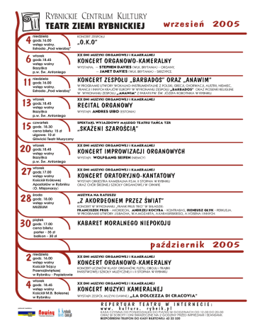 wrzesieñ 2005 TEATR ZIEMI RYBNICKIEJ 4 niedziela godz.16.00 wstêp wolny. Estrada „Pod wierzb¹” KONCERT ZESPO£U 6 wtorek godz.18.45 wstêp wolny Bazylika p.w. Œw. Antoniego XX DNI MUZYKI ORGANOWEJ i KAMERALNEJ niedziela godz.16.00 wstêp wolny. Estrada „Pod wierzb¹” KONCERT ZESPO£U „BARBADOS” ORAZ „ANAWIM” 11 13 15 20 27 28 30 „O.K.O” KONCERT ORGANOWO-KAMERALNY WYST¥PI¥: – STEPHEN DAVIES (WLK. BRYTANIA) - ORGANY, – JANET DAVIES (WLK. BRYTANIA) - SKRZYPCE. W PROGRAMIE UTWORY WOKALNO-INSTRUMENTALNE Z POLSKI, GRECJI, CHORWACJI, AUSTRII, NIEMIEC, FRANCJI I INNYCH KRAJÓW EUROPY W WYKONANIU ZESPO£U „BARBADOS” ORAZ PIOSENKI RELIGIJNE W WYKONANIU ZESPO£U „ANAWIM” Z PARAFII PW. ŒW. JÓZEFA ROBOTNIKA W RYBNIKU. wtorek godz.18.45 wstêp wolny Bazylika p.w. Œw. Antoniego XX DNI MUZYKI ORGANOWEJ i KAMERALNEJ czwartek godz. 18.30 cena biletu: 15 z³ ulgowe: 10 z³ Gliwicki Teatr Muzyczny SPEKTAKL WYJAZDOWY MA£EGO TEATRU TAÑCA TZR wtorek godz.18.45 wstêp wolny Bazylika p.w. Œw. Antoniego wtorek godz.17.00 wstêp wolny Koœció³ Królowej Aposto³ów w Rybniku (O. Misjonarzy) œroda godz. 18.00 wstêp wolny MUZEUM pi¹tek godz. 17.00 cena biletu: parter - 35 z³ balkon - 30 z³ RECITAL ORGANOWY WYST¥PI: ANDRES UIBO (ESTONIA) „SKA¯ENI SZAROŒCI¥” XX DNI MUZYKI ORGANOWEJ i KAMERALNEJ KONCERT IMPROWIZACJI ORGANOWYCH WYST¥PI: WOLFGANG SEIFEN (NIEMCY) XX DNI MUZYKI ORGANOWEJ i KAMERALNEJ KONCERT ORATORYJNO-KANTATOWY WYST¥PI ORKIESTRA KAMERALNA P.S.M. II STOPNIA W RYBNIKU ORAZ CHÓR ŒREDNIEJ SZKO£Y ORGANOWEJ W OPAWIE MUZYKA NA RATUSZU „Z AKORDEONEM PRZEZ ŒWIAT” KONCERT W WYKONANIU „FRANK PRUS TRIO” W SK£ADZIE: FRANCISZEK PRUS - AKORDEON, ANDRZEJ KOCYBA - KONTRABAS, IRENEUSZ G£YK - PERKUSJA. W PROGRAMIE UTWORY: J.S.BACHA, W.A.MOZARTA, A.KARASIÑSKIEGO, A.VOSENA I INNYCH. KABARET MORALNEGO NIEPOKOJU paŸdziernik 2005 2 4 patronat medialny: niedziela godz. 16.00 wstêp wolny Koœció³ Trójcy Przenajœwiêtszej w Rybniku - Popielowie wtorek godz. 18.45 wstêp wolny Koœció³ M.B. Bolesnej w Rybniku XX DNI MUZYKI ORGANOWEJ i KAMERALNEJ KONCERT ORGANOWO-KAMERALNY KONCERT UCZNIÓW KLASY ORGANÓW, FLETU, OBOJU i TR¥BKI PAÑSTWOWEJ SZKO£Y MUZYCZNEJ I i II STOPNIA W RYBNIKU XX DNI MUZYKI ORGANOWEJ i KAMERALNEJ KONCERT MUZYKI KAMERALNEJ WYST¥PI ZESPÓ£ MUZYKI DAWNEJ „LA DOLCEZZA DI CRACOVIA” REPERTUAR TEATRU W INTERNECIE: www. kultura. rybnik.pl KASA CZYNNA OD PONIEDZIA£KU DO PI¥TKU W GODZINACH OD 12.00 DO 20.00 ORAZ W SOBOTY I DNI ŒWI¥TECZNE NA 2 GODZINY PRZED IMPREZAMI I SEANSAMI. BEZPOŒREDNI TELEFON DO KASY BILETOWEJ: 42 22 320
