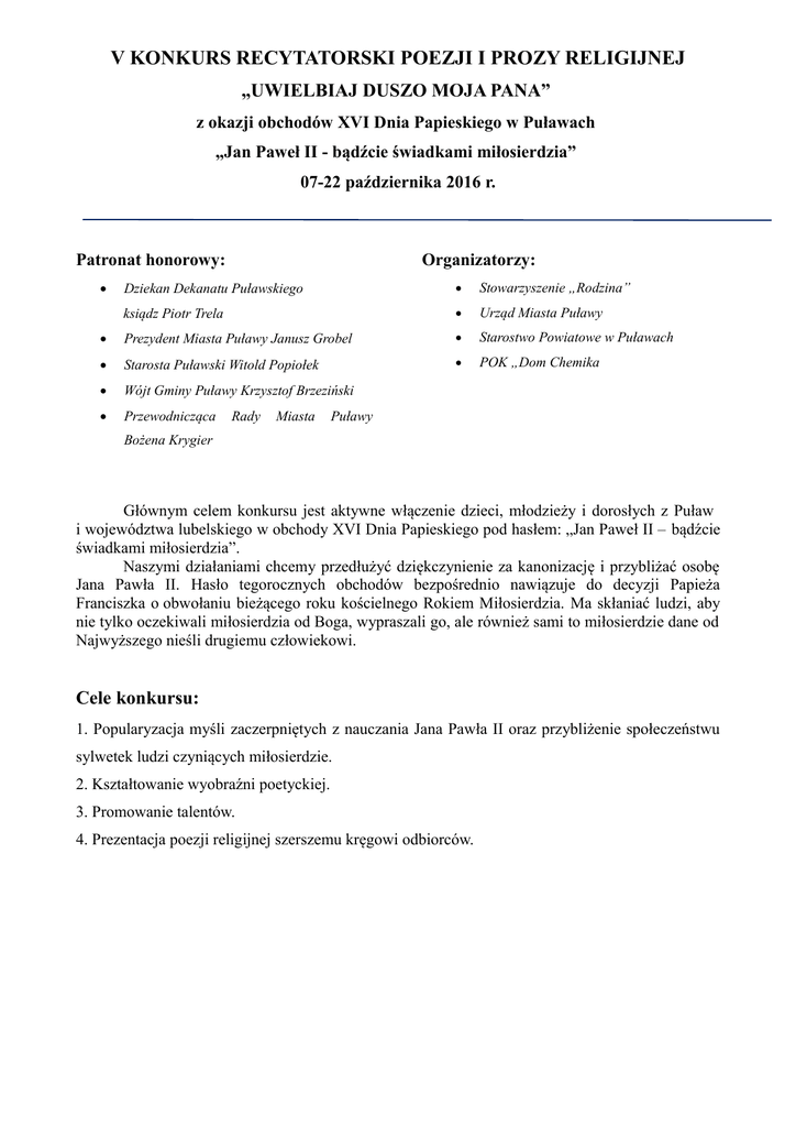 V KONKURS RECYTATORSKI POEZJI I PROZY RELIGIJNEJ „UWIELBIAJ DUSZO MOJA PANA” z okazji obchodów XVI Dnia Papieskiego w Puławach „Jan Paweł II - bądźcie świadkami miłosierdzia” 07-22 października 2016 r. Patronat honorowy: Organizatorzy: Dziekan Dekanatu Puławskiego Stowarzyszenie „Rodzina” ksiądz Piotr Trela Urząd Miasta Puławy Prezydent Miasta Puławy Janusz Grobel Starostwo Powiatowe w Puławach Starosta Puławski Witold Popiołek POK „Dom Chemika Wójt Gminy Puławy Krzysztof Brzeziński Przewodnicząca Rady Miasta Puławy Bożena Krygier Głównym celem konkursu jest aktywne włączenie dzieci, młodzieży i dorosłych z Puław i województwa lubelskiego w obchody XVI Dnia Papieskiego pod hasłem: „Jan Paweł II – bądźcie świadkami miłosierdzia”. Naszymi działaniami chcemy przedłużyć dziękczynienie za kanonizację i przybliżać osobę Jana Pawła II. Hasło tegorocznych obchodów bezpośrednio nawiązuje do decyzji Papieża Franciszka o obwołaniu bieżącego roku kościelnego Rokiem Miłosierdzia. Ma skłaniać ludzi, aby nie tylko oczekiwali miłosierdzia od Boga, wypraszali go, ale również sami to miłosierdzie dane od Najwyższego nieśli drugiemu człowiekowi. Cele konkursu: 1. Popularyzacja myśli zaczerpniętych z nauczania Jana Pawła II oraz przybliżenie społeczeństwu sylwetek ludzi czyniących miłosierdzie. 2. Kształtowanie wyobraźni poetyckiej. 3. Promowanie talentów. 4. Prezentacja poezji religijnej szerszemu kręgowi odbiorców. V KONKURS RECYTATORSKI POEZJI I PROZY RELIGIJNEJ „UWIELBIAJ DUSZO MOJA PANA” z okazji obchodów XVI Dnia Papieskiego w Puławach „Jan Paweł II- bądźcie świadkami miłosierdzia” 07-22 października 2016 r. REGULAMIN I. Adresaci Zapraszamy do konkursu przedszkolaków, uczniów szkół podstawowych, gimnazjów i szkół średnich, studentów i wszystkich dorosłych miłośników recytacji z terenu miasta Puławy oraz województwa lubelskiego. II. Założenia programowe Zapraszamy recytatorów i ich instruktorów do poszukiwań repertuarowych wokół tematu: Jan Paweł II – bądźcie świadkami miłosierdzia”. Uczestnicy prezentują repertuar z zakresu literatury religijnej, polskiej jak i obcej. Zachęcamy do wyboru tekstów ciekawych i wartościowych literacko. Recytatorzy prezentują jeden dowolnie wybrany utwór poetycki lub prozatorski Łączny nieprzekraczalny czas prezentacji: uczniowie szkół podstawowych - do 5 minut, starsi - do 7 minut. Organizator zastrzega sobie prawo do przerywania dłuższych prezentacji. III. Kryteria oceny Oceny prezentacji konkursowych dokona Jury powołane przez organizatora. Kryteria oceny: - wybór i dobór tekstu; - dostosowanie tekstu do możliwości wykonawczych i interpretacyjnych recytatora; - interpretacja utworu; - kultura słowa; - ogólny wyraz artystyczny Jury przyzna nagrody rzeczowe i wyróżnienia w poszczególnych grupach wiekowych: dzieci w wieku przedszkolnym dzieci ze szkół podstawowych: klasy I - III dzieci ze szkół podstawowych: klasy IV - VI młodzież gimnazjalna młodzież szkół średnich dorośli Wszyscy wykonawcy otrzymają pamiątkowe dyplomy. Werdykt jury jest niepodważalny. IV. Zasady organizacyjne i terminy 1. Karty zgłoszenia przyjmowane są do dnia 03 października 2016 r. do POK „Dom Chemika” do Pani Renaty Szczypy (pok.102). Zgłoszenia dostarczone po terminie nie biorą udziału w konkursie. 2. Konkurs odbędzie się 07 października 2016 r. o godz. 9.00 w sali 131 Puławskiego Ośrodka Kultury „Dom Chemika” 3. Ogłoszenie wyników i uroczyste wręczenie nagród Laureatom Konkursu odbędzie się dnia 16 października 2016 r. w sali widowiskowej POK „Domu Chemika”. 4. Szkoła/placówka może zgłosić maksymalnie po 5 recytatorów każdej kategorii wiekowej. Prosimy o przeprowadzenie eliminacji środowiskowych. V. Załączniki Nr 1 -karta zgłoszenia Nr 2 i 3 –oświadczenia Załącznik nr 1 V KONKURS RECYTATORSKI POEZJI I PROZY RELIGIJNEJ „UWIELBIAJ DUSZO MOJA PANA” z okazji obchodów XVI Dnia Papieskiego w Puławach „Jan Paweł II- bądźcie świadkami miłosierdzia” 07-22 października 2016 r. KARTA ZGŁOSZENIA Do udziału w konkursie w kategorii (właściwe podkreślić) a. dzieci przedszkolne b. dzieci ze szkoły podstawowej: klasy I - III c. dzieci ze szkoły podstawowej: klasy IV - VI d. młodzież gimnazjalna e. młodzież szkół średnich f. dorośli Tytuł i autor utworu, rodzaj (wiersz czy proza), czas trwania …....................................................................................................................................................... 1. Imię i nazwisko ….....................…................................................................................. 2. Klasa............................................................................................................................................... 3. Szkoła............................................................................................................................................. 4. Telefon do szkoły........................................................................................................................... 5. Adres szkoły................................................................................................................................... Imię i nazwisko zgłaszającego, tel. kontaktowy. .............................................................................................................. ........................................................ (Podpis opiekuna/katechety*) *zaznaczyć w przypadku katechetów Załącznik nr 2 V KONKURS RECYTATORSKI POEZJI I PROZY RELIGIJNEJ „UWIELBIAJ DUSZO MOJA PANA” z okazji obchodów XVI Dnia Papieskiego w Puławach „Jan Paweł II- bądźcie świadkami miłosierdzia” 07-22 października 2016 r. OŚWIADCZENIE RODZICA (wypełnia rodzic w przypadku udziału dziecka w konkursie) Wyrażam zgod