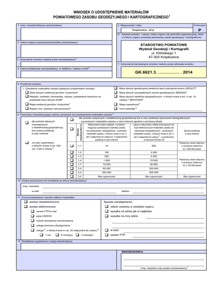 WNIOSEK O UDOSTĘPNIENIE MATERIAŁÓW POWIATOWEGO ZASOBU GEODEZYJNEGO I KARTOGRAFICZNEGO1 1. Imię i nazwisko/Nazwa wnioskodawcy 5. Miejscowość i data Formularz P Krapkowice, dnia 6. Adresat wniosku - nazwa i adres organu lub jednostki organizacyjnej, która w imieniu organu prowadzi państwowy zasób geodezyjny i kartograficzny 2. Adres miejsca zamieszkania/siedziby wnioskodawcy STAROSTWO POWIATOWE Wydział Geodezji i Kartografii ul. Kilińskiego 1 47-303 Krapkowice 3. Oznaczenie wniosku nadane przez wnioskodawcę** 7. Oznaczenie kancelaryjne wniosku nadane przez adresata wniosku 4. Dane kontaktowe wnioskodawcy: nr telefonu / adres e-mail** GK.6621.3. …………… . 2014 8. Przedmiot wniosku q q q 1. Określenie materiałów zasobu będących przedmiotem wniosku q Zbiór danych ewidencji gruntów i budynków q Rejestry, kartoteki, skorowidze, wykazy, zestawienia tworzone na 2 podstawie bazy danych EGiB3 Baza danych geodezyjnej ewidencji siecii uzbrojenia terenu (GESUT)6 Baza danych szczegółowych osnów geodezyjnych (BDSOG)7 Baza danych obiektów topograficznych, o której mowa w art. 4 ust. 1b ustawy12 (BDOT500)8 q Mapa ewidencji gruntów i budynków q Rejestr cen i wartości nieruchomości q q 4 5 Mapa zasadnicza9 Inne materiały10: 9. Parametry charakteryzujące zakres uprawnień do przetwarzania materiałów zasobu 11 q na cele i podmiotom, o których mowa w art. 40a ust. 2 pkt 2 ustawy12 q q q q q q q q q q dla potrzeb związanych z działalnością gospodarczą lub w celu publikacji opracowań kartograficznych - pochodnych materiałów zasobu w sieci Internet zgodnie z poniższą tabelą Maksymalna liczba urządzeń, na których Łączny maksymalny nakład drukowanych lub mogą być przetwarzane materiały zasobu kopii elektronicznych materiałów zasobu lub lub opracowania kartograficzne – pochodne opracowań kartograficznych – pochodnych Sposób publikacji w sieci Internet materiałów zasobu, o którym mowa w ust. 4 materiałów zasobu, o których mowa w ust. 4 12 pkt 2 załącznika do ustawy12, z wyłączeniem pkt 2 załącznika do ustawy , w przeliczeniu publikacji w sieci Internet na arkusze formatu A4 Pojedynczy obraz statyczny 1,1 10 500 o rozmiarze maksimum do 1 000 000 pikseli Wartość współczynnika CL q dla potrzeb własnych niezwiązanych z działalnością gospodarczą, bez prawa publikacji w sieci Internet 1,2 100 1,3 500 2 000 5 000 1,4 1 000 10 000 1,7 10 000 50 000 2,0 60 000 200 000 2,5 200 000 500 000 3,0 Bez ograniczeń Bez ograniczeń Pojedynczy obraz statyczny o rozmiarze maksimum do 2 100 000 pikseli Bez ograniczeń 10. Osoba wyznaczona do kontaktów ze strony wnioskodawcy* Imię, nazwisko: e-mail: telefon: 11. Forma przekazania i sposób odbioru materiałów q q postać nieelektroniczna Sposób udostępnienia: postać elektroniczna q q q q q serwer FTP/e-mail płyta CD/DVD q q q odbiór osobisty w siedzibie organu q q e-mail: wysyłka na adres jak w nagłówku wysyłka na inny adres nośnik zewnętrzny wnioskodawcy usługa sieciowa udostępniania usługa13, o której mowa w ust. 20 załącznika do ustawy12: q 1 rok q 6 miesięcy q 3 miesiące serwer FTP: 12. Dodatkowe wyjaśnienia i uwagi wnioskodawcy WNIOSKODAWCA Imię, nazwisko oraz podpis wnioskodawcy3 Przypisy: 1. 2. 3. 4. 5. 6. 7. 8. 9. 10. 11. 12. 13. Informacje o aktualnie dostępnych materiałach powiatowego zasobu geodezyjnego i kartograficznego udostępnia organ prowadzący ten zasób. Uszczegółowienie wniosku o udostępnienie zbioru danych EGiB zawiera formularz P1. Uszczegółowienie wniosku o udostępnienie rejestrów, kartotek, skorowidzów, wykazów, zestawień tworzonych na podstawie bazy danych EGiB zawiera formularz P2. Uszczegółowienie wniosku o udostępnienie mapy ewidencji gruntów i budynków zawiera formularz P3. Uszczegółowienie wniosku o udostępnienie rejestru cen i wartości nieruchomości zawiera formularz P4. Uszczegółowienie wniosku o udostępnienie zbiorów danych GESUT zawiera formularz P5. Uszczegółowienie wniosku o zbiorów danych BDSOG zawiera formularz P6. Uszczegółowienie wniosku o udostępnienie zbiorów danych bazy danych BDOT500 zawiera formularz P7. Uszczegółowienie wniosku o udostępnienie mapy zasadniczej zawiera formularz P3. Uszczegółowienie wniosku o o udostępnienie innych materiałów zawiera formularz P8. Dopuszczalne jest wskazanie tylko jednego celu. Ustawa z dnia 17 maja 1989 r. - Prawo geodezyjne i kartograficzne (Dz. U. z 2010 r. Nr 193, poz. 1287, z późn. zm.). Udostępnienie w formie okresowej usługi sieciowej ma zastosowanie w przypadku udostępniania ortofotomapy lub opracowań kartograficznych, tworzonych na podstawie odpowiednich baz danych, o których mowa w art. 4 ust. 1a pkt 1-3, 7, 8, 10, 11 lub ust. 1b ustawy - Prawo geodezyjne i kartograficzne. 14. Podpis odręczny, podpis elektroniczny, o którym mowa w art. 3 pkt 1 ustawy z dnia 18 września 2001 r. o podpisie elektronicznym (Dz. U. z 2013 r. poz. 262), bezpieczny podpis elektroniczny, o którym mowa w art. 3 pkt 2 ustawy z dnia 18 września 2001 r. o podpisie elektronicznym, podpis potwierdzony profilem zaufanym ePUAP, o którym mowa w art. 3 pkt 15 ustawy z dnia 17 lutego 2005 r. o informatyzacji działalności podmiotów realizujących zadania publiczne (Dz. U. z 2013 r. poz. 235, z późn. zm.), lub w przypadku składania wniosku za pomocą systemu teleinformatycznego, o którym mowa w przepisach wydanych na podstawie art. 40 ust. 8 ustawy - Prawo geodezyjne i kartograficzne, identyfikator umożliwiający weryfikację wnioskodawcy w tym systemie. * Informacja nieobowiązkowa. 1. Uszczegółowienie wniosku o udostępnienie zbiorów danych bazy danych EGiB Formularz P1 q q q q Pełny zbiór danych EGiB Zbiór przedmiotowych danych: q pełny q q opisowych dane opisowe dane geometryczne Zbiór dotyczący budynków: q pełny q q Zbiór danych EGiB dotyczących punktów granicznych q Zbiór danych EGiB opisowych i geometrycznych dotyczących konturów klasyfika