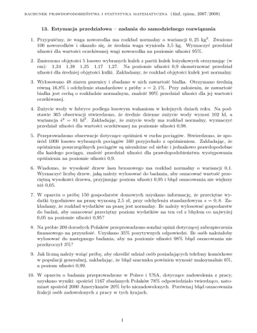 rachunek prawdopodobieństwa i statystyka matematyczna (4inf, rpism, 2007/2008) 13. Estymacja przedziałowa – zadania do samodzielnego rozwiązania 1. Przypuśćmy, że waga noworodka ma rozkład normalny o wariancji 0, 25 kg2 . Zważono 100 noworodków i okazało się, że średnia waga wyniosła 3,5 kg. Wyznaczyć przedział ufności dla wartości oczekiwanej wagi noworodka na poziomie ufności 95%. 2. Zmierzono objętości 5 losowo wybranych kulek z partii kulek łożyskowych otrzymując (w cm): 1,24 1,38 1,25 1,17 1,27. Na poziomie ufności 0,9 skonstruować przedział ufności dla średniej objętości kulki. Zakładamy, że rozkład objętości kulek jest normalny. 3. Wylosowano 48 ziaren pszenicy i zbadano w nich zawartość białka. Otrzymano średnią równą 16,8% i odchylenie standardowe z próby s = 2, 1%. Przy założeniu, że zawartość białka jest cechą o rozkładzie normalnym, znaleźć 99% przedział ufności dla jej wartości oczekiwanej. 4. Zużycie wody w fabryce podlega losowym wahaniom w kolejnych dniach roku. Na podstawie 365 obserwacji stwierdzono, że średnie dzienne zużycie wody wynosi 102 hl, a wariancja ŝ2 = 81 hl2 . Zakładając, że zużycie wody ma rozkład normalny, wyznaczyć przedział ufności dla wartości oczekiwanej na poziomie ufności 0,98. 5. Przeprowadzono obserwacje dotyczące opóźnień w ruchu pociągów. Stwierdzono, że spośród 1000 losowo wybranych pociągów 160 przyjechało z opóźnieniem. Zakładając, że opóźnienia poszczególnych pociągów są niezależne od siebie i jednakowo prawdopodobne dla każdego pociągu, znaleźć przedział ufności dla prawdopodobieństwa występowania opóźnienia na poziomie ufności 0,9. 6. Wiadomo, że wysokość drzew lasu brzozowego ma rozkład normalny o wariancji 0,1. Wyznaczyć liczbę drzew, jaką należy wylosować do badania, aby oszacować wartość przeciętną wysokości drzewa, przyjmując poziom ufności 0,95 i błąd oszacowania nie większy niż 0,05. 7. W oparciu o próbę 150 gospodarstw domowych uzyskano informację, że przeciętne wydatki tygodniowe na prasę wynoszą 2,5 zł, przy odchyleniu standardowym s = 0, 8. Zakładamy, że rozkład wydatków na prasę jest normalny. Ile należy wylosować gospodarstw do badań, aby oszacować przeciętny poziom wydatków na ten cel z błędem co najwyżej 0,05 na poziomie ufności 0,95? 8. Na próbie 200 dorosłych Polaków przeprowadzono sondaż opinii dotyczącej zabezpieczenia finansowego na przyszłość. Uzyskano 35% pozytywnych odpowiedzi. Ile osób należałoby wylosować do następnego badania, aby na poziomie ufności 98% błąd oszacowania nie przekroczył 3%? 9. Jak liczną należy wziąć próbę, aby określić udział osób posiadających telefony komórkowe w populacji generalnej, zakładając, że błąd szacunku powinien wynosić maksymalnie 6%, a poziom ufności 0,99. 10. W oparciu o badania przeprowadzone w Polsce i USA, dotyczące zadowolenia z pracy, uzyskano wyniki: spośród 1167 zbadanych Polaków 78% odpowiedziało twierdząco, natomiast spośród 2000 Amerykanów 20% było niezadowolonych. Porównaj błąd oszacowania frakcji osób zadowolonych z pracy w tych krajach. 1