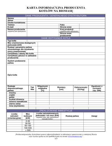 KARTA INFORMACYJNA PRODUCENTA KOTŁÓW NA BIOMASĘ