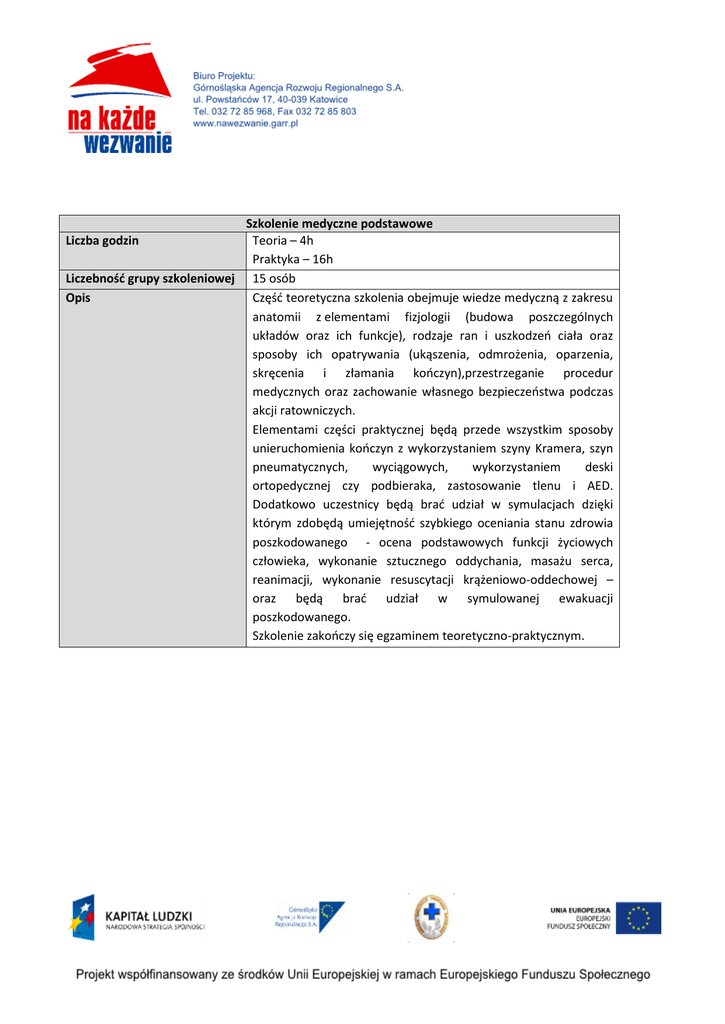 Szkolenie medyczne podstawowe Liczba godzin Teoria – 4h Praktyka – 16h Liczebnośd grupy szkoleniowej 15 osób Opis Częśd teoretyczna szkolenia obejmuje wiedze medyczną z zakresu anatomii z elementami fizjologii (budowa poszczególnych układów oraz ich funkcje), rodzaje ran i uszkodzeo ciała oraz sposoby ich opatrywania (ukąszenia, odmrożenia, oparzenia, skręcenia i złamania kooczyn),przestrzeganie procedur medycznych oraz zachowanie własnego bezpieczeostwa podczas akcji ratowniczych. Elementami części praktycznej będą przede wszystkim sposoby unieruchomienia kooczyn z wykorzystaniem szyny Kramera, szyn pneumatycznych, wyciągowych, wykorzystaniem deski ortopedycznej czy podbieraka, zastosowanie tlenu i AED. Dodatkowo uczestnicy będą brad udział w symulacjach dzięki którym zdobędą umiejętnośd szybkiego oceniania stanu zdrowia poszkodowanego - ocena podstawowych funkcji życiowych człowieka, wykonanie sztucznego oddychania, masażu serca, reanimacji, wykonanie resuscytacji krążeniowo-oddechowej – oraz będą brad udział w symulowanej ewakuacji poszkodowanego. Szkolenie zakooczy się egzaminem teoretyczno-praktycznym.