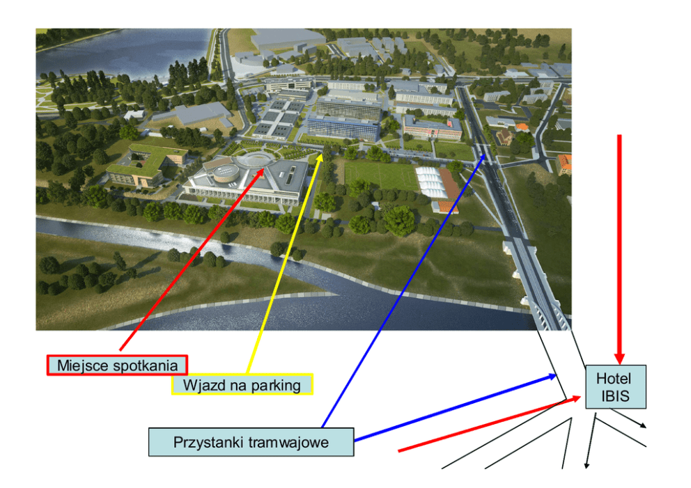 Miejsce spotkania Wjazd na parking Przystanki tramwajowe Hotel IBIS