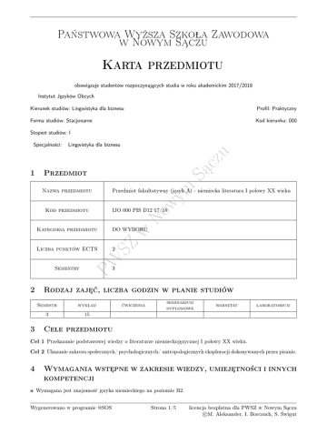 Państwowa Wyższa Szkola Zawodowa w Nowym Sa˛czu Karta przedmiotu obowia˛zuje studentów rozpoczynaja˛cych studia w roku akademickim 2017/2018 Instytut Je˛zyków Obcych Kierunek studiów: Lingwistyka dla biznesu Profil: Praktyczny Forma studiów: Stacjonarne Kod kierunku: 000 Stopień studiów: I IJO 000 PIS D12 17/18 Kategoria przedmiotu DO WYBORU Liczba punktów ECTS SZ Kod przedmiotu 3 PW 2 3 Semestry 2 Przedmiot fakultatywny (je˛zyk A) - niemiecka literatura I polowy XX wieku No wy Nazwa przedmiotu m Przedmiot w 1 Lingwistyka dla biznesu Sa˛ cz u Specjalności: Rodzaj zaje˛ć, liczba godzin w planie studiów Semestr wyklad 3 15 ćwiczenia seminarium dyplomowe warsztat laboratorium Cele przedmiotu Cel 1 Przekazanie podstawowej wiedzy o literaturze niemieckoje˛zycznej I polowy XX wieku. Cel 2 Ukazanie zakresu spolecznych/ psychologicznych/ antropologicznych eksploracji dokonywanych przez pisanie. 4 Wymagania wste˛pne w zakresie wiedzy, umieje˛tności i innych kompetencji a Wymagana jest znajomość je˛zyka niemieckiego na poziomie B2. Wygenerowano w programie @SOS Strona 1/5 licencja bezplatna dla PWSZ w Nowym Sa˛czu c M. Aleksander, I. Borczuch, S. Świgut Państwowa Wyższa Szkola Zawodowa w Nowym Sa˛czu Efekty ksztalcenia 5 EK1 Wiedza: Student ma uporza˛dkowana˛ wiedze˛ z zakresu historii literatury niemieckiego obszaru je˛zykowego I polowy XX wieku. EK2 Umieje˛tności: Student analizuje niemieckoje˛zyczny tekst literacki weryfikuja˛c go w kontekście spolecznym, historycznym i kulturowym. EK3 Umieje˛tności: Student potrafi merytorycznie argumentować z wykorzystaniem pogla˛dów innych autorów. EK4 Kompetencje spoleczne: Student rozumie potrzebe˛ i perspektywy dalszego rozwoju i ksztalcenia zawodowego oraz podnoszenia swoich kompetencji zarówno w kontekście lingwistycznym jak i spolecznym. Treści programowe W3 W4 W5 W6 7 Sa˛ cz u m No wy W2 w W1 SZ Lp wyklad Tematyka zaje˛ć Opis szczególowy bloków tematycznych Jednostka a spoleczeństwo: literatura niemieckoje˛zyczna okresu impresjonizmu i ekspresjonizmu. Ukazanie miejsca i roli jednostki wobec spoleczeństwa (m.in. Hofmannsthal, Rilke, Benn). Szczególna rola artysty (twórczość Tomasza Manna, Hesse, Musil), analiza mechanizmów spolecznych we wczesnej twórczości Bertolta Brechta. Analiza zachowań ludzkich (m.in. Arthur Schnitzler). I wojna światowa w literaturze niemieckoje˛zycznej. Postawy polityczne pisarzy (m.in. spór Tomasza i Henryka Mannów), artystyczne wizje wojny, antropologiczne konteksty wojny i literatury, ekspresjonizm i budowanie nowego czlowieka (Werfel, Toller). Literatura zaangażowana wobec Hitlera i III Rzeszy. Emigracja pisarska z Niemiec, emigracja wewne˛trzna, literatura faszystowska, ”uwiedzenie” totalitaryzmem (m.in. Benn). Polityka kulturalna w III Rzeszy. Późniejsza twórczość Bertolta Brechta. Wielcy niezrozumiani: m.in. Franz Kafka, Robert Musil, Hermann Hesse. Antropologiczno-filozoficzne eksploracje literackie, wa˛tki religijne w twórczości, kreowanie wlasnych wizji świata. Filozofia a literatura. Koncepcje i wplyw Nietzschego na literature˛ niemieckoje˛zyczna˛ I polowy XX wieku. Dilthey i Schopenhauer i ich obecność w literaturze niemieckiego obszaru je˛zykowego. Nauka a literatura. Wplyw odkryć naukowych na literature˛ i ich literacka realizacja, m.in. zasada niepewności Heisenberga, teoria wzgle˛dności Einsteina i teoria psychoanalityczna Freuda. Razem PW 6 Liczba godzin 3 3 3 2 2 2 15 Metody dydaktyczne M1 Wyklady M2 Slowne objaśnienie M3 Prezentacje multimedialne Wygenerowano w programie @SOS Strona 2/5 licencja bezplatna dla PWSZ w Nowym Sa˛czu c M. Aleksander, I. Borczuch, S. Świgut Państwowa Wyższa Szkola Zawodowa w Nowym Sa˛czu 8 Obcia˛żenie praca˛ studenta Średnia liczba godzin na zrealizowanie aktywności Forma aktywności 9 Sa˛ cz u Godziny kontaktowe z nauczycielem akademickim, w tym: Godziny wynikaja˛ce z planu studiów 15 Konsultacje przedmiotowe 5 Egzaminy i zaliczenia w sesji 2 Godziny bez udzialu nauczyciela akademickiego wynikaja˛ce z nakladu pracy studenta, w tym: Przygotowanie sie˛ do zaje˛ć, w tym studiowanie zalecanej literatury 20 Opracowanie wyników 8 Przygotowanie raportu, projektu, prezentacji, dyskusji 0 Sumaryczna liczba godzin dla przedmiotu wynikaja˛ca z 50 calego nakladu pracy studenta Sumaryczna liczba punktów ECTS dla przedmiotu 2 Sposoby oceny Ocena formuja˛ca No wy m F1 Egzamin Ocena aktywności bez udzialu nauczyciela akademickiego 1 Test w Kryteria oceny Na ocene˛ 4 Na ocene˛ 5 Na ocene˛ 3 Student zna zjawiska literackie w literaturze niemieckoje˛zycznej I polowy XX wieku, potrafi wymienić autorów i dziela. Student posluguje sie˛ nazwiskami, tytulami, datami. Omawia zjawiska literackie w literaturze niemieckoje˛zycznej I polowy XX wieku. Student bezble˛dnie posluguje sie˛ nazwiskami, tytulami, datami. Omawia zjawiska literackie w literaturze niemieckoje˛zycznej I polowy XX wieku. Potrafi logicznie wskazywać na zależności mie˛dzy zjawiskami, autorami, dzielami. Dyskutuje o tych zjawiskach. Efekt ksztalcenia 2 PW Na ocene˛ 3 SZ Efekt ksztalcenia 1 Student potrafi odczytać tekst literacki niemieckoje˛zyczny i wskazać tematyke˛ oraz glówne wa˛tki. Wygenerowano w programie @SOS Miejsce weryfikacji Opis weryfikacji EK 1 wyklad Egzamin, test Miejsce weryfikacji Opis weryfikacji EK 2 wyklad Egzamin, test Strona 3/5 licencja bezplatna dla PWSZ w Nowym Sa˛czu c M. Aleksander, I. Borczuch, S. Świgut Państwowa Wyższa Szkola Zawodowa w Nowym Sa˛czu wyklad Egzamin pogla˛dy Student potrafi przytoczyć i wykorzystać w argumentowaniu pogla˛dy autorów literackich. Student potrafi dyskutować i argumentować plynnie, używaja˛c pogla˛dów innych autorów. Efekt ksztalcenia 4 Student poprawnie ocenia zakres posiadanej wiedzy i umieje˛tności; uzupelnia wyste˛puja˛ce braki wiedzy. Student prawidlowo ocenia zakres posiadanej wiedzy i umieje˛tności; rozumie potrze