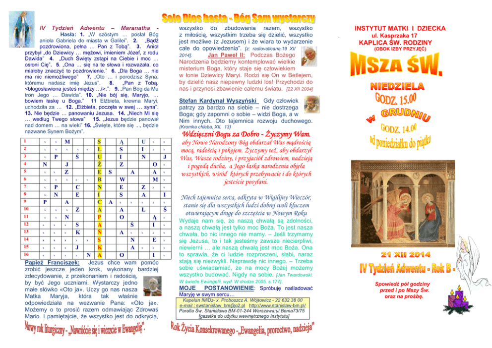 IV Tydzień Adwentu – Maranatha - Hasła: 1. „W szóstym … posłał Bóg anioła Gabriela do miasta w Galilei”. 2. „Bądź pozdrowiona, pełna … Pan z Tobą”. 3. Anioł przybył „do Dziewicy … mężowi, imieniem Józef, z rodu Dawida” 4. „Duch Święty zstąpi na Ciebie i moc … osłoni Cię”. 5. „Ona … się na te słowa i rozważała, co miałoby znaczyć to pozdrowienie.” 6. „Dla Boga … nie ma nic niemożliwego” 7. „Oto … i porodzisz Syna, któremu nadasz imię Jezus”. 8. „Pan z Tobą, <błogosławiona jesteś między …i>.”. 9. „Pan Bóg da Mu tron Jego … Dawida”. 10. „Nie bój się, Maryjo, … bowiem łaskę u Boga.” 11 Elżbieta, krewna Maryi, uchodziła za … 12. „Elżbieta, poczęła w swej … syna”. 13. Nie będzie … panowaniu Jezusa. 14. „Niech Mi się … według Twego słowa” 15. „Jezus będzie panował nad domem … na wieki” 16. „Święte, które się ..., będzie nazwane Synem Bożym”. x S Ą U x 2 x x x x x x x Ł S I 3 x P Ś U I N J 4 N J Ż Z O x 5 x x Z E S A A x 6 x x x x x B W M x 7 x x P C N E Z x 8 x N E I S A I 9 x x x x P A C A x 10 x x x Z A A Ł Ś 11 x x N P O Ą x 12 x x x S A Ś I x 13 x x x x x x K Ń A x 14 x x x x x S N E x 15 x x x x x J K A x 16 x x x x N A O I x Papież Franciszek: Jezus chce wam pomóc zrobić jeszcze jeden krok, wykonany bardziej zdecydowanie, z przekonaniem i radością, by być Jego uczniami. Wystarczy jedno małe słówko «Oto ja». Uczy go nas nasza Matka Maryja, która tak właśnie odpowiedziała na wezwanie Pana: «Oto ja». Możemy o to prosić razem odmawiając Zdrowaś Mario. I pamiętajcie, że wszystko jest do odkrycia, 1 x x M wszystko do zbudowania razem, wszystko z miłością, wszystkim trzeba się dzielić, wszystko jest możliwe (z Jezusem) i że wiara to wydarzenie całe do opowiedzenia”. [z: radiovaticana.19 XII 2014]. Jan Paweł II: Podczas Bożego Narodzenia będziemy kontemplować wielkie misterium Boga, który staje się człowiekiem w łonie Dziewicy Maryi. Rodzi się On w Betlejem, by dzielić nasz niepewny ludzki los! Przychodzi do nas i przynosi zbawienie całemu światu. [22 XII 2004] INSTYTUT MATKI I DZIECKA . ul. Kasprzaka 17 KAPLICA ŚW. RODZINY (OBOK IZBY PRZYJĘĆ) Stefan Kardynał Wyszyński Gdy człowiek patrzy za bardzo na siebie – nie dostrzega Boga; gdy zapomni o sobie – widzi Boga, a w Nim innych. Oto tajemnica rozwoju duchowego. (Kromka chleba, XII, 13) Wdzięczni Bogu za Dobro - Życzymy Wam, aby Nowo Narodzony Bóg obdarzał Was mądrością mocą, radością i pokojem. Życzymy też, aby obdarzył Was, Wasze rodziny, i przyjaciół zdrowiem, nadzieją i pogodą ducha, a Jego łaska narodzenia objęła wszystkich, wśród których przebywacie i do których jesteście posyłani. Niech tajemnica serca, odkryta w Wigilijny Wieczór, stanie się dla wszystkich ludzi dobrej woli kluczem otwierającym drogę do szczęścia w Nowym Roku Wydaje nam się, że naszą chwałą są zdolności, a naszą chwałą jest tylko moc Boża. To jest nasza chwała, bo nic innego nie mamy. – Jeśli trzymamy się Jezusa, to i tak jesteśmy zawsze niecierpliwi, niewierni … ale naszą chwałą jest moc Boża. Ona to sprawia, że ci ludzie rozproszeni, słabi, naraz stają się niezwykli. Naprawdę nic innego. – Trzeba sobie uświadamiać, że na mocy Bożej możemy wszystko budować. Nigdy na sobie. [Jan Twardowski, W świetle Ewangelii, wyd. W drodze 2005. s.177]. MOJE POSTANOWIENIE: Spróbuję naśladować Maryję w swym sercu… Kapelan IMiDz- x. Proboszcz A. Wójtowicz - 22 632 38 00 e-mail : [email protected] http://www.stanislaw-bm.pl/ Parafia Św. Stanisława BM-01-244 Warszawa;ul.Bema73/75 [gazetka do użytku wewnętrznego Instytutu] Spowiedź pół godziny przed i po Mszy Św. oraz na prośbę. Oto ja służebnica Pańska, niech mi się stanie według twego słowa. (Łk 1, 38) Łk 1,26-38 W szóstym miesiącu posłał Bóg anioła Gabriela do miasta w Galilei, zwanego Nazaret, do Dziewicy poślubionej mężowi, imieniem Józef, z rodu Dawida; a Dziewicy było na imię Maryja. Anioł wszedł do Niej i rzekł: Bądź pozdrowiona, pełna łaski, Pan z Tobą, <błogosławiona jesteś między niewiastami>. Ona zmieszała się na te słowa i rozważała, co miałoby znaczyć to pozdrowienie. Lecz anioł rzekł do Niej: Nie bój się, Maryjo, znalazłaś bowiem łaskę u Boga. Oto poczniesz i porodzisz Syna, któremu nadasz imię Jezus. Będzie On wielki i będzie nazwany Synem Najwyższego, a Pan Bóg da Mu tron Jego praojca, Dawida. Będzie panował nad domem Jakuba na wieki, a Jego panowaniu nie będzie końca. Na to Maryja rzekła do anioła: Jakże się to stanie, skoro nie znam męża? Anioł Jej odpowiedział: Duch Święty zstąpi na Ciebie i moc Najwyższego osłoni Cię. Dlatego też Święte, które się narodzi, będzie nazwane Synem Bożym. A oto również krewna Twoja, Elżbieta, poczęła w swej starości syna i jest już w szóstym miesiącu ta, która uchodzi za niepłodną. Dla Boga bowiem nie ma nic niemożliwego. Na to rzekła Maryja: Oto Ja służebnica Pańska, niech Mi się stanie według twego słowa! Wtedy odszedł od Niej anioł. Podobnie jak król Dawid pragniemy zbudować Bogu świątynię. Żeby było wiadomo, gdzie jest, gdzie Go można znaleźć. Świątynię piękną i trwałą, na miarę naszych możliwości i naszego wyobrażenia o wielkości Boga. Budujemy ją z najbardziej wzniosłych pojęć, subtelnych poruszeń serca, tkamy misterne zasłony definicji. Tu będziesz, mówimy do Boga, i na chwilę czujemy się bezpiecznie. Ale Bóg się wymyka, nie może usiedzieć na miejscu. Jest wszędzie. „Z nami”. Człowiek, który doświadcza dziś wielu niepokojów, pragnie poszukiwać dróg pokoju i miłości, które mają swe źródło w Bogu. Nową nadzieję przynoszą słowa Jana Pawła II: „Pokój jest możliwy”. MODLITWA WIERNYCH - Módlmy się 1. - za Ojca świętego Franciszka, bisk