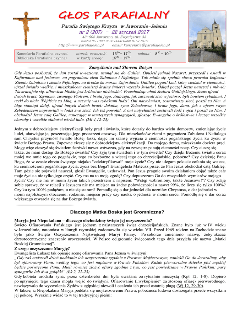 GŁOS PARAFIALNY Parafia Świętego Krzyża w Jaworznie-Jeleniu nr 2 (207) - 22 styczeń 2017 43-608 Jaworzno, ul. Zwycięstwa 33 konto: 95 1020 2528 0000 0502 0157 8137 http://www.parafiajelen.pl Kancelaria Parafialna czynna: Biblioteka Parafialna czynna: wtorek, czwartek: w każdą środę: email: [email protected] 30 00 15 – 17 30 00 15 – 17 sobota: 8 30 – 10 00 Zamyślenia nad Słowem Bożym Gdy Jezus posłyszał, że Jan został uwięziony, usunął się do Galilei. Opuścił jednak Nazaret, przyszedł i osiadł w Kafarnaum nad jeziorem, na pograniczu ziem Zabulona i Neftalego. Tak miało się spełnić słowo proroka Izajasza: 'Ziemia Zabulona i ziemia Neftalego, na drodze ku morzu, Zajordanie, Galilea pogan! Lud, który siedział w ciemności, ujrzał światło wielkie, i mieszkańcom cienistej krainy śmierci wzeszło światło'. Odtąd począł Jezus nauczać i mówić: 'Nawracajcie się, albowiem bliskie jest królestwo niebieskie'. Przechodząc obok Jeziora Galilejskiego, Jezus ujrzał dwóch braci: Szymona, zwanego Piotrem, i brata jego, Andrzeja, jak zarzucali sieć w jezioro; byli bowiem rybakami. I rzekł do nich: 'Pójdźcie za Mną, a uczynię was rybakami ludzi'. Oni natychmiast, zostawiwszy sieci, poszli za Nim. A idąc stamtąd dalej, ujrzał innych dwóch braci: Jakuba, syna Zebedeusza, i brata jego, Jana, jak z ojcem swym Zebedeuszem naprawiali w łodzi swe sieci. Ich też powołał. A oni natychmiast zostawili łódź i ojca i poszli za Nim. I obchodził Jezus całą Galileę, nauczając w tamtejszych synagogach, głosząc Ewangelię o królestwie i lecząc wszelkie choroby i wszelkie słabości wśród ludu. (Mt 4,12-23) Jednym z dobrodziejstw elektryfikacji były prąd i światło, które dotarły do bardzo wielu domostw, zmieniając życie ludzi, ułatwiając je, poszerzając jego przestrzeń czasową. Dla mieszkańców ziemi z pogranicza Zabulona i Neftalego sam Chrystus przyniósł światło Bożej łaski, dając im szansę wyjścia z ciemności pogańskiego życia ku życiu w świetle Bożego Prawa. Zapewne cieszę się z dobrodziejstw elektryfikacji. Do mojego domu, mieszkania dociera prąd. Mogę więc cieszyć się światłem żarówki nawet wówczas, gdy na zewnątrz panują ciemności nocy. Czy cieszę się także, że mam dostęp do Bożego światła? Czy żyję tym światłem i w tym świetle? Czy dzięki Bożemu światłu coraz mniej we mnie tego co pogańskie, tego co bezbożne a więcej tego co chrześcijańskie, pobożne? Czy dziękuję Panu Bogu, że w czasie chrztu świętego niejako "zelektryfikował" moje życie? Czy nie ulegam pokusie cofania się wstecz, ku ciemnościom pogańskiego życia, życia bez Boga? Ewangelista Mateusz pisze, że Pan Jezus obchodził całą Galileę. Tam gdzie się pojawiał nauczał, głosił Ewangelię, uzdrawiał. Pan Jezus pragnie swoim działaniem objąć także całe moje życie a nie tylko jego część. Czy ma na to moją zgodę? Czy dopuszczam Go do wszystkich wymiarów mojego życia? Czy nie ma w moim życiu takich przestrzeni z napisem: "Wstęp wzbroniony, także Jezusowi!"? Czy zdaję sobie sprawę, że w relacji z Jezusem nie ma miejsca na żadne połowiczności a nawet 99%, że liczy się tylko 100%? Czy ku tym 100% podążam, o nie się staram? Pomodlę się o dar jedności dla uczniów Chrystusa, o dar jedności w moim najbliższym otoczeniu: rodzinie, miejscu pracy czy nauki, o jedność w moim sercu. Pomodlę się o dar coraz większego otwarcia się na dar Bożego światła. Dlaczego Matka Boska jest Gromniczna? Maryja jest Niepokalana – dlaczego obchodzimy święto jej oczyszczenia? Święto Ofiarowania Pańskiego jest jednym z najstarszych świąt chrześcijańskich. Znane było już w IV wieku w Jerozolimie, natomiast w liturgii rzymskiej zadomowiło się w wieku VII. Przed 1969 rokiem na Zachodzie znane było jako Święto Oczyszczenia Najświętszej Maryi Panny. Po soborze zmieniono nazwę, żeby ukazać chrystocentryczne znaczenie uroczystości. W Polsce od gromnic święconych tego dnia przyjęła się nazwa „Matki Boskiej Gromnicznej”. Z czego oczyszczono Maryję? Ewangelista Łukasz tak opisuje scenę ofiarowania Pana Jezusa w świątyni: „Gdy zaś nadszedł dzień poddania ich oczyszczeniu zgodnie z Prawem Mojżeszowym, zanieśli Go do Jerozolimy, aby był ofiarowany Panu, według tego, co jest napisane w Prawie Pańskim: Każde pierworodne dziecko płci męskiej będzie poświęcone Panu. Mieli również złożyć ofiarę zgodnie z tym, co jest powiedziane w Prawie Pańskim: parę synogarlic lub dwa gołąbki” (Łk 2, 22-23). Gdy kobieta urodziła syna, przez czterdzieści dni była uważana za rytualnie nieczystą (Kpł 12, 1-8). Dopiero po upłynięciu tego czasu mogła wejść do świątyni. Ofiarowanie („wykupienie” za złożoną ofiarę) pierworodnego, nawiązywało do wyzwolenia Żydów z egipskiej niewoli i ocalenia ich przed ostatnią plagą (Wj 12, 29-30). W fakcie, iż Niepokalana Maryja poddała się mojżeszowemu Prawu, pobożność ludowa dostrzegała przede wszystkim jej pokorę. Wyraźnie widać to w tej tradycyjnej pieśni: Czystsza nad słońce oczyszczenia czeka, Idąc w poczet z grzesznemi; Lubo jest Matką Boga i Człowieka, Panią nieba, ziemi: Z Mojżeszowego wyjęta prawa, Przecież na wywód w kościele stawa, Wraz z niewiastami innemi. Będąc bez grzechu idzie na ofiarę, Z pokorą do wywodu; Kładzie na ołtarz synogarlic parę, Na okup Swego Płodu: Niesie na ręku Matka jedyna Swego i oraz Boskiego Syna, Zbawcę ludzkiego narodu. Zwycięża pychę Maryi pokora, Wyniosłość bierze w pęta; Gdy oczyszczenie ta przyjmuje, która Bez zmazy jest poczęta: Dała nam przykład Królowa nieba, Jak się w pokorze ćwiczyć potrzeba; Więc zgiń hardości przeklęta. Szczęśliwy Symeon i miecz boleści Symeon pod natchnieniem Ducha wypowiada wobec Maryi słowa, które przygotują ją na specjalny udział w odkupieńczej misji Syna: „Oto Ten prze