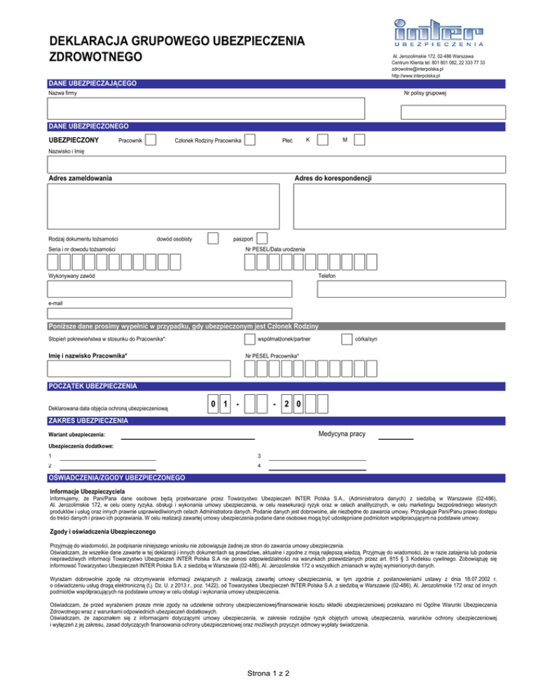 DEKLARACJA GRUPOWEGO UBEZPIECZENIA ZDROWOTNEGO Al. Jerozolimskie 172, 02-486 Warszawa Centrum Klienta tel. 801 801 082, 22 333 77 33 [email protected] http://www.interpolska.pl DANE UBEZPIECZAJĄCEGO Nazwa firmy Nr polisy grupowej DANE UBEZPIECZONEGO UBEZPIECZONY Pracownik Członek Rodziny Pracownika K Płeć M Nazwisko i Imię Adres zameldowania Rodzaj dokumentu tożsamości Adres do korespondencji dowód osobisty paszport Seria i nr dowodu tożsamości Nr PESEL/Data urodzenia Wykonywany zawód Telefon e-mail Poniższe dane prosimy wypełnić w przypadku, gdy ubezpieczonym jest Członek Rodziny Stopień pokrewieństwa w stosunku do Pracownika*: współmałżonek/partner Imię i nazwisko Pracownika* córka/syn Nr PESEL Pracownika* POCZĄTEK UBEZPIECZENIA Deklarowana data objęcia ochroną ubezpieczeniową 0 1 - - 2 0 ZAKRES UBEZPIECZENIA Medycyna pracy Wariant ubezpieczenia: Ubezpieczenia dodatkowe: 1 3 2 4 OŚWIADCZENIA/ZGODY UBEZPIECZONEGO Informacje Ubezpieczyciela Informujemy, że Pani/Pana dane osobowe będą przetwarzane przez Towarzystwo Ubezpieczeń INTER Polska S.A., (Administratora danych) z siedzibą w Warszawie (02-486), Al. Jerozolimskie 172, w celu oceny ryzyka, obsługi i wykonania umowy ubezpieczenia, w celu reasekuracji ryzyk oraz w celach analitycznych, w celu marketingu bezpośredniego własnych produktów i usług oraz innych prawnie usprawiedliwionych celach Administratora danych. Podanie danych jest dobrowolne, ale niezbędne do zawarcia umowy. Przysługuje Pani/Panu prawo dostępu do treści danych i prawo ich poprawiania. W celu realizacji zawartej umowy ubezpieczenia podane dane osobowe mogą być udostępniane podmiotom współpracującym na podstawie umowy. Zgody i oświadczenia Ubezpieczonego Przyjmuję do wiadomości, że podpisanie niniejszego wniosku nie zobowiązuje żadnej ze stron do zawarcia umowy ubezpieczenia. Oświadczam, że wszelkie dane zawarte w tej deklaracji i innych dokumentach są prawdziwe, aktualne i zgodne z moją najlepszą wiedzą. Przyjmuję do wiadomości, że w razie zatajenia lub podania nieprawdziwych informacji Towarzystwo Ubezpieczeń INTER Polska S.A nie ponosi odpowiedzialności na warunkach przewidzianych przez art. 815 § 3 Kodeksu cywilnego. Zobowiązuję się informować Towarzystwo Ubezpieczeń INTER Polska S.A. z siedzibą w Warszawie (02-486), Al. Jerozolimskie 172 o wszystkich zmianach w wyżej wymienionych danych. Wyrażam dobrowolnie zgodę na otrzymywanie informacji związanych z realizacją zawartej umowy ubezpieczenia, w tym zgodnie z postanowieniami ustawy z dnia 18.07.2002 r. o oświadczeniu usług drogą elektroniczną (t.j. Dz. U. z 2013 r., poz. 1422), od Towarzystwa Ubezpieczeń INTER Polska S.A. z siedzibą w Warszawie (02-486), Al. Jerozolimskie 172 oraz od innych podmiotów współpracujących na podstawie umowy w celu obsługi i wykonania umowy ubezpieczenia. Oświadczam, że przed wyrażeniem przeze mnie zgody na udzielenie ochrony ubezpieczeniowej/finansowanie kosztu składki ubezpieczeniowej przekazano mi Ogólne Warunki Ubezpieczenia Zdrowotnego wraz z warunkami odpowiednich ubezpieczeń dodatkowych. Oświadczam, że zapoznałem się z informacjami dotyczącymi umowy ubezpieczenia, w zakresie rodzajów ryzyk objętych umową ubezpieczenia, warunków ochrony ubezpieczeniowej i wyłączeń z jej zakresu, zasad dotyczących finansowania ochrony ubezpieczeniowej oraz możliwych przyczyn odmowy wypłaty świadczenia. Strona 1 z 2 i wyłączeń z jej zakresu, zasad dotyczących finansowania ochrony ubezpieczeniowej oraz możliwych przyczyn odmowy wypłaty świadczenia. Oświadczenia Ubezpieczonego o zwolnieniu z zachowania tajemnicy lekarskiej Zwalniam lekarzy, lekarzy dentystów oraz inne osoby wykonujące zawód medyczny z obowiązku zachowania tajemnicy lekarskiej, również w przypadku mojej śmierci oraz upoważniam je, aby udzieliły Towarzystwu Ubezpieczeń INTER Polska S.A., Al. Jerozolimskie 172, wymaganych informacji dotyczących stanu mojego zdrowia, nałogów oraz procesu leczenia, w szczególności w celu weryfikacji informacji podanych w deklaracji zgody na przystąpienie do grupowego ubezpieczenia (ocena ryzyka) i innych dokumentach oraz weryfikacji dokumentów wniesionych w celu realizacji świadczenia (podstawa prawna: art. 40 ust. 2 pkt. 4 ustawy z dnia 5 grudnia 1996 r., o zawodzie lekarza i lekarza dentysty (t.j. Dz. U. z 2015 r., poz. 464). Wyrażam również dobrowolnie zgodę na weryfikację przez Towarzystwo Ubezpieczeń INTER Polska S.A. z siedzibą w Warszawie (02-486), Al. Jerozolimskie 172, wniesionych przeze mnie dokumentów (rachunki, zwolnienia i zaświadczenia lekarskie, karty choroby itp.) oraz dokumentów wydawanych przez placówki medyczne i osoby wykonujące zawód medyczny w celu oceny ryzyka i realizacji świadczenia. Wyrażam dobrowolnie zgodę na udostępnienie Towarzystwu Ubezpieczeń INTER Polska S.A. z siedzibą w Warszawie (02-486), Al. Jerozolimskie 172 przez podmioty udzielające świadczeń zdrowotnych dokumentacji medycznej dotyczącej mojego stanu zdrowia, zgodnie z art. 26 ust. 3 pkt 7 ustawy z dnia 6 listopada 2008 r. o prawach pacjenta i Rzeczniku Praw Pacjenta (t.j. Dz. U. 2012, poz. 159), w celu weryfikacji informacji podanych we wniosku i innych dokumentach przed zawarciem umowy ubezpieczenia oraz w celu ustalenia prawa do świadczenia i jego wysokości. Wyrażam dobrowolnie zgodę na uzyskiwanie przez Towarzystwo Ubezpieczeń INTER Polska z siedzibą w Warszawie (02-486), Al. Jerozolimskie 172 od Narodowego Funduszu Zdrowia, danych o nazwach i adresach świadczeniodawców, którzy udzielali mi świadczeń opieki zdrowotnej w związku z wypadkiem lub zdarzeniem losowym będącym podstawą ustalenia odpowiedzialności Towarzystwa oraz wysokości odszkodowania lub świadczenia. Zgody Ubezpieczonego Wyrażam dobrowolnie zgodę na udostępnianie moich danych osobowych Towarzystwu Ubezpieczeń INTER-ŻYCIE Polska S.A. z siedzibą w Warszawie (02-486), Al. Jer