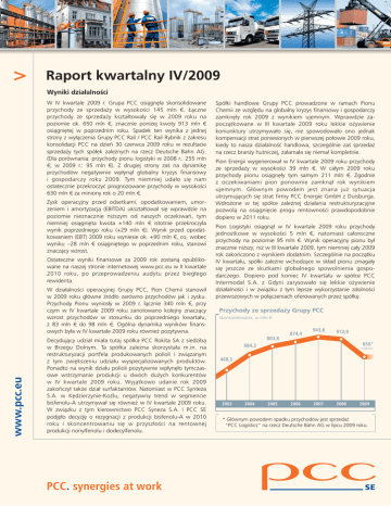 > Raport kwartalny IV/2009 Wyniki działalności W IV kwartale 2009 r. Grupa PCC osiągnęła skonsolidowane przychody ze sprzedaży w wysokości 145 mln €. Łączne przychody ze sprzedaży kształtowały się w 2009 roku na poziomie ok. 650 mln €, znacznie poniżej kwoty 913 mln € osiągniętej w poprzednim roku. Spadek ten wynika z jednej strony z wyłączenia Grupy PCC Rail / PCC Rail Rybnik z zakresu konsolidacji PCC na dzień 30 czerwca 2009 roku w rezultacie sprzedaży tych spółek zależnych na rzecz Deutsche Bahn AG. (Dla porównania: przychody pionu logistyki w 2008 r.: 255 mln €; w 2009 r.: 95 mln €). Z drugiej strony zaś na dynamikę przychodów negatywnie wpłynął globalny kryzys finansowy i gospodarczy roku 2009. Tym niemniej udało się nam ostatecznie przekroczyć prognozowane przychody w wysokości 630 mln € za miniony rok o 20 mln €. Zysk operacyjny przed odsetkami, opodatkowaniem, umorzeniem i amortyzacją (EBITDA) ukształtował się wprawdzie na poziomie nieznacznie niższym od naszych oczekiwań, tym niemniej osiągnięta kwota +140 mln € istotnie przekroczyła wynik poprzedniego roku (+29 mln €). Wynik przed opodatkowaniem (EBT) 2009 roku wyniesie ok. +90 mln €, co, wobec wyniku –28 mln € osiągniętego w poprzednim roku, stanowi znaczący wzrost. Ostateczne wyniki finansowe za 2009 rok zostaną opublikowane na naszej stronie internetowej www.pcc.eu w II kwartale 2010 roku , po przeprowadzeniu audytu przez biegłego rewidenta. www.pcc.eu W działalności operacyjnej Grupy PCC, Pion Chemii stanowił w 2009 roku główne źródło zarówno przychodów jak i zysku. Przychody Pionu wyniosły w 2009 r. łącznie 340 mln €, przy czym w IV kwartale 2009 roku zanotowano kolejny znaczący wzrost przychodów w stosunku do poprzedniego kwartału, z 83 mln € do 98 mln €. Ogólna dynamika wyników finansowych była w IV kwartale 2009 roku również pozytywna. Decydujący udział miała tutaj spółka PCC Rokita SA z siedzibą w Brzegu Dolnym. Ta spółka zależna skorzystała m.in. na restrukturyzacji portfela produkowanych polioli i związanym z tym zwiększeniu udziału wyspecjalizowanych produktów. Ponadto na wynik działu polioli pozytywnie wpłynęło tymczasowe wstrzymanie produkcji u dwóch dużych konkurentów w IV kwartale 2009 roku. Wyjątkowo udan ie rok 2009 zakończył także dział surfaktantów. Natomiast w PCC Synteza S.A. w Kędzierzynie-Koźlu, negatywny trend w segmencie bisfenolu-A utrzymywał się również w IV kwartale 2009 roku. W związku z tym kierownictwo PCC Syneza S.A. i PCC SE podjęło decyzję o rezygnacji z produkcji bisfenolu-A w 2010 roku i skoncentrowaniu się w przyszłości na rentownej produkcji nonylfenolu i dodecylfenolu. PCC. synergies at work Spółki handlowe Grupy PCC prowadzone w ramach Pionu Chemii ze względu na globalny kryzys finansowy i gospodarczy zamknęły rok 2009 z wynikiem ujemnym. Wprawdzie zapoczątkowane w III kwartale 2009 roku lekkie ożywienie koniunktury utrzymywało się, nie spowodowało ono jednak kompensacji strat poniesionych w pierwszej połowie 2009 roku, kiedy to nasza działalność handlowa, szczególnie zaś sprzedaż na rzecz branży hutniczej, załamała się niemal kompletnie. Pion Energii wygenerował w IV kwartale 2009 roku przychody ze sprzedaży w wysokości 39 mln €. W całym 2009 roku przychody pionu osiągnęły tym samym 211 mln €. Zgodnie z oczekiwaniami pion ponownie zamknął rok wynikiem ujemnym. Głównym powodem jest znana już sytuacja utrzymujących się strat firmy PCC Energie GmbH z Duisburga. Wdrożone w tej spółce zależnej działania restrukturyzacyjne pozwolą na osiągnięcie progu rentowności prawdopodobnie dopiero w 2011 roku. Pion Logistyki osiągnął w IV kwartale 2009 roku przychody jednostkowe w wysokości 5 mln €, natomiast całoroczne przychody na poziomie 95 mln €. Wynik operacyjny pionu był znacznie niższy, niż w III kwartale 2009, tym niemniej cały 2009 rok zakończono z wynikiem dodatnim. Szczególnie na początku IV kwartału, spółki zależne wchodzące w skład pionu zmagały się jeszcze ze skutkami globalnego spowolnienia gospo darczego. Dopiero pod koniec IV kwartału w spółce PCC Intermodal S.A. z Gdyni zarysowało się lekkie ożywienie działalności i w związku z tym lepsze wykorzystanie zdolności przewozowych w połączeniach oferowanych przez spółkę. Przychody ze sprzedaży Grupy PCC skonsolidowane, w mln € 803,8 874,4 943,8 913,0 650* 684,3 prognoza 468,5 2003 2004 2005 2006 2007 2008 2009 * Głównym powodem spadku przychodów jest sprzedaż “PCC Logistics” na rzecz Deutsche Bahn AG w lipcu 2009 roku. SE > Raport kwartalny IV/2009 Udany debiut giełdowy PCC Intermodal S.A., spółki zależnej PCC, w Warszawie PCC Exol S.A., spółka zależna PCC, wyemituje 7,5 proc. certyfikat udziału w zysku Debiut giełdowy pierwszej ze spółek PCC, polskiej PCC Intermodal S.A., nastąpił 18 grudnia 2009 roku poprzez pierwsze notowanie akcji spółki na Giełdzie Papierów Wartościowych w Warszawie (GPW). Sprzedaż wszystkich 6,7 mln oferowanych akcji zakończyła się sukcesem. Cena emisyjna wyniosła 3 PLN (ok. 0,7 €). Wartość emisji wyniosła łącznie 20,3 mln PLN (ok. 4,8 mln EUR), co odpowiada 10% udziału w podwyższonym kapitale zakładowym. PCC Exol S.A., polska spółka zależna PCC, wyemituje 7,5 proc. certyfikat udziału w zysku o wartości nominalnej 1.000.000 €. W Płocku, ok. 100 km na północny zachód od Warszawy, spółka buduje obecnie nowoczesną wytwórnię etoksylatów o zdolności produkcyjnej 30.000 ton surfaktantów niejonowych - tzw. etoksylatów, półproduktów do wytwarzania chemii gospodarczej i kosmetyków. Oddanie wytwórni do użytku przewidywane jest na koniec 2010 roku. Na zamknięciu pierwszej sesji za akcje płacono 3,15 PLN, czyli 5 proc. powyżej ceny emisyjnej. Aktualny kurs akcji PCC Intermodal jest dostępny na stronach internetowych Giełdy Papierów W
