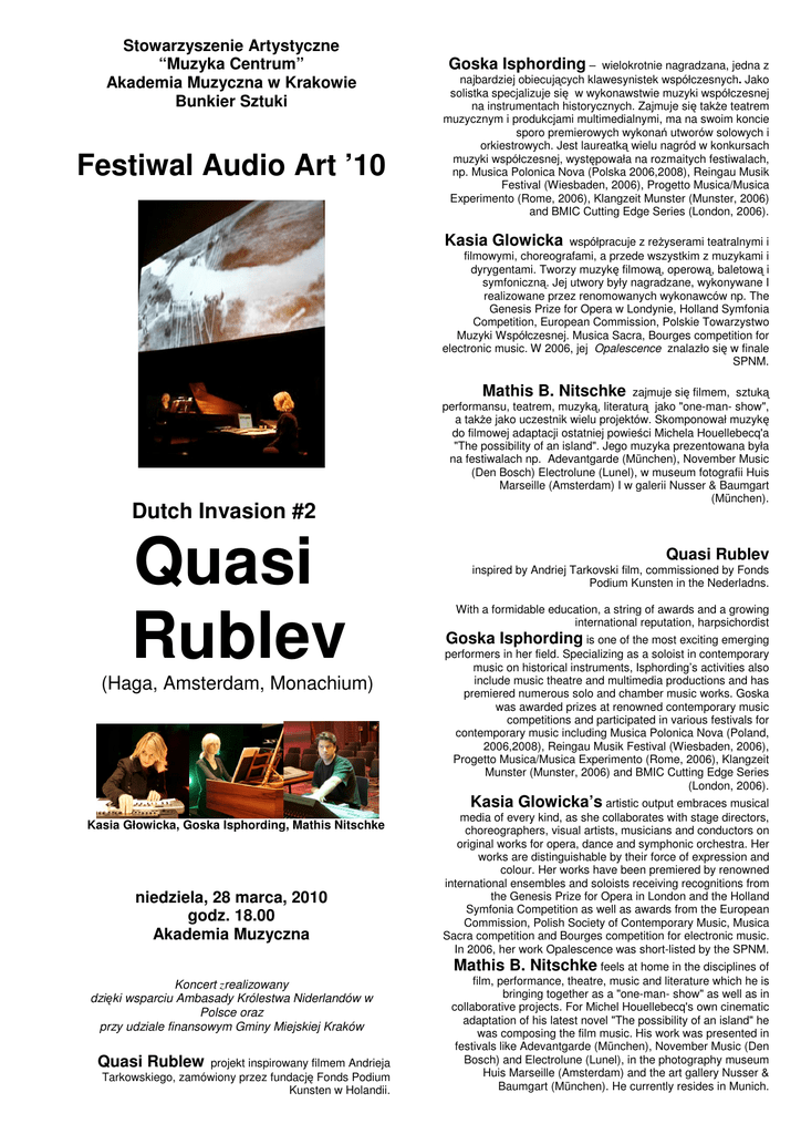 Stowarzyszenie Artystyczne “Muzyka Centrum” Akademia Muzyczna w Krakowie Bunkier Sztuki Festiwal Audio Art ’10 Goska Isphording – wielokrotnie nagradzana, jedna z najbardziej obiecujących klawesynistek współczesnych. Jako solistka specjalizuje się w wykonawstwie muzyki współczesnej na instrumentach historycznych. Zajmuje się także teatrem muzycznym i produkcjami multimedialnymi, ma na swoim koncie sporo premierowych wykonań utworów solowych i orkiestrowych. Jest laureatką wielu nagród w konkursach muzyki współczesnej, występowała na rozmaitych festiwalach, np. Musica Polonica Nova (Polska 2006,2008), Reingau Musik Festival (Wiesbaden, 2006), Progetto Musica/Musica Experimento (Rome, 2006), Klangzeit Munster (Munster, 2006) and BMIC Cutting Edge Series (London, 2006). Kasia Glowicka współpracuje z reżyserami teatralnymi i filmowymi, choreografami, a przede wszystkim z muzykami i dyrygentami. Tworzy muzykę filmową, operową, baletową i symfoniczną. Jej utwory były nagradzane, wykonywane I realizowane przez renomowanych wykonawców np. The Genesis Prize for Opera w Londynie, Holland Symfonia Competition, European Commission, Polskie Towarzystwo Muzyki Współczesnej. Musica Sacra, Bourges competition for electronic music. W 2006, jej Opalescence znalazło się w finale SPNM. Dutch Invasion #2 Quasi Rublev (Haga, Amsterdam, Monachium) Kasia Głowicka, Goska Isphording, Mathis Nitschke niedziela, 28 marca, 2010 godz. 18.00 Akademia Muzyczna Mathis B. Nitschke zajmuje się filmem, sztuką performansu, teatrem, muzyką, literaturą jako "one-man- show", a także jako uczestnik wielu projektów. Skomponował muzykę do filmowej adaptacji ostatniej powieści Michela Houellebecq'a "The possibility of an island". Jego muzyka prezentowana była na festiwalach np. Adevantgarde (München), November Music (Den Bosch) Electrolune (Lunel), w museum fotografii Huis Marseille (Amsterdam) I w galerii Nusser & Baumgart (München). Quasi Rublev inspired by Andriej Tarkovski film, commissioned by Fonds Podium Kunsten in the Nederladns. With a formidable education, a string of awards and a growing international reputation, harpsichordist Goska Isphording is one of the most exciting emerging performers in her field. Specializing as a soloist in contemporary music on historical instruments, Isphording’s activities also include music theatre and multimedia productions and has premiered numerous solo and chamber music works. Goska was awarded prizes at renowned contemporary music competitions and participated in various festivals for contemporary music including Musica Polonica Nova (Poland, 2006,2008), Reingau Musik Festival (Wiesbaden, 2006), Progetto Musica/Musica Experimento (Rome, 2006), Klangzeit Munster (Munster, 2006) and BMIC Cutting Edge Series (London, 2006). Kasia Glowicka’s artistic output embraces musical media of every kind, as she collaborates with stage directors, choreographers, visual artists, musicians and conductors on original works for opera, dance and symphonic orchestra. Her works are distinguishable by their force of expression and colour. Her works have been premiered by renowned international ensembles and soloists receiving recognitions from the Genesis Prize for Opera in London and the Holland Symfonia Competition as well as awards from the European Commission, Polish Society of Contemporary Music, Musica Sacra competition and Bourges competition for electronic music. In 2006, her work Opalescence was short-listed by the SPNM. Mathis B. Nitschke feels at home in the disciplines of Koncert zrealizowany dzięki wsparciu Ambasady Królestwa Niderlandów w Polsce oraz przy udziale finansowym Gminy Miejskiej Kraków Quasi Rublew projekt inspirowany filmem Andrieja Tarkowskiego, zamówiony przez fundację Fonds Podium Kunsten w Holandii. film, performance, theatre, music and literature which he is bringing together as a "one-man- show" as well as in collaborative projects. For Michel Houellebecq's own cinematic adaptation of his latest novel "The possibility of an island" he was composing the film music. His work was presented in festivals like Adevantgarde (München), November Music (Den Bosch) and Electrolune (Lunel), in the photography museum Huis Marseille (Amsterdam) and the art gallery Nusser & Baumgart (München). He currently resides in Munich.