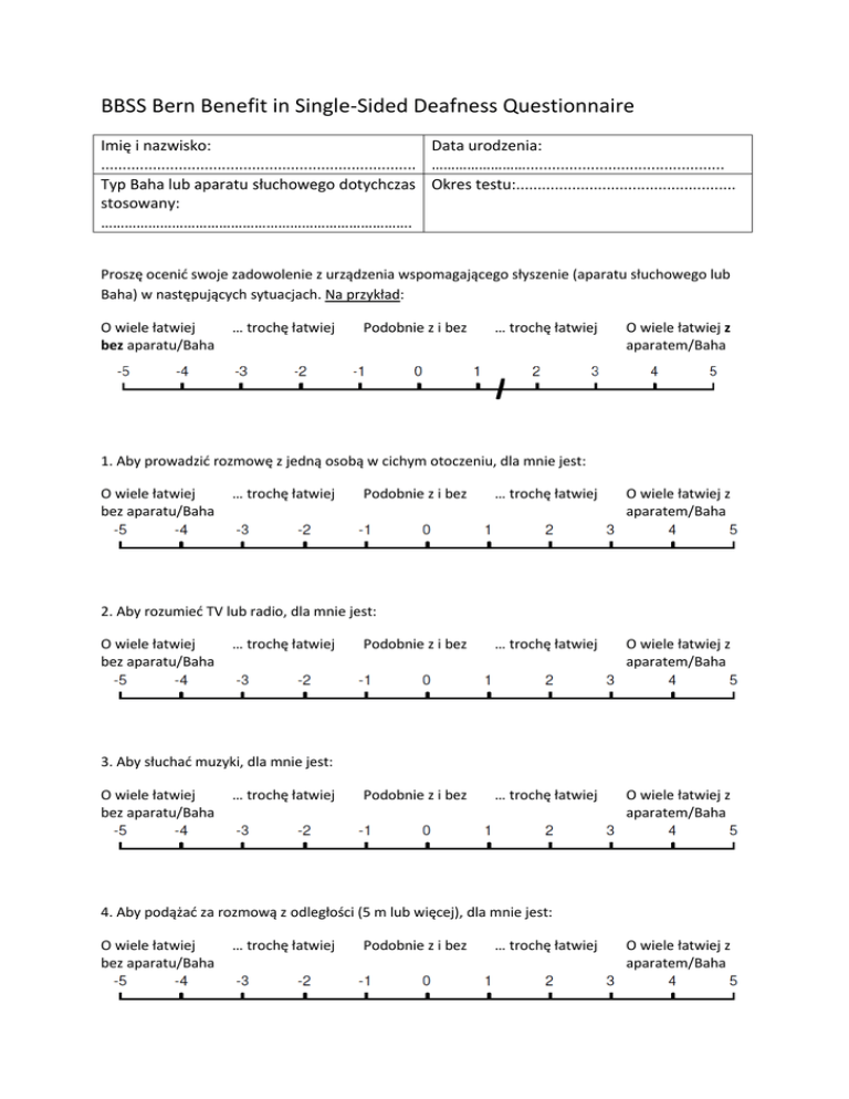 BBSS Bern Benefit in Single-Sided Deafness Questionnaire Imię i nazwisko: Data urodzenia: ......................................................................... …………………….............................................. Typ Baha lub aparatu słuchowego dotychczas Okres testu:................................................... stosowany: ……………………………………………………………………. Proszę ocenid swoje zadowolenie z urządzenia wspomagającego słyszenie (aparatu słuchowego lub Baha) w następujących sytuacjach. Na przykład: O wiele łatwiej bez aparatu/Baha … trochę łatwiej Podobnie z i bez … trochę łatwiej O wiele łatwiej z aparatem/Baha 1. Aby prowadzid rozmowę z jedną osobą w cichym otoczeniu, dla mnie jest: O wiele łatwiej bez aparatu/Baha … trochę łatwiej Podobnie z i bez … trochę łatwiej O wiele łatwiej z aparatem/Baha Podobnie z i bez … trochę łatwiej O wiele łatwiej z aparatem/Baha Podobnie z i bez … trochę łatwiej O wiele łatwiej z aparatem/Baha 2. Aby rozumied TV lub radio, dla mnie jest: O wiele łatwiej bez aparatu/Baha … trochę łatwiej 3. Aby słuchad muzyki, dla mnie jest: O wiele łatwiej bez aparatu/Baha … trochę łatwiej 4. Aby podążad za rozmową z odległości (5 m lub więcej), dla mnie jest: O wiele łatwiej bez aparatu/Baha … trochę łatwiej Podobnie z i bez … trochę łatwiej O wiele łatwiej z aparatem/Baha 5. Aby podążad za rozmową z hałasem w tle, dla mnie jest: O wiele łatwiej bez aparatu/Baha … trochę łatwiej Podobnie z i bez … trochę łatwiej O wiele łatwiej z aparatem/Baha 6. Aby rozmawiad podczas prowadzenia samochodu, dla mnie jest: O wiele łatwiej bez aparatu/Baha … trochę łatwiej Podobnie z i bez … trochę łatwiej O wiele łatwiej z aparatem/Baha 7. Aby rozumied mowę w pokoju z pogłosem, tj. duża hala wejściowa lub kościół, dla mnie jest: O wiele łatwiej bez aparatu/Baha … trochę łatwiej Podobnie z i bez … trochę łatwiej O wiele łatwiej z aparatem/Baha 8. Aby uczestniczyd w rozmowie w grupie 3 lub więcej rozmówców, dla mnie jest: O wiele łatwiej bez aparatu/Baha … trochę łatwiej Podobnie z i bez … trochę łatwiej O wiele łatwiej z aparatem/Baha 9. Aby zlokalizowad źródło dźwięku, takie jak trąbiący samochód, dla mnie jest: O wiele łatwiej bez aparatu/Baha … trochę łatwiej Podobnie z i bez … trochę łatwiej O wiele łatwiej z aparatem/Baha Podobnie z i bez … trochę łatwiej O wiele łatwiej z aparatem/Baha 10. Ogólnie, dla mnie jest: O wiele łatwiej bez aparatu/Baha … trochę łatwiej Źródło: Kompis M, Pfiffner F, Krebs M, Caversaccio M. Factors Influencing the Decision for Baha in Unilateral Deafness: The Bern Benefit in Single Sided Deafness questionnaire. Adv Otorhinolaryngol 71 (2011)
