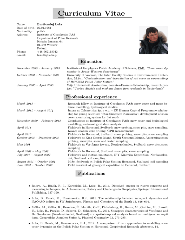 Curriculum Vitaeyj Name: Date of birth: Nationality: Address: Phone: e-mail: Bartłomiej Luks 27.04.1981 polish Institute of Geophysics PAS Department of Polar Research Księcia Janusza 64 01-452 Warsaw Poland +48 662118042 [email protected] Educationyj November 2005 – January 2013 October 2000 – November 2005 January 2005 – April 2005 Institute of Geophysics Polish Academy of Sciences, PhD, ”Snow cover dynamics in South–Western Spitsbergen” University of Warsaw, The Inter Faculty Studies in Environmental Protection, M.Sc., ”Contamination and degradiation of soil cover in surroundings of Hornsund Polish Polar Station” Vrije Universiteit Amsterdam, Socrates-Erasmus Scholarship, research project ”Carbon dioxide and methane fluxes from wetlands in Netherlands” Professional experienceyj March 2013 – March 2014 – August 2014 November 2009 – February 2013 April 2011 April 2010 October 2008 – December 2008 May 2008 April 2008 – May 2008 July 2007 – August 2007 August 2004 – October 2004 June 2002 – October 2002 Research fellow at Institute of Geophysics PAS: snow cover and mass balance modelling, hydrological studies Intern at Telemetrica Sp. z o.o. – EU Human Capital Programme scholarship for young scientists ”Staż Sukcesem Naukowca”: development of snow cover monitoring system for flat roofs Geophysicist at Institute of Geophysics PAS: snow cover and hydrological modelling, meteorological data analysis Fieldwork in Hornsund, Svalbard: snow probing, snow pits, snow sampling, Kovacs shallow core drilling, GPR measurements Fieldwork in Hornsund, Svalbard: snow probing, snow pits, snow sampling Fieldwork at King George Island, South Shetland Islands, Antarctica: snow probing, snowpits, snow and water sampling Fieldwork at Vestfonna ice cap, Nordaustlandet, Svalbard: snow pits, snow sampling Fieldwork in Hornsund, Svalbard: snow pits, snow sampling Fieldwork and station maintance, IPY Kinnvika Expedition, Nordaustlandet, Svalbard: soil sampling M.Sc. fieldwork at Polish Polar Station Hornsund, Svalbard: soil sampling Field assistant at geological expedition to Bellsund, Svalbard Publicationsyj • Rajwa, A., Bialik, R. J., Karpiński, M., Luks, B., 2014. Dissolved oxygen in rivers: concepts and measuring techniques, in: Achievements, History and Challenges in Geophysics, Springer International Publishing, 337–350. • Luks, B., Osuch, M., Romanowicz, R.J., 2011. The relationship between snowpack dynamics and NAO/AO indices in SW Spitsbergen, Physics and Chemistry of the Earth 13, 646–654. • Möller, M., Möller, R., Beaudon, É., Mattila, O.-P., Finkelnburg, R., Braun, M., Grabiec, M., Jonsell, U., Luks, B., Puczko, D., Scherer, D., Schneider, C., 2011. Snowpack characteristics of Vestfonna and De Geerfonna (Nordaustlandet, Svalbard) - a spatiotemporal analysis based on multiyear snow-pit data, Geografiska Annaler: Series A, Physical Geography 93, 273–285. • Luks, B. Osuch, M., Romanowicz, R.J., 2012. A comparison of two approaches to modelling snow cover dynamics at the Polish Polar Station at Hornsund. Geophysical Research Abstracts, 14. Projectsyj • Research Council of Norway SSF Strategic Grant „Snow Monitoring using Automatic Camera Systems at Svalbard key sites – SMACS” • NCBiR/PolarCLIMATE-2009/2-2/2010 „Sensitivity of Svalbard glacier to climate change - SVALGLAC” • IGF grant for young researchers no. 500-10-15 „Uwarunkowania hydrodynamiczne i geomorfologiczne natlenienia rzek i transportu tlenu rozpuszczonego w systemie rzecznym” • Iuventus Plus grant „Struktura turbulencji oraz rozkład prędkości średniej przepływu nad dennymi formami rzecznymi: eksperymenty środowiskowe w zastosowaniach do analizy transportu sedymentu” • Ministry of Science and Higher Education grant no. N N306 787940 „Dynamika procesów akumulacji i ablacji pokrywy śnieżnej” • Ministry of Science and Higher Education IPY grant no. 111/IPY/2007/01 „Zmienność wybranych elementów środowiska polarnego w Atlantyckim sektorze Arktyki określana na podstawie badań prowadzonych w trzech stacjach bazowych oraz na wybranych obszarach Svalbardu w okresie pomiędzy 3 MRG 1957–1958 a 4 MRP 2007–2009 – KINNVIKA” • Ministry of Science and Higher Education IPY grant no. 1173/IPY/2007/01/2 „Wpływ zanieczyszczeń gazowych i pyłowych w troposferze na skład chemiczny opadów atmosferycznych i zmiany klimatu w Arktyce i Antarktyce – POLARCAT”
