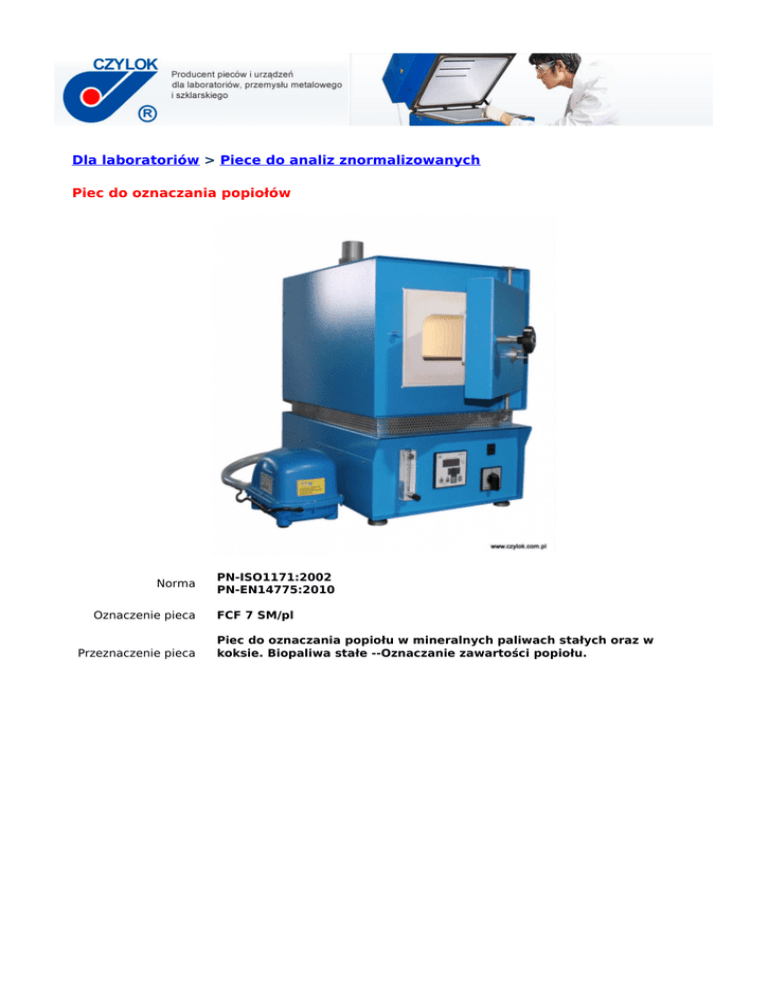 Dla laboratoriów > Piece do analiz znormalizowanych Piec do oznaczania popiołów Norma Oznaczenie pieca Przeznaczenie pieca PN-ISO1171:2002 PN-EN14775:2010 FCF 7 SM/pl Piec do oznaczania popiołu w mineralnych paliwach stałych oraz w koksie. Biopaliwa stałe --Oznaczanie zawartości popiołu. Piec muflowy FCF 7 SMpl przeznaczony jest do oznaczania popiołu w mineralnych paliwach stałych oraz w koksie. Spełnia on wymagania normy PN-ISO 1 1 71 :2002. W piecu badana próbkę ogrzewa się w atmosferze powietrza z okresloną szybkością do temperatury 81 5°C +/- 10°C w warunkach 5-10 krotnej wymiany atmosfery komory na minutę, ilość powietrza jest ściśle określona przez rotametr. Piec wyposażony jest w pompę powietrza, rotametr tablicowy (85 l/min; 0 bar – powietrze) z zaworem do pomiaru i wyregulowania właściwego przepływu powietrza przez komorę. Czyste powietrze może być wprowadzane do komory z dowolnego źródła. Firma Czylok preferuje dmuchawę membranowa dostarczona z piecem. Piec spełnia również wymagania normy PN-EN 14775 luty 2010. Biopaliwa stałe --Oznaczanie zawartości popiołu. M-PROGRAMATOR TEMPERATURY Jeden czteroznakowy i dwa pojedyncze wyświetlacze umożliwiają łatwy odczyt temperatury rzeczywistej obiektu i parametrów zadanych. Dzięki możliwości zaprogramowania czasu opóźnionego startu jak również czasu wygrzewania, tzn.utrzymania temperatury pieca przez określony czas, możliwe jest automatyczne przeprowadzenie cyklu wypału bez nadzoru. Daje to możliwość pracy np. w czasie obowiązywania taryfy nocnej na energię elektryczną lub wcześniejsze nagrzanie pieca do wymaganej temperatury unikając niepotrzebnych przestojów w pracy. Posiada możliwość programowania czasu (czyli szybkości) dojścia do zadanej temperatury. Cechuje się możliwością zaprogramowania 10 etapów w każdym programie pracy, przy czym przez etap rozumie się temperaturę zadaną, czas dojścia do tej temperatury oraz czas wygrzewania w temperaturze zadanej. Umożliwia to kształtowanie dowolnej krzywej wypału dla danego urządzenia grzewczego ze zmiennymi odcinkami przyrostu lub opadania temperatury w czasie. Jeżeli masz pytania skontaktuj się z nami: tel. 32 47 07 495 tel./fax 32 47 07 502 e-mail: [email protected]